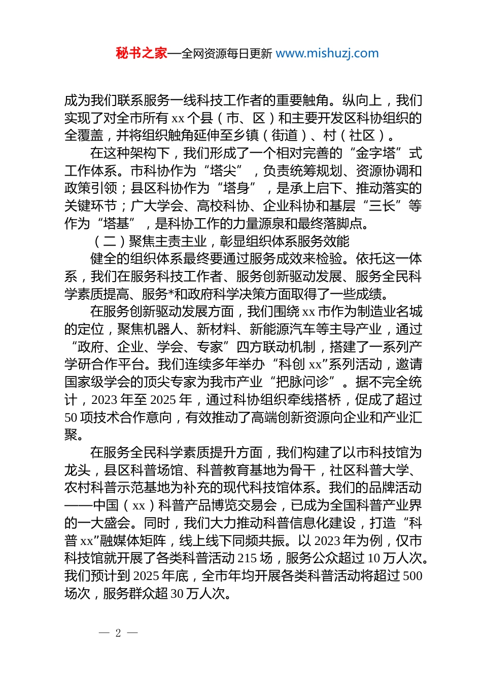 秘书之家—全网资源每日更新 www.mishuzj.com关于健全科协组织体系的交流发言尊敬的各位领导、各位同仁:大家上午好!非常荣幸能够参加这次中国科协举办的培训班,与来自全国各地的科协同仁们一起学习交流。这既是一次宝贵的“充电”机会,也是一个难得的“取经”平台。今天,我想围绕“健全科协组织体系”这一主题,结合我们 xx 市科协近年来的一些实践与思考,向各位领导和同仁作一个汇报,不当之处,恳请大家批评指正。我发言的题目是《固本强基纵横联动着力构建新时代科协组织发展新格局》。主要从四个方面展开:一、xx 市科协组织建设的实践与探索科协是*和政府联系科技工作者的桥梁和纽带,其组织体系的健全程度,直接决定了其履职效能和服务能力。近年来,xx市科协紧紧围绕“四服务”职责定位,坚持以组织建设为根本,初步构建起一个覆盖广泛、运转有序的组织网络体系。(一)夯实“四梁八柱”,构建立体化组织架构我们深刻认识到,一个坚强有力的组织架构是科协事业发展的“顶梁柱”。为此,我们着力构建了“一体两翼、纵横贯通”的立体化组织体系。“一体”是指做强市科协本级。我们于 2025 年 4 月成功召开了第十届委员会第二次全体会议,选举产生了新一届领导班子,明确了未来五年的发展方向。目前,市科协内设普及部、学会部、办公室(组宣部)等职能部门,并直管市科技馆,形成了一个权责清晰、运转高效的领导核心和执行中枢。“两翼”是指强化横向和纵向联系。横向上,我们大力加强市级学会建设,涵盖了理、工、农、医及交叉学科等多个领域,— 1 —秘书之家—全网资源每日更新 www.mishuzj.com成为我们联系服务一线科技工作者的重要触角。纵向上,我们实现了对全市所有 xx 个县(市、区)和主要开发区科协组织的全覆盖,并将组织触角延伸至乡镇(街道)、村(社区)。在这种架构下,我们形成了一个相对完善的“金字塔”式工作体系。市科协作为“塔尖”,负责统筹规划、资源协调和政策引领;县区科协作为“塔身”,是承上启下、推动落实的关键环节;广大学会、高校科协、企业科协和基层“三长”等作为“塔基”,是科协工作的力量源泉和最终落脚点。(二)聚焦主责主业,彰显组织体系服务效能健全的组织体系最终要通过服务成效来检验。依托这一体系,我们在服务科技工作者、服务创新驱动发展、服务全民科学素质提高、服务*和政府科学决策方面取得了一些成绩。在服务创新驱动发展方面,我们围绕 xx 市作为制造业名城的定位,聚焦机器人、新材料、新能源汽车等主导产业,通过“政府、企业、学会、专家”四方联动机制,搭建了一系列产学研合作平台。我们连续多年举办“科创 xx”系列活动,邀请国家级学会的顶尖专家为我市产业“把脉问诊”。据不完全统计,2023 年至 2025 年,通过科协组织牵线搭桥,促成了超过50 项技术合作意向,有效推动了高端创新资源向企业和产业汇聚。在服务全民科学素质提升方面,我们构建了以市科技馆为龙头,县区科普场馆、科普教育基地为骨干,社区科普大学、农村科普示范基地为补充的现代科技馆体系。我们的品牌活动——中国(xx)科普产品博览交易会,已成为全国科普产业界的一大盛会。同时,我们大力推动科普信息化建设,打造“科普 xx”融媒体矩阵,线上线下同频共振。以 2023 年为例,仅市科技馆就开展了各类科普活动 215 场,服务公众超过 10 万人次。我们预计到 2025 年底,全市年均开展各类科普活动将超过 500场次,服务群众超 30 万人次。— 2 —秘书之家—全网资源每日更新 www.mishuzj.com在服务科技工作者方面,我们坚持“哪里有科技工作者,科协工作就做到哪里”。我们建立了领导干部联系走访专家制度,定期开展“最美科技工作者”评选和宣传活动,营造崇尚创新的社会氛围。我们还积极探索为科技人才“搭台架梯”,通过举办青年科学家论坛、支持青年科技人才项目等方式,为他们的成长成才提供支持。在服务科学决策方面,我们着力打造“科协智库”品牌。依托市级学会和专家库资源,我们围绕市委市政府中心工作,组织开展了一系列专题调研和战略咨询活动,形成了一批高质量的决策咨询报告,其中...