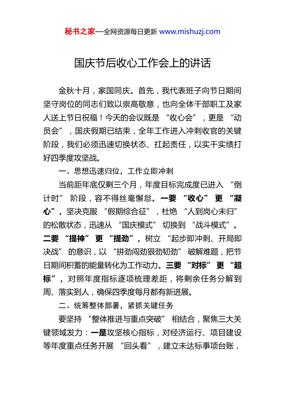 秘书之家—全网资源每日更新 www.mishuzj.com国庆节后收心工作会上的讲话金秋十月,家国同庆。首先,我代表班子向节日期间坚守岗位的同志们致以崇高敬意,也向全体干部职工及家人送上节日祝福!今天的会议既是 “收心会”,更是 “动员会”,国庆假期已结束,全年工作进入冲刺收官的关键阶段,我们必须迅速切换状态、扛起责任,以实干实绩打好四季度攻坚战。一、思想迅速归位,工作立即冲刺当前距年底仅剩三个月,年度目标完成度已进入 “倒计时” 阶段,容不得丝毫懈怠。一要 “收心” 更 “凝心”,坚决克服 “假期综合征”,杜绝 “人到岗心未归”的松散状态,迅速从 “国庆模式” 切换到 “战斗模式”。二要 “提神” 更 “提劲”,树立 “起步即冲刺、开局即决战” 的意识,以 “拼劲闯劲狠劲韧劲” 破解难题,把节日期间积蓄的能量转化为工作动力。三要 “对标” 更 “超标”,对照年度指标逐项梳理差距,将剩余任务分解到周、落实到人,确保四季度每月都有新进展。二、统筹整体部署,紧抓关键任务要坚持 “整体推进与重点突破” 相结合,聚焦三大关键领域发力:一是攻坚核心指标,对经济运行、项目建设等年度重点任务开展 “回头看”,建立未达标事项台账,秘书之家—全网资源每日更新 www.mishuzj.com实行清单化管理、节点化推进。二是抓实民生实事,重点推进教育医疗、养老保障等惠民项目,对照 “群众可感可及” 标准查漏补缺,确保承诺兑现。三是谋划来年工作,在推进当前任务的同时,提前调研梳理下年度重点项目、改革举措,为 “十五五” 开局蓄势赋能。各部门要打破壁垒、协同作战,形成 “一盘棋” 工作格局。三、严守工作纪律,提升工作效率纪律是干事创业的保障,效率是冲刺攻坚的关键。一要严明纪律规矩,班子成员、中层干部要带头遵守考勤制度、会议纪律,坚决杜绝迟到早退、擅离职守等现象,纪检部门要开展不定期督查。二要优化工作作风,推行“严、实、快、新” 四字准则:标准上从严、落实上务实、节奏上提速、方法上创新,以流程优化减少内耗。三要强化责任担当,对分管工作主动认领、对难点问题靠前攻坚,杜绝 “推诿扯皮、敷衍塞责”,确保每项工作有人抓、有人管、有成效。四、保障安全生产,维护社会稳定始终牢记 “群众过节,干部过关” 的理念,以 “一失万无” 的警醒守住安全稳定底线。一是深化隐患排查,重点整治交通、消防、燃气、建筑施工等领域风险点,建立问题清单、责任清单、销号清单,实现 “闭环管理”。二是抓实社会治理,常态化开展矛盾纠纷排查化解,强化重点人员管控和网络舆情导控,确保社会面平稳有序。三是秘书之家—全网资源每日更新 www.mishuzj.com强化应急值守,严格执行 24 小时领导带班和专人值班制度,备足应急物资、完善处置预案,确保突发情况快速响应、妥善处置。同志们,“ 路虽远,行则将至;事虽难,做则必成”。四季度的冲锋号已经吹响,让我们以饱满的热情、务实的作风、昂扬的斗志,凝心聚力、加压奋进,确保全年目标圆满收官,为发展大局贡献更大力量!谢谢大家!