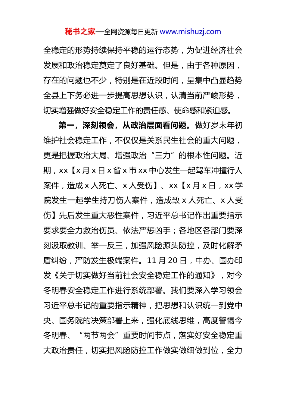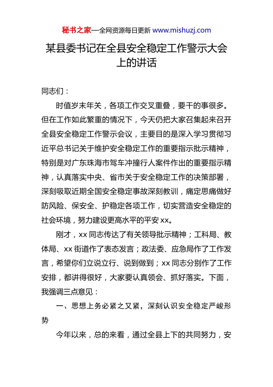 秘书之家—全网资源每日更新 www.mishuzj.com某县委书记在全县安全稳定工作警示大会上的讲话同志们:时值岁末年关,各项工作交叉重叠,要干的事很多。但在工作如此繁重的情况下,今天仍把大家召集起来召开全县安全稳定工作警示会议,主要目的是深入学习贯彻习近平总书记关于维护安全稳定工作的重要指示批示精神,特别是对广东珠海市驾车冲撞行人案件作出的重要指示精神,认真落实中央、省市关于安全稳定工作的决策部署,深刻吸取近期全国安全稳定事故深刻教训,痛定思痛做好防风险、保安全、护稳定各项工作,切实营造安全稳定的社会环境,努力建设更高水平的平安 xx。刚才,xx 同志传达了有关领导批示精神;工科局、教体局、xx 街道作了表态发言;政法委、应急局作了工作发言,希望你们立说立行、说到做到;xx 同志分别作了工作安排,都讲得很好,大家要认真领会、抓好落实。下面,我强调三点意见:一、思想上务必紧之又紧,深刻认识安全稳定严峻形势今年以来,总的来看,通过全县上下的共同努力,安秘书之家—全网资源每日更新 www.mishuzj.com全稳定的形势持续保持平稳的运行态势,为促进经济社会发展和政治稳定奠定了良好基础。但是,由于各种原因,存在的问题也不少,特别是在近段时间,呈集中凸显趋势全县上下务必进一步提高思想认识,认清当前严峻形势,切实增强做好安全稳定工作的责任感、使命感和紧迫感。第一,深刻领会,从政治层面看问题。做好岁末年初维护社会稳定工作,不仅仅是关系民生社会的重大问题,更是把握政治大局、增强政治“三力”的根本性问题。近期,xx【x 月 x 日 x 省 x 市 xx 中心发生一起驾车冲撞行人案件,造成 x 人死亡、x 人受伤】、xx【x 月 x 日,xx 学院发生一起学生持刀伤人案件,造成致 x 人死亡、x 人受伤】先后发生重大恶性案件,习近平总书记作出重要指示要求要全力救治伤员、依法严惩凶手;各地区各部门要深刻汲取教训、举一反三,加强风险源头防控,及时化解矛盾纠纷,严防发生极端案件。11 月 20 日,中办、国办印发《关于切实做好当前社会安全稳定工作的通知》,对今冬明春安全稳定工作进行系统部署。我们要深入学习领会习近平总书记的重要指示精神,把思想和认识统一到党中央、国务院的决策部署上来,强化底线思维,高度警惕今冬明春、“两节两会”重要时间节点,落实好安全稳定重大政治责任,切实把风险防控工作做实做细做到位,全力秘书之家—全网资源每日更新 www.mishuzj.com保障人民群众生命安全和社会稳定。第二,细致排查,从工作层面找漏洞。安全稳定工作从来都是“100-1=0”,而且往往容易产生蝴蝶效应和连锁反应。2023 年,我县前三季度发生 xx 起命案,但在 11月份接连发生 xx 起命案,全年累计发生 xx 起命案、xx 人死亡,导致我县被上级通报整治、xx 个乡镇被挂牌整治。同志们,我们要吃一堑长一智,今年决不能好了伤疤忘了痛。客观分析当前全县安全稳定工作,形势不容乐观:安全生产方面,3 月份,xx 石矿山发生一起安全事故,造成1 人死亡,导致矿山被市应急局责令停产整顿;前天下午,xx 煤矿又发生一起安全事故,造成 1 人死亡;目前我县取得安全生产许可证或安全审查批复的非煤矿山还有 30 座,可以说矿山安全风险非常大。此外,道路交通、建筑施工城镇燃气、消防、地质灾害等重点领域安全风险也不容忽视,必须引起高度警觉。矛盾化解方面,截至目前,全县累计排查矛盾纠纷 xx 件,化解 xx 件,还有 xx 件未能化解;县级信访 xx 批次 xx 人次,同比上升 x%、x%;重复信访xx 件 xx 人次,化解 xx 件,仍有 xx 件尚未化解。特别是昨天下午,xx 社区发生的一起 xx 中毒致 x 死 x 伤事件,初步排查系感情纠纷,说明我们在基层社会治理方面还存在较多漏洞、较大风险。社会治安方面,1 至 10 月,全县查秘书之家—全网资源每日更新 www.mishuzj.com处农村涉赌案件 xx 件、行政处罚 xx 人,同比上升 x%、x%;查处涉未成年人案件 x 起,案件数与去年同期相比呈上升趋势。加之我县债务风险较大,财政收支紧张,“两拖欠”治理和“六个清...