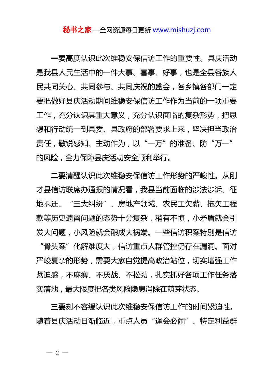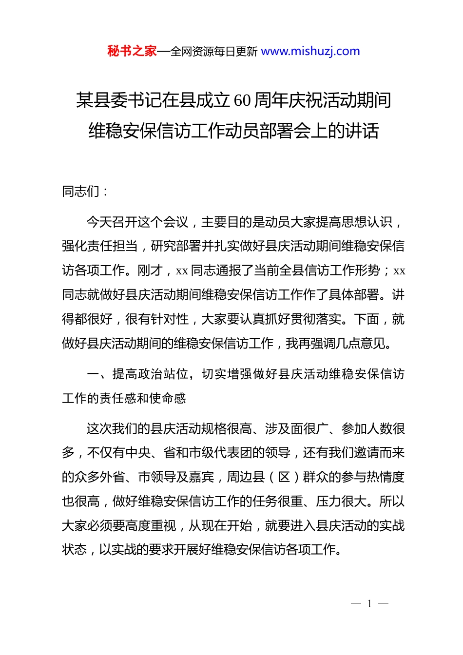 秘书之家—全网资源每日更新 www.mishuzj.com某县委书记在县成立 60 周年庆祝活动期间维稳安保信访工作动员部署会上的讲话同志们:今天召开这个会议,主要目的是动员大家提高思想认识,强化责任担当,研究部署并扎实做好县庆活动期间维稳安保信访各项工作。刚才,xx 同志通报了当前全县信访工作形势;xx同志就做好县庆活动期间维稳安保信访工作作了具体部署。讲得都很好,很有针对性,大家要认真抓好贯彻落实。下面,就做好县庆活动期间的维稳安保信访工作,我再强调几点意见。一、提高政治站位,切实增强做好县庆活动维稳安保信访工作的责任感和使命感这次我们的县庆活动规格很高、涉及面很广、参加人数很多,不仅有中央、省和市级代表团的领导,还有我们邀请而来的众多外省、市领导及嘉宾,周边县(区)群众的参与热情度也很高,做好维稳安保信访工作的任务很重、压力很大。所以大家必须要高度重视,从现在开始,就要进入县庆活动的实战状态,以实战的要求开展好维稳安保信访各项工作。— 1 —秘书之家—全网资源每日更新 www.mishuzj.com一要高度认识此次维稳安保信访工作的重要性。县庆活动是我县人民生活中的一件大事、喜事、好事,也是全县各族人民共同关心、共同参与、共同庆祝的盛会,各乡镇各部门一定要把做好县庆活动期间维稳安保信访工作作为当前的一项重要工作,充分认识其重大意义,充分认识面临的复杂形势,把思想和行动统一到县委、县政府的部署要求上来,坚决担当政治责任,敏锐感知、主动作为,以“一万”的准备、防“万一”的风险,全力保障县庆活动安全顺利举行。二要清醒认识此次维稳安保信访工作形势的严峻性。从刚才县信访联席办通报的情况看,我县当前面临的涉法涉诉、征地拆迁、“三大纠纷”、房地产领域、农民工欠薪、拖欠工程款等历史遗留问题的态势十分复杂,稍有不慎,小矛盾就会引发大问题,小风险就会酿成大祸端。一些信访积案特别是信访“骨头案”化解难度大,信访重点人群管控仍存在漏洞。面对严峻复杂的形势,需要大家自觉提高政治站位,切实增强工作紧迫感,不麻痹、不厌战、不松劲,扎实抓好各项工作任务落实落地,最大限度把各类风险隐患消除在萌芽状态。三要刻不容缓认识此次维稳安保信访工作的时间紧迫性。随着县庆活动日渐临近,重点人员“逢会必闹”、特定利益群— 2 —秘书之家—全网资源每日更新 www.mishuzj.com体“逢会必访”的特点会更加凸显,维护社会安全稳定工作面临的形势更加错综复杂、任务更加艰巨繁重。现在距离县庆活动的举办还有不到 xx 天的时间,在这段特殊时期,如果我们不认真研究落实应对措施,任何风险隐患都可能会变成现实危害。所以,我们一定要以过硬的政治意识,毫不含糊地承担起维稳安保信访工作的重大责任,坚决做到“五个不发生”工作目标。二、聚焦重点关键,为县庆活动顺利举办筑牢坚强有力的安全屏障实践一再证明,存在风险并不可怕,可怕的是没有意识到风险或者对存在的风险麻木不仁,对可以预料和难以预料的风险毫无准备,这才是最大的危险。全县各乡镇各部门要切实增强风险意识,树牢底线思维,强化责任担当,有效防范、化解、管控各类风险隐患。一要强化矛盾纠纷排查化解。当前我县社会大局总体和谐稳定,但是受一些复杂因素影响,各种不安全、不稳定、不确定的矛盾因素还大量存在,一些矛盾纠纷一旦处理不当,极有可能在县庆活动期间演变成大矛盾、大风险,甚至被别有用心之人放大炒作,形成舆论事件。要坚持和发展新时代“枫桥经验”,持续加强对征地拆迁、涉法涉诉、家庭邻里、房地产物— 3 —秘书之家—全网资源每日更新 www.mishuzj.com业、“三大纠纷”等社会矛盾纠纷的精准排查,特别是代表团住地、慰问点周边各类利益诉求人员的排查,并逐一登记造册。对摸排掌握的社会矛盾问题,要以“事要解决”为核心,按照“谁主管,谁负责”和“属地管理,分级负责”的原则,逐一明确并落实责任单位、责任领导、责任人以及化解时限,全力稳控化解。对一些重大、疑难、复杂矛盾问题,要采取领导包案等超常规措施,努力做到在县区活动举办前化解一批、管控一批、处理一批。二要强力扭转信访...