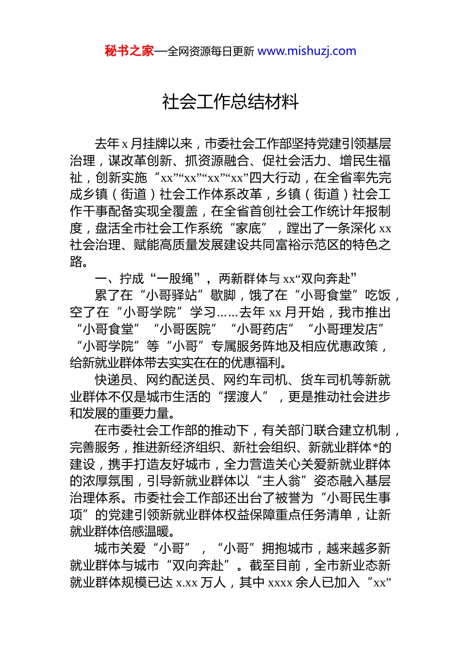 秘书之家—全网资源每日更新 www.mishuzj.com社会工作总结材料去年 x 月挂牌以来,市委社会工作部坚持党建引领基层治理,谋改革创新、抓资源融合、促社会活力、增民生福祉,创新实施“xx”“xx”“xx”“xx”四大行动,在全省率先完成乡镇(街道)社会工作体系改革,乡镇(街道)社会工作干事配备实现全覆盖,在全省首创社会工作统计年报制度,盘活全市社会工作系统“家底”,蹚出了一条深化 xx社会治理、赋能高质量发展建设共同富裕示范区的特色之路。一、拧成“一股绳”,两新群体与 xx“双向奔赴”累了在“小哥驿站”歇脚,饿了在“小哥食堂”吃饭,空了在“小哥学院”学习……去年 xx 月开始,我市推出“小哥食堂”“小哥医院”“小哥药店”“小哥理发店”“小哥学院”等“小哥”专属服务阵地及相应优惠政策,给新就业群体带去实实在在的优惠福利。快递员、网约配送员、网约车司机、货车司机等新就业群体不仅是城市生活的“摆渡人”,更是推动社会进步和发展的重要力量。在市委社会工作部的推动下,有关部门联合建立机制,完善服务,推进新经济组织、新社会组织、新就业群体*的建设,携手打造友好城市,全力营造关心关爱新就业群体的浓厚氛围,引导新就业群体以“主人翁”姿态融入基层治理体系。市委社会工作部还出台了被誉为“小哥民生事项”的党建引领新就业群体权益保障重点任务清单,让新就业群体倍感温暖。城市关爱“小哥”,“小哥”拥抱城市,越来越多新就业群体与城市“双向奔赴”。截至目前,全市新业态新就业群体规模已达 x.xx 万人,其中 xxxx 余人已加入“xx”秘书之家—全网资源每日更新 www.mishuzj.com应用程序。“xx”行动已开展关爱活动 xxx 余场,迭代升级xxx 家“小哥驿站”,打造“小哥食堂”等专属服务阵地 xx余个。更多两新群体也成了 xx 治理的“合伙人”。去年 x 月,xx 市委社会工作部牵头组建由注册会计师、高级会计师、税务师、律师、资产评估师、金融师等高端人才组成的“六师助企服务团”,一站式为企业解决“疑难杂症”,至今已累计帮助企业解决难题 xxxx 余个。点点星光聚成银河。全市 xx 个成员单位与 xx 个“三新”*组织开展党建联建,形成任务落实、统筹调度、评议评价工作闭环;“航行的支部”海上党建深化,构建粮食供应安全、保税船燃、“一条鱼”、贻贝养殖产业链供应链党建工作矩阵;“小哥议事会”入选全省新业态新就业群体党建工作政策工具和典型案例;在全省首创“舟新治理”应用,相关做法在全省专题会上作交流发言。二、重塑“一盘棋”,基层治理效能全面激发从平均每月走访群众 xx 余户到走访 xx 余户,xx 区 xx街道 xx 村*委书记 xxx 真切感受到,服务群众的时间变多了。xxx 的新感受得益于基层组织“滥挂牌”专项整治。“整治前,各类牌子多,确实加重了基层负担。”xxx 说,牌子挂上,增加的填报、统计和材料报送工作占用了村干部不少时间。去年上半年,我市开展基层组织“滥挂牌”专项整治工作。市委社会工作部全面排摸全市各村(社区)和网格梳理整治内容,明确整治标准和要求,与相关部门合力推进整治工作。xxx 说,目前村委会门口仅保留了“叉河村*委”“叉河村村民委员会”“叉河村股份经济合作社”“叉河村监督委员会”这 x 块牌子,以及“*群服务中心”“新时代文明实践站”等必要标识,群众办事更便利。在 xx 县 xx 镇 xx 村,群众房前屋后树木修剪已困扰村委会多年。去年,随着“三事分流”治理模式推行,村委秘书之家—全网资源每日更新 www.mishuzj.com会召集*员群众代表召开“民生议事会”,将困难群众家以及影响公共区域的“麻烦树”清理定性为“小事”,费用由村里承担,其余为“私事”,村民需承担部分费用。“三事分流”即大事政府办、小事商量办、私事自己办,让村(社区)干部有更多精力处理大事、公事。如今,这套源于嵊泗的基层事项分类治理模式已在全市全面推广运用。同样探索这类治理模式的还有岱山县东沙镇桥头村的“五事五议五办”村民议事协商模式,即按大事“重办”难事“专办”、急事“快办”、小事“联办”、私事“自办”进行处理。基层事项分...