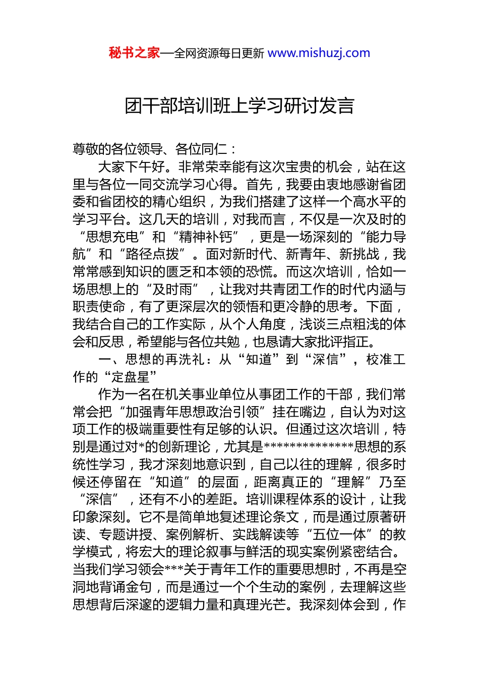 秘书之家—全网资源每日更新 www.mishuzj.com团干部培训班上学习研讨发言尊敬的各位领导、各位同仁:大家下午好。非常荣幸能有这次宝贵的机会,站在这里与各位一同交流学习心得。首先,我要由衷地感谢省团委和省团校的精心组织,为我们搭建了这样一个高水平的学习平台。这几天的培训,对我而言,不仅是一次及时的“思想充电”和“精神补钙”,更是一场深刻的“能力导航”和“路径点拨”。面对新时代、新青年、新挑战,我常常感到知识的匮乏和本领的恐慌。而这次培训,恰如一场思想上的“及时雨”,让我对共青团工作的时代内涵与职责使命,有了更深层次的领悟和更冷静的思考。下面,我结合自己的工作实际,从个人角度,浅谈三点粗浅的体会和反思,希望能与各位共勉,也恳请大家批评指正。一、思想的再洗礼:从“知道”到“深信”,校准工作的“定盘星”作为一名在机关事业单位从事团工作的干部,我们常常会把“加强青年思想政治引领”挂在嘴边,自认为对这项工作的极端重要性有足够的认识。但通过这次培训,特别是通过对*的创新理论,尤其是**************思想的系统性学习,我才深刻地意识到,自己以往的理解,很多时候还停留在“知道”的层面,距离真正的“理解”乃至“深信”,还有不小的差距。培训课程体系的设计,让我印象深刻。它不是简单地复述理论条文,而是通过原著研读、专题讲授、案例解析、实践解读等“五位一体”的教学模式,将宏大的理论叙事与鲜活的现实案例紧密结合。当我们学习领会***关于青年工作的重要思想时,不再是空洞地背诵金句,而是通过一个个生动的案例,去理解这些思想背后深邃的逻辑力量和真理光芒。我深刻体会到,作秘书之家—全网资源每日更新 www.mishuzj.com为团干部,我们自身首先必须是*的创新理论的坚定信仰者、积极传播者和忠实践行者。如果我们自己都学得不深、悟得不透,对理论的魅力感受不真切,又怎能指望去点燃青年心中的理想火焰?这次学习让我明白,思想引领工作绝不是一项可有可 w 无的点缀,而是我们所有工作的“根”与“魂”。它决定了我们工作的方向、底色和最终成效。我们面对的青年,成长于信息爆炸的时代,思想活跃,观念多元,辨别力强。简单的说教、刻板的灌输早已失效。这就要求我们必须在理论武装上先走一步、学深一层。只有我们自己真正搞清楚了“中国共产*为什么能,中国特色社会主义为什么好,马克思主义为什么行”,才能用青年听得懂、愿意听的语言,把这些大道理讲清楚、讲明白、讲透彻,引导他们将个人的“小我”融入国家和民族的“大我”之中,从而校准我们一切工作的“定盘星”。二、方法的再审视:从“做了”到“做好”,探索沟通的“新频道”培训期间,一位来自*市检察院的同仁分享说,新时代的共青团工作不能“自弹自唱”,必须紧密结合单位中心任务和青年成长需求。这句话让我产生了强烈的共鸣,也引发了我对工作方法的深刻反思。过去,我们组织活动,常常满足于“我组织了、你参加了”,至于效果如何、青年喜不喜欢、有没有收获,却缺少深入的思考和评估。我们习惯于用“做了多少”来衡量工作,而非“做好了多少”、“做实了多少”。这次培训,特别是关于 z 世代青年特点分析以及新媒体时代思想引导的课程,让我看到了自身在工作方法上的诸多不足。我们面对的“95 后”、“00后”青年,是互联网的原住民,他们的语言体系、交往方式、价值偏好都呈现出新的特点。如果我们还固守着开大会、读文件、拉横幅的“老三样”,就无异于用“bp 机”的思维去呼叫用“5g 手机”的青年,结果必然是“信号无法接通”。培训中介绍的许多创新实践,为我打开了新的秘书之家—全网资源每日更新 www.mishuzj.com思路。比如,利用“青年夜校”这种形式,将理论“微课堂”与技能提升、兴趣培养、公益服务相结合,让思想引领在轻松愉快的氛围中“润物细无声”。又比如,大力推动“朋辈教育”,组织“青年讲师团”,让青年人走上讲台,用“身边事”解读“大政策”,用“小故事”阐明“大道理”,这种同龄人之间的对话,远比我们这些“过来人”的说教更具亲和力与说服力。再比如,我们如何真正用好新媒体阵地,不是简单地把线...