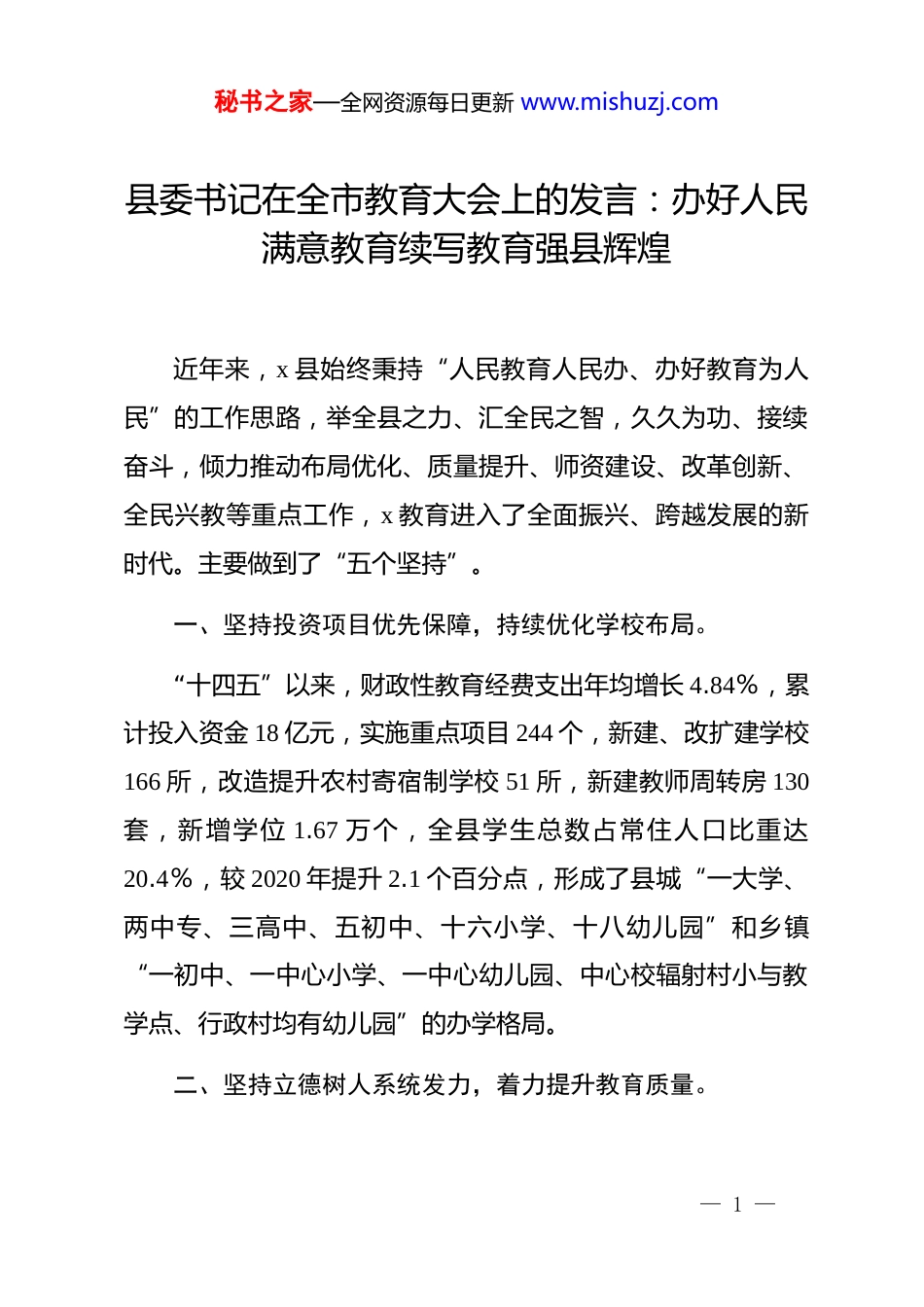 秘书之家—全网资源每日更新 www.mishuzj.com县委书记在全市教育大会上的发言:办好人民满意教育续写教育强县辉煌近年来,x 县始终秉持“人民教育人民办、办好教育为人民”的工作思路,举全县之力、汇全民之智,久久为功、接续奋斗,倾力推动布局优化、质量提升、师资建设、改革创新、全民兴教等重点工作,x 教育进入了全面振兴、跨越发展的新时代。主要做到了“五个坚持”。一、坚持投资项目优先保障,持续优化学校布局。“十四五”以来,财政性教育经费支出年均增长 4.84%,累计投入资金 18 亿元,实施重点项目 244 个,新建、改扩建学校166 所,改造提升农村寄宿制学校 51 所,新建教师周转房 130套,新增学位 1.67 万个,全县学生总数占常住人口比重达20.4%,较 2020 年提升 2.1 个百分点,形成了县城“一大学、两中专、三高中、五初中、十六小学、十八幼儿园”和乡镇“一初中、一中心小学、一中心幼儿园、中心校辐射村小与教学点、行政村均有幼儿园”的办学格局。二、坚持立德树人系统发力,着力提升教育质量。— 1 —秘书之家—全网资源每日更新 www.mishuzj.com始终将“五育”并举作为育人核心路径,细化落实各环节关键举措,推动全县教育教学质量实现跨越式提升。今年以来,高中阶段升学考试成绩再攀新高,优质生源培养成效显著,升学质量稳居前列,越来越多的 x 学子圆梦理想大学;初中阶段学业水平测试整体表现亮眼,综合成绩、达标率、高分段占比均创近六年新高,连续四年斩获市级教育质量振兴奖,x 教育的社会认可度与影响力不断增强。三、坚持引强培优一体推进,全面建强师资队伍。持续加强教师人文关怀、待遇保障、职称评定和师德师风建设,通过紧缺人才引进、事业单位招考、特岗教师招聘等方式,先后引进招聘各类专职教师 922 人,选派 526 名教育工作者赴山东等地培训学习,培育省市学科带头人、领军人才、骨干教师 143 人,创建名学校 26 所,培育名校(园)长 44 人、名班主任 190 人、名教师 439 人,全县教师平均年龄 40.9 岁,本科以上学历占 85.5%,高级职称占 22.1%,师资结构不断优化。四、坚持守正创新统筹部署,充分激活发展动能。纵深推进管理体制、教育评价、育人方式、办学模式等领— 2 —秘书之家—全网资源每日更新 www.mishuzj.com域综合改革,谋划建设九年制和十二年一贯制学校,推动教科才集团实体化运行,探索成立教育研究院、科创研究院、教育基金会,创新推进“区域联盟型”、“名校带动型”集团化办学和“大学区”制改革,组建各学段教育集团 30 个、区域学科教研中心 29 个,引进海亮教育托管马家窑初中,优质教育资源覆盖面不断扩大,探索形成了一批促进教育改革发展的 x 模式。五、坚持兴学助教全民参与,大力营造育人环境。健全学校家庭社会协同育人机制,凝聚“人人、事事、时时、处处”育人合力。社会各界积极助学捐资 4700 余万元,实施校舍操场提升项目 50 个、建设梦想教室 26 个、助力师生研学培训 1 万余人次。深入推进教育领域安全专项整治,各级*员干部宣法普法讲法 2000 余场次,全民尊崇教育、关注教育、支持教育的良好风尚在 x 大地蔚然成风。下一步,我县将认真贯彻落实本次大会精神,特别是汪书记的讲话要求,坚定不移办好人民满意教育,虚心学习兄弟县区先进经验,加快打造“全市一流、全省知名”的教育强县,为教育强市建设贡献更多 x 力量!— 3 —