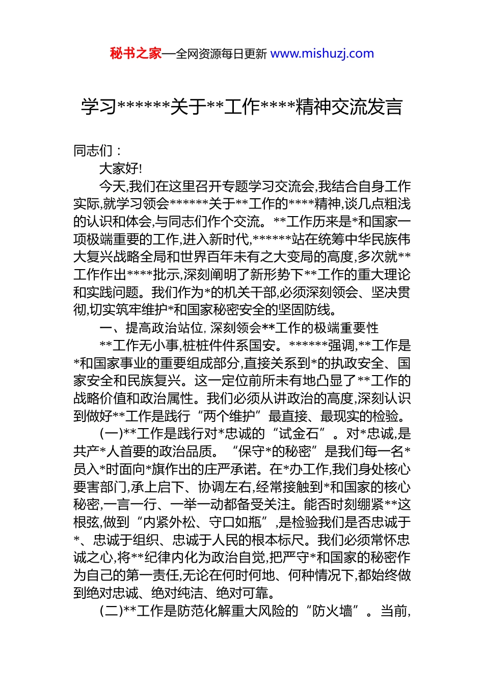 秘书之家—全网资源每日更新 www.mishuzj.com学习******关于**工作****精神交流发言同志们:大家好!今天,我们在这里召开专题学习交流会,我结合自身工作实际,就学习领会******关于**工作的****精神,谈几点粗浅的认识和体会,与同志们作个交流。**工作历来是*和国家一项极端重要的工作,进入新时代,******站在统筹中华民族伟大复兴战略全局和世界百年未有之大变局的高度,多次就**工作作出****批示,深刻阐明了新形势下**工作的重大理论和实践问题。我们作为*的机关干部,必须深刻领会、坚决贯彻,切实筑牢维护*和国家秘密安全的坚固防线。一、提高政治站位,深刻领会**工作的极端重要性**工作无小事,桩桩件件系国安。******强调,**工作是*和国家事业的重要组成部分,直接关系到*的执政安全、国家安全和民族复兴。这一定位前所未有地凸显了**工作的战略价值和政治属性。我们必须从讲政治的高度,深刻认识到做好**工作是践行“两个维护”最直接、最现实的检验。(一)**工作是践行对*忠诚的“试金石”。对*忠诚,是共产*人首要的政治品质。“保守*的秘密”是我们每一名*员入*时面向*旗作出的庄严承诺。在*办工作,我们身处核心要害部门,承上启下、协调左右,经常接触到*和国家的核心秘密,一言一行、一举一动都备受关注。能否时刻绷紧**这根弦,做到“内紧外松、守口如瓶”,是检验我们是否忠诚于*、忠诚于组织、忠诚于人民的根本标尺。我们必须常怀忠诚之心,将**纪律内化为政治自觉,把严守*和国家的秘密作为自己的第一责任,无论在何时何地、何种情况下,都始终做到绝对忠诚、绝对纯洁、绝对可靠。(二)**工作是防范化解重大风险的“防火墙”。当前,秘书之家—全网资源每日更新 www.mishuzj.com我国发展进入战略机遇和风险挑战并存、不确定难预料因素增多的时期。从国际看,霸权主义和强权政治依然存在,意识形态领域的斗争尖锐复杂,境外情报机构的窃密活动从未停止,手段更加隐蔽、技术更加先进。从国内看,随着信息化的快速发展,涉密载体由单一的纸质文件向声、光、电、磁等多种形式转变,**与窃密的斗争已经从传统的物理空间扩展到网络空间。据国家**部门 2025 年上半年通报,全国查处各类泄密案件 xx 起,其中通过互联网及新媒体平台泄密的案件占比高达 70%,违规使用智能设备、非涉密计算机处理涉密信息等成为主要诱因。这些都警示我们,**工作面临的形势日益严峻复杂,稍有不慎就可能给*和国家事业造成不可估量的损失。二、聚焦风险挑战,精准把握新时代**工作的特点规律新时代**工作面临许多新情况、新问题,呈现出新的阶段性特征。我们必须坚持问题导向,常怀谨慎之心,如履薄冰、如临深渊,精准把握新时代**工作的特点和规律,才能做到有的放矢、防患于未然。(一)突出管住“人”这个关键。人是**工作的核心要素,也是最容易出问题的环节。做好**工作,首先要做好人的工作。一方面,要加强常态化教育。定期组织学习**知识、通报泄密案例,让“警钟”长鸣,引导全体同志深刻认识到**不仅是工作要求,更是政治纪律和法律红线。前段时间,我市有关部门起草一份涉及民生的重要方案,在正式发布前,网络上就出现了各种猜测。我们一些同志虽然提前知晓内容,但都做到了守口如瓶,包括对家人也未曾谈及,这正是**纪律在我们思想和行动中的具体体现。另一方面,要加强监督管理。严格落实涉密人员审查、在岗管理、离岗离职脱密期管理等制度,定期开展谈心谈话,及时掌握干部职工的思想动态,对发现的苗头性、倾向性问题早提醒、早纠正,防止小问题演变成大祸患。(二)把牢“网”这个重点。互联网是信息时代最大的变秘书之家—全网资源每日更新 www.mishuzj.com量,也是**工作最大的风险源。我们必须牢固树立“涉密不上网、上网不涉密”的底线思维。一要严格区分内外网。坚决杜绝在非涉密计算机、移动存储介质中存储、处理、传输涉密信息,严禁将涉密计算机、移动存储介质接入互联网及其他公共信息网络。二要规范移动设备使用。加强对智能手机、平板电脑等移动智能终端的管理,严禁在微信、qq 等社交媒体上谈论、传递涉密及工作敏感信息,严禁在朋友圈、微博等发布暴露单位信息、工作动态的内容。三要强化技术防范。按照要求配备和使用必...
