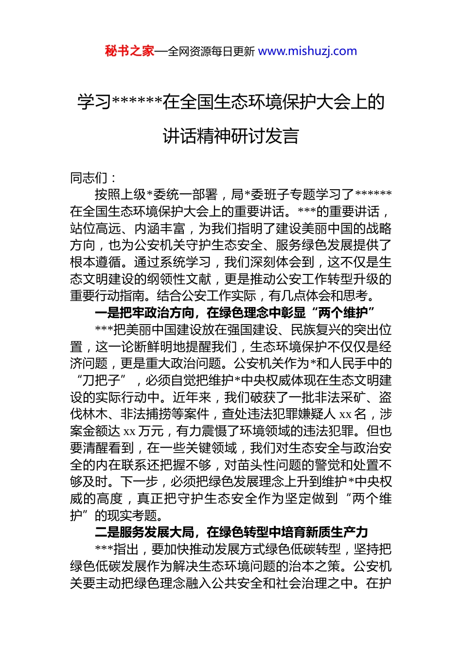 秘书之家—全网资源每日更新 www.mishuzj.com学习******在全国生态环境保护大会上的讲话精神研讨发言同志们:按照上级*委统一部署,局*委班子专题学习了******在全国生态环境保护大会上的重要讲话。***的重要讲话,站位高远、内涵丰富,为我们指明了建设美丽中国的战略方向,也为公安机关守护生态安全、服务绿色发展提供了根本遵循。通过系统学习,我们深刻体会到,这不仅是生态文明建设的纲领性文献,更是推动公安工作转型升级的重要行动指南。结合公安工作实际,有几点体会和思考。一是把牢政治方向,在绿色理念中彰显“两个维护”***把美丽中国建设放在强国建设、民族复兴的突出位置,这一论断鲜明地提醒我们,生态环境保护不仅仅是经济问题,更是重大政治问题。公安机关作为*和人民手中的“刀把子”,必须自觉把维护*中央权威体现在生态文明建设的实际行动中。近年来,我们破获了一批非法采矿、盗伐林木、非法捕捞等案件,查处违法犯罪嫌疑人 xx 名,涉案金额达 xx 万元,有力震慑了环境领域的违法犯罪。但也要清醒看到,在一些关键领域,我们对生态安全与政治安全的内在联系还把握不够,对苗头性问题的警觉和处置不够及时。下一步,必须把绿色发展理念上升到维护*中央权威的高度,真正把守护生态安全作为坚定做到“两个维护”的现实考题。二是服务发展大局,在绿色转型中培育新质生产力***指出,要加快推动发展方式绿色低碳转型,坚持把绿色低碳发展作为解决生态环境问题的治本之策。公安机关要主动把绿色理念融入公共安全和社会治理之中。在护秘书之家—全网资源每日更新 www.mishuzj.com航重大绿色产业项目中,我们累计开展安全检查 xx 次,排查风险隐患 xx 处,为新能源项目、生态农业园区等提供了有力保障。但我们也存在不足,部分警种仍然停留在传统治安管理思维,对绿色产业的安全需求研究不够深入,对如何将公安职能优势转化为绿色动能支撑谋划不足。这要求我们必须主动调整,既要在传统治安防控上守住底线,更要在护航绿色发展上开拓新路,把公安力量融入新质生产力的孕育和成长中。三是厚植民生情怀,在绿色守护中回应群众关切***强调,良好生态环境是最公平的公共产品、是最普惠的民生福祉。公安机关的职责与此高度契合,因为公平正义和生态安全一样,都是人民群众的殷切期盼。近年来我们开展了“绿盾行动”,查处非法排污、破坏水源地等案件 xx 起,办理环境类行政案件 xx 件,为群众守住了饮水安全线和空气清洁线。然而我们也看到,生态环境违法犯罪隐蔽性强、跨区域性明显,仅靠公安一家力量难以形成合力,尤其在农村面源污染、非法固废倾倒等问题上,发现难、取证难、打击难的矛盾依然存在。下一步,我们必须在群众最关心、最直接、最现实的生态问题上用心用力把“生态安全就是民生安全”的理念贯彻到底,让公安工作温度体现在群众的幸福感中。四是直面自身短板,在绿色实践中补齐能力不足***的重要讲话不仅是行动指南,更是“自我革命”的警钟。通过学习,我们深刻认识到,公安工作在生态文明建设中还存在短板。思想上仍有“重治安、轻生态”的惯性,对环境犯罪的政治敏锐性不足;机制上部门协同不畅线索共享、案件衔接存在壁垒;能力上专业力量薄弱,对环境犯罪的溯源、取证和证据固定手段还不够精细;服务上缺乏主动,研究绿色产业安全需求不够深入,警务投入与新兴风险未完全匹配。这些问题警醒我们,必须敢于直面差距,善于补齐短板,以更高标准要求自己,在生态警秘书之家—全网资源每日更新 www.mishuzj.com务建设上不断突破。五是强化使命担当,在绿色征程中展现公安作为***强调,推进美丽中国建设是一项长期而艰巨的任务,需要久久为功、善作善成。公安机关必须把守护生态安全作为新时代公安工作的重要任务,主动在服务大局中彰显作为。我们要把理论学习摆在首位,把***生态文明思想作为*委会“第一议题”,推动绿色理念内化于心、外化于行;要在执法打击上持续用力,保持对环境违法犯罪的高压震慑;要在协同治理上主动作为,推动建立跨部门、跨区域的联合执法机制,形成治理合力;要在能力建设上补齐短板,依托科技赋能提升发现力、打...