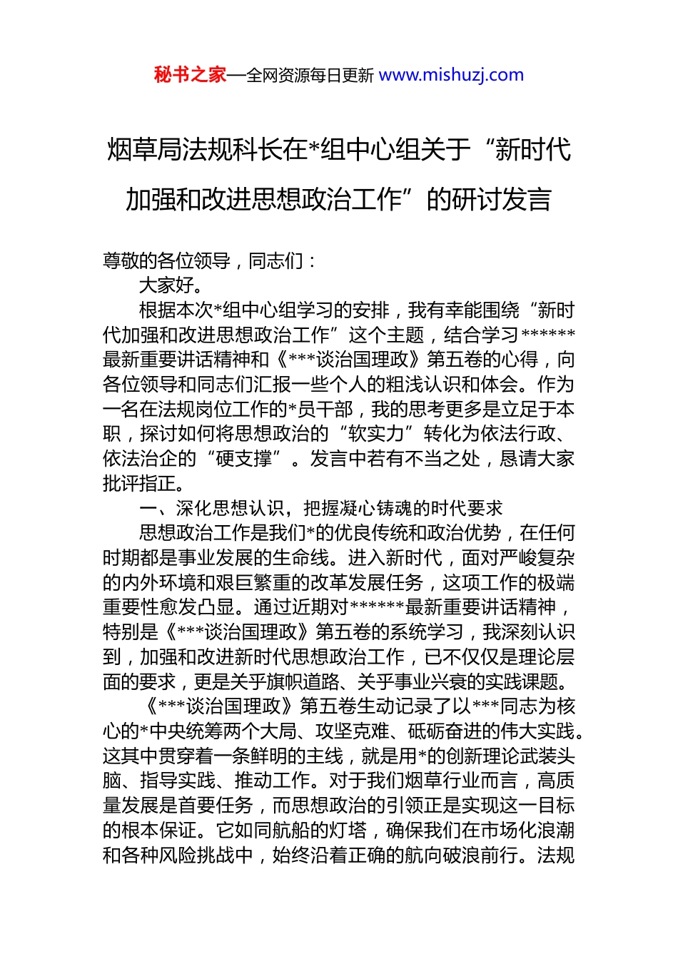 秘书之家—全网资源每日更新 www.mishuzj.com烟草局法规科长在*组中心组关于“新时代加强和改进思想政治工作”的研讨发言尊敬的各位领导,同志们:大家好。根据本次*组中心组学习的安排,我有幸能围绕“新时代加强和改进思想政治工作”这个主题,结合学习******最新重要讲话精神和《***谈治国理政》第五卷的心得,向各位领导和同志们汇报一些个人的粗浅认识和体会。作为一名在法规岗位工作的*员干部,我的思考更多是立足于本职,探讨如何将思想政治的“软实力”转化为依法行政、依法治企的“硬支撑”。发言中若有不当之处,恳请大家批评指正。一、深化思想认识,把握凝心铸魂的时代要求思想政治工作是我们*的优良传统和政治优势,在任何时期都是事业发展的生命线。进入新时代,面对严峻复杂的内外环境和艰巨繁重的改革发展任务,这项工作的极端重要性愈发凸显。通过近期对******最新重要讲话精神,特别是《***谈治国理政》第五卷的系统学习,我深刻认识到,加强和改进新时代思想政治工作,已不仅仅是理论层面的要求,更是关乎旗帜道路、关乎事业兴衰的实践课题。《***谈治国理政》第五卷生动记录了以***同志为核心的*中央统筹两个大局、攻坚克难、砥砺奋进的伟大实践。这其中贯穿着一条鲜明的主线,就是用*的创新理论武装头脑、指导实践、推动工作。对于我们烟草行业而言,高质量发展是首要任务,而思想政治的引领正是实现这一目标的根本保证。它如同航船的灯塔,确保我们在市场化浪潮和各种风险挑战中,始终沿着正确的航向破浪前行。法规秘书之家—全网资源每日更新 www.mishuzj.com工作身处行业依法治理的第一线,每天面对的是具体的法律条文、复杂的市场主体和潜在的执法风险。如果没有坚定的政治立场、正确的价值导向和强大的思想定力,就容易在纷繁复杂的局面中迷失方向,甚至出现偏差。因此,把思想政治工作抓在经常、融入日常,既是时代赋予我们的政治责任,也是做好本职工作的内在需求。二、结合工作实际,交流学思践悟的深刻体会在学习和思考的过程中,我尝试将宏大的理论叙事与具体的法规工作相结合,愈发感到思想政治工作并非虚无缥缈的口号,而是触手可及、赋能增效的实践力量。首先,我体会到,坚实的思想根基是涵养法治精神的“源头活水”。***法治思想是全面依法治国的根本遵循。作为法规科的一员,学习法律法规是基本功,但更深层次的,是如何理解和践行法律背后的精神实质。通过学习,我更加清醒地认识到,法规工作绝不是简单地“照本宣科”,而是要将*的意志、国家利益和人民期盼通过法治方式予以贯彻。比如,在处理烟草专卖许可证管理的相关问题时,过去可能更多地是从条款本身去解释和执行。现在我会自觉地从维护国家烟草专卖制度的经济安全属性、保障消费者权益、优化营商环境等更高站位去思考,力求在每一次的法律解释、案件审核和制度建设中,都体现出公平正义的价值追求和服务大局的政治自觉。这种运用法治思维和法治方式推动工作的能力,其根源正在于不断强化的思想政治觉悟。其次,我体会到,严密的思想防线是抵御各类风险的“坚固堤坝”。******反复强调要贯彻落实总体国家安全观,增强维护国家安全的意识。法规工作常常接触到行业内部的管理数据、案件信息以及未公开的政策文件,这些都与行业经济安全、信息安全息息相关。思想上的“总开关”一旦松动,**意识、风险意识就会淡薄,就可能在不经意间造成难以挽回的损失。近期学习让我对“**工作无秘书之家—全网资源每日更新 www.mishuzj.com小事”有了更切身的感受。法规科不仅要处理外部的法律风险,更要防范内部的思想风险。这就要求我在日常工作中,不仅要带头遵守**纪律,更要时常提醒自己和科室同志,我们手中的文件、处理的案件,背后牵动的是行业的稳定和国家的利益。只有从思想深处筑牢安全防线,才能在各种诱惑和考验面前站稳脚跟,自觉成为国家利益和行业安全的坚定捍卫者。最后,我体会到,持续的思想淬炼是个人成长进步的“内生动力”。《***谈治国理政》第五卷是提高理论水平的“重要教材”。捧读原著、深悟原理的过程,对我而言既是一次精神上的“补钙”,也是一次能力上的“充电”书...