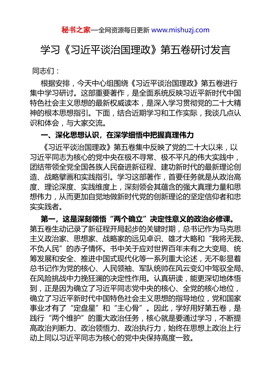 秘书之家—全网资源每日更新 www.mishuzj.com学习《习近平谈治国理政》第五卷研讨发言 同志们:根据安排,今天中心组围绕《习近平谈治国理政》第五卷进行集中学习研讨。这部重要著作,是全面系统反映习近平新时代中国特色社会主义思想的最新权威读本,是深入学习贯彻党的二十大精神的根本思想指引。下面,结合近期学习和工作实际,我谈几点认识和体会,与大家交流。一、深化思想认识,在深学细悟中把握真理伟力《习近平谈治国理政》第五卷集中反映了党的二十大以来,以习近平同志为核心的党中央在极不寻常、极不平凡的伟大实践中,团结带领全党全国各族人民奋进新征程、建功新时代的最新理论创造、战略擘画和实践指引。学习这部著作,首要任务就是从政治高度、理论深度、实践维度上,深刻领会其蕴含的强大真理力量和思想伟力,从而更加自觉地做新时代党的创新理论的坚定信仰者和忠实实践者。第一,这是深刻领悟“两个确立”决定性意义的政治必修课。第五卷生动记录了新征程开局起步的关键时期,总书记作为马克思主义政治家、思想家、战略家的远见卓识、雄才大略和“我将无我、不负人民”的赤子情怀。书中关于应对世界百年未有之大变局、统筹发展和安全、推进中国式现代化等一系列重大论述,无不彰显着总书记作为党的核心、人民领袖、军队统帅在风云变幻中驾驭全局、在风险挑战中力挽狂澜的决定性作用。认真研读,能更深切地体悟到,正是因为确立了习近平同志党中央的核心、全党的核心地位,确立了习近平新时代中国特色社会主义思想的指导地位,党和国家事业才有了“定盘星”和“主心骨”。因此,学好用好第五卷,是践行“两个维护”的重大政治任务,核心就是要通过学习,不断提高政治判断力、政治领悟力、政治执行力,始终在思想上政治上行动上同以习近平同志为核心的党中央保持高度一致。秘书之家—全网资源每日更新 www.mishuzj.com第二,这是系统掌握马克思主义中国化时代化最新成果的理论必修课。第五卷通篇贯穿着辩证唯物主义和历史唯物主义的世界观和方法论,原创性地提出了一系列新理念新思想新战略,科学回答了中国之问、世界之问、人民之问、时代之问,是马克思主义中国化时代化的光辉典范。特别是其中关于高质量发展、新质生产力、全过程人民民主、建设中华民族现代文明、构建人类命运共同体等重大论述,进一步丰富和发展了习近平新时代中国特色社会主义思想的科学体系。学习这部著作,就是要深刻把握其“六个必须坚持”的立场观点方法,知其言更知其义、知其然更知其所以然,切实把思想伟力转化为改造主观世界和客观世界的强大武器。第三,这是奋力谱写 XX 现代化新篇章的实践必修课。理论的价值在于指导实践。第五卷聚焦的都是事关党和国家事业发展全局的战略问题,提出的都是具有全局性、根本性、长远性的工作要求。无论是强调“高质量发展是新时代的硬道理”,还是要求“以新安全格局保障新发展格局”,都为我们做好当前和今后一个时期的工作提供了根本遵循。学习贯彻这部著作,绝不能停留在口头上、书本里,必须紧密联系 XX 省的实际,坚持学思用贯通、知信行统一,把学习成效切实转化为推动 XX 加快建成 XX 区域崛起重要战略支点的生动实践。二、坚持知行合一,在对标对表中汲取实践伟力学习理论的最终目的在于运用。对照《习近平谈治国理政》第五卷中的重要论述,结合 XX 省当前发展态势,可以更清晰地看到,我们取得的每一项成绩,都是在总书记思想科学指引下的结果;我们面临的每一个挑战,也都需要从总书记的思想中寻找破解之道。其一,在推动高质量发展上取得了坚实成效。总书记在第五卷中反复强调,“必须完整、准确、全面贯彻新发展理念”“高质量发展是全面建设社会主义现代化国家的首要任务”。回顾“十四五”收官之年的奋斗历程,XX 省正是坚定不移沿着这条正确道路前进的。今年上半年,全省地区生产总值(GDP)实现了 6.2%的增长,这一增速高于全国平均水平,在主要经济省份中位居前列。秘书之家—全网资源每日更新 www.mishuzj.com这一成绩来之不易,充分证明了只要我们坚持以高质量发展统揽全局,就能在复杂严峻的外部环境下保持经济...