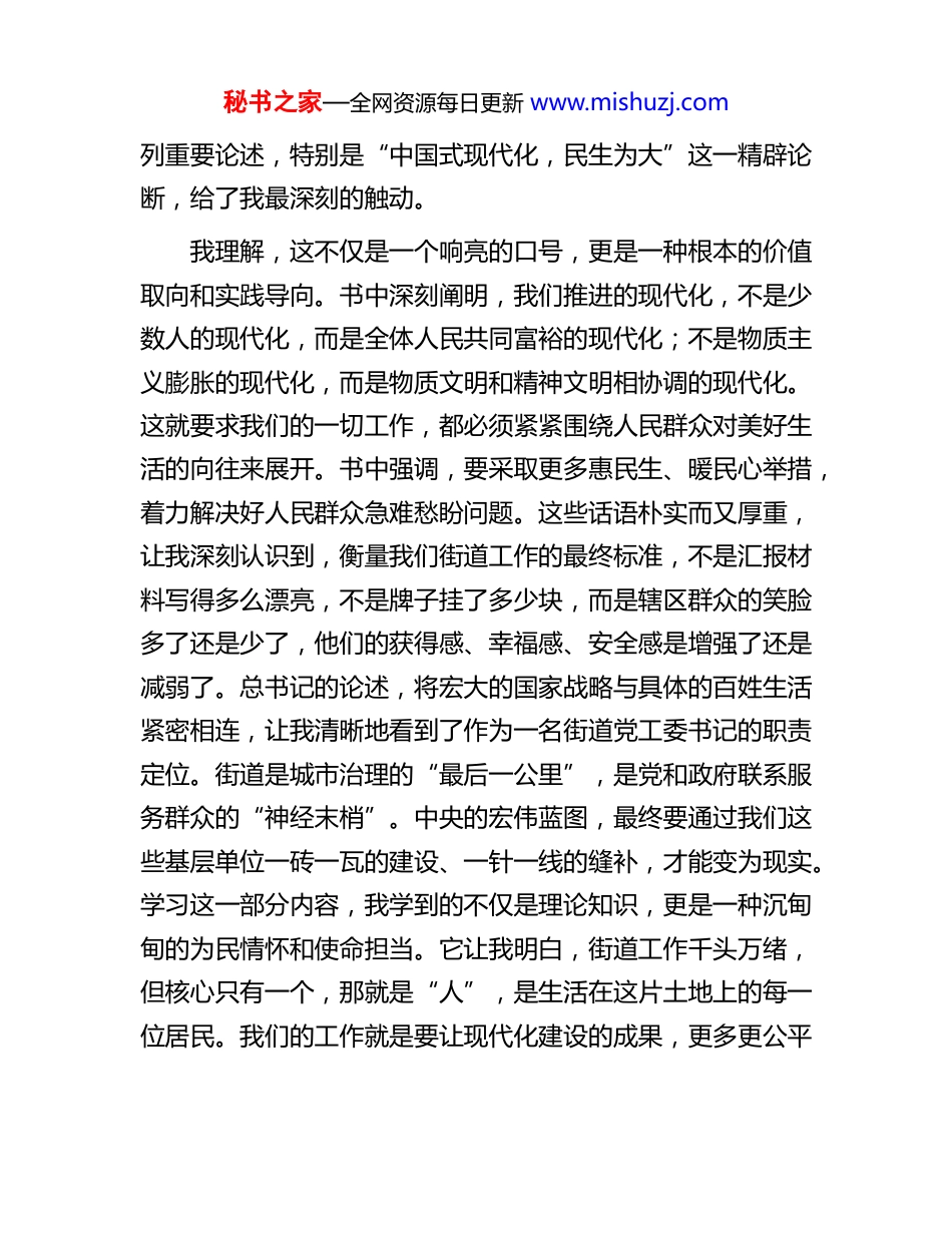 秘书之家—全网资源每日更新 www.mishuzj.com街道党工委书记关于学习《习近平谈治国理政》第五卷的研讨发言各位同志:根据安排,下面我结合近期的学习和工作实际,谈几点个人体会,不当之处,请大家批评指正。《习近平谈治国理政》第五卷的出版,是党和国家政治生活中的一件大事。作为一名在基层工作多年的党员干部,能够第一时间捧读这部思想深邃、内涵丰富的经典著作,我感到非常振奋,也深感责任重大。当前正值 2025 年秋季,全党上下深入学习贯彻党的二十大精神,这部著作的出版恰逢其时,为我们基层工作者在新征程上攻坚克难、开拓前行提供了强大的思想武器和行动指南。通过反复研读,我深受教育、深受启发。下面,我将从“学了什么”“想了什么”“准备怎么干”三个方面,汇报我的学习心得。一、学了什么:深刻领会“中国式现代化,民生为大”的时代内涵《习近平谈治国理政》第五卷收录了总书记在 2022 年 5月至 2024 年 12 月期间的重要著作,系统展现了党的二十大以来治国理政的最新理论创新成果。通读全书,我感到贯穿始终的一条主线,就是“以中国式现代化全面推进中华民族伟大复兴”。在学习过程中,我重点研读了其中关于民生福祉的系秘书之家—全网资源每日更新 www.mishuzj.com列重要论述,特别是“中国式现代化,民生为大”这一精辟论断,给了我最深刻的触动。我理解,这不仅是一个响亮的口号,更是一种根本的价值取向和实践导向。书中深刻阐明,我们推进的现代化,不是少数人的现代化,而是全体人民共同富裕的现代化;不是物质主义膨胀的现代化,而是物质文明和精神文明相协调的现代化。这就要求我们的一切工作,都必须紧紧围绕人民群众对美好生活的向往来展开。书中强调,要采取更多惠民生、暖民心举措,着力解决好人民群众急难愁盼问题。这些话语朴实而又厚重,让我深刻认识到,衡量我们街道工作的最终标准,不是汇报材料写得多么漂亮,不是牌子挂了多少块,而是辖区群众的笑脸多了还是少了,他们的获得感、幸福感、安全感是增强了还是减弱了。总书记的论述,将宏大的国家战略与具体的百姓生活紧密相连,让我清晰地看到了作为一名街道党工委书记的职责定位。街道是城市治理的“最后一公里”,是党和政府联系服务群众的“神经末梢”。中央的宏伟蓝图,最终要通过我们这些基层单位一砖一瓦的建设、一针一线的缝补,才能变为现实。学习这一部分内容,我学到的不仅是理论知识,更是一种沉甸甸的为民情怀和使命担当。它让我明白,街道工作千头万绪,但核心只有一个,那就是“人”,是生活在这片土地上的每一位居民。我们的工作就是要让现代化建设的成果,更多更公平秘书之家—全网资源每日更新 www.mishuzj.com地惠及全体人民,让“民生为大”的理念在*街道的每一个角落落地生根、开花结果。二、想了什么:在深学细悟中校准思想和行动的“定盘星”掩卷沉思,总书记的谆谆教诲言犹在耳。结合我们*街道的实际情况,我产生了三个方面的深刻感悟。一是我想到,必须始终站稳“人民至上”的根本立场。回顾过去,我们街道在推动经济发展、城市建设方面取得了一些成绩,辖区面貌日新月异。但静下心来反思,工作中是否还存在“重物轻人”“重显绩轻潜绩”的现象?比如,我们在推进旧城改造项目时,是否充分听取了每一户居民的意见?在建设新的社区服务中心时,功能布局是否真正贴合了“一老一小”的实际需求?学习了第五卷,我更加清醒地认识到,发展的最终目的是人。任何一项工作,如果脱离了群众的需求,背离了为民的初心,即便看起来再光鲜,也是无源之水、无本之木。作为“一线总指挥”,我必须时刻自省,把群众的安危冷暖放在心上,把群众的急难愁盼抓在手上,确保我们作出的每一项决策、推进的每一项工作,都能经得起人民和历史的检验。二是我想到,必须牢固树立“问题导向”的务实作风。书中多次强调,要坚持问题导向,敢于正视问题、善于发现问题、有效解决问题。当前,*街道正处于转型发展的关键期。我们秘书之家—全网资源每日更新 www.mishuzj.com面临着产业结构升级的压力,老旧小区治理的难题,还有流动人口服务管理的挑战。这些都是难啃的“硬骨头”...