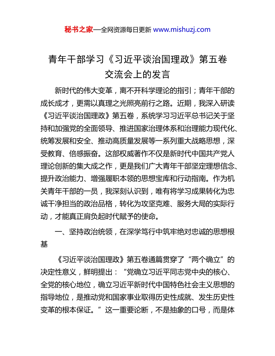 秘书之家—全网资源每日更新 www.mishuzj.com青年干部学习《习近平谈治国理政》第五卷交流会上的发言新时代的伟大变革,离不开科学理论的指引;青年干部的成长成才,更需以真理之光照亮前行之路。近期,我深入研读《习近平谈治国理政》第五卷,系统学习习近平总书记关于坚持和加强党的全面领导、推进国家治理体系和治理能力现代化、统筹发展和安全、推动高质量发展等一系列重大战略思想,深受教育、倍感振奋。这部权威著作不仅是新时代中国共产党人理论创新的集大成之作,更是我们广大青年干部坚定理想信念、提升政治能力、增强履职本领的思想宝库和行动指南。作为机关青年干部的一员,我深刻认识到,唯有将学习成果转化为忠诚干净担当的政治品格,转化为攻坚克难、服务大局的实际行动,才能真正肩负起时代赋予的使命。一、坚持政治统领,在深学笃行中筑牢绝对忠诚的思想根基《习近平谈治国理政》第五卷通篇贯穿了“两个确立”的决定性意义,鲜明提出:“党确立习近平同志党中央的核心、全党的核心地位,确立习近平新时代中国特色社会主义思想的指导地位,是推动党和国家事业取得历史性成就、发生历史性变革的根本保证。”这一重要论断,不是抽象的口号,而是体秘书之家—全网资源每日更新 www.mishuzj.com现在脱贫攻坚战的全面胜利、疫情防控阻击战的高效应对、生态文明建设的显著成效、科技自立自强的突破进展等方方面面。从打赢人类历史上规模最大的脱贫攻坚战,到建成世界上规模最大的教育体系、社会保障体系、医疗保障体系,无不彰显出以习近平同志为核心的党中央掌舵领航的伟力。作为机关青年干部,我们必须把对“两个确立”的高度认同,内化为听党指挥、服从大局的政治自觉。要始终坚持以党的旗帜为旗帜、以党的方向为方向、以党的意志为意志,不断增强“四个意识”、坚定“四个自信”、做到“两个维护”。在实际工作中,坚决落实党中央决策部署,不打折扣、不搞变通,确保政令畅通、令行禁止。特别是在面对复杂任务、急难险重工作时,更要主动靠前、敢于担当,切实把“两个维护”体现到贯彻落实的具体举措中,体现在解决群众急难愁盼问题的实效上。二、厚植人民情怀,在服务实践中践行初心使命书中反复强调:“人民是我们党执政的最大底气,是我们共和国的坚实根基。”无论是推动共同富裕的战略部署,还是加强基层治理的制度安排,都紧紧围绕“为了人民、依靠人民”展开。总书记指出:“要把人民群众是否满意作为衡量工作的根本标准。”这不仅是一句庄严承诺,更是一种价值导向、一种行为准则。秘书之家—全网资源每日更新 www.mishuzj.com作为一线服务岗位的青年干部,我们每天接触的是最真实的群众诉求,处理的是最具体的民生事务。必须把“人民至上”理念融入日常、落在实处。一是要沉下身子察民情。主动走出办公室,深入基层一线,通过走访调研、座谈交流、问卷调查等方式,掌握群众所思所想所盼。二是要用心用情解民忧。对群众反映强烈的办事难、流程繁、等待久等问题,要敢于动真碰硬,推动流程再造、服务优化。三是要建章立制暖民心。建立“首问负责+限时办结+回访反馈”机制,让群众办事更便捷、体验更舒心。例如,某地推行“一件事一次办”改革后,企业开办时间由原来的 7 个工作日压缩至 1 天,群众满意度达 98.6%,这就是“以人民为中心”理念落地见效的生动缩影。三、聚焦主责主业,在实干担当中提升履职能力《习近平谈治国理政》第五卷明确指出:“推动高质量发展是当前和今后一个时期确定发展思路、制定经济政策、实施宏观调控的根本要求。”这一重大判断,既是对全国发展的总体要求,也为我们各级机关单位指明了工作方向。作为业务骨干,我们要立足本职岗位,把学习成果转化为破解难题、推动工作的实际能力。一是要强化专业素养。深入学习政策法规、行业标准、技术规范,不断提升业务水平。二是要锤炼务实作风。杜绝“只讲形式不求实效”“重留痕轻结秘书之家—全网资源每日更新 www.mishuzj.com果”的倾向,把精力用在解决实际问题上。三是要勇于改革创新。打破思维定势和路径依赖,探索更加高效、智能、便民的服务模式。比如,某市依托政务大数...