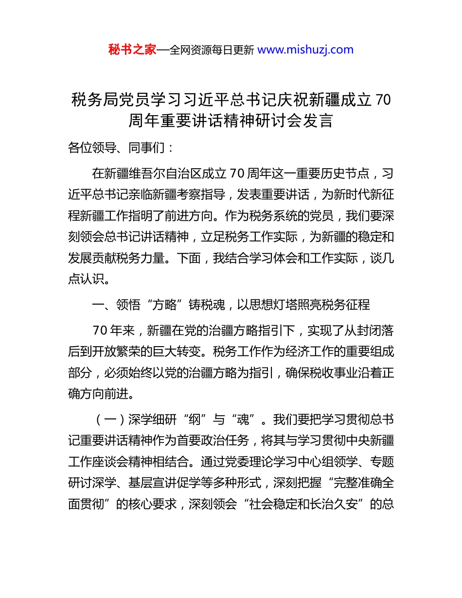 秘书之家—全网资源每日更新 www.mishuzj.com税务局党员学习习近平总书记庆祝新疆成立 70周年重要讲话精神研讨会发言各位领导、同事们:在新疆维吾尔自治区成立 70 周年这一重要历史节点,习近平总书记亲临新疆考察指导,发表重要讲话,为新时代新征程新疆工作指明了前进方向。作为税务系统的党员,我们要深刻领会总书记讲话精神,立足税务工作实际,为新疆的稳定和发展贡献税务力量。下面,我结合学习体会和工作实际,谈几点认识。一、领悟“方略”铸税魂,以思想灯塔照亮税务征程70 年来,新疆在党的治疆方略指引下,实现了从封闭落后到开放繁荣的巨大转变。税务工作作为经济工作的重要组成部分,必须始终以党的治疆方略为指引,确保税收事业沿着正确方向前进。(一)深学细研“纲”与“魂”。我们要把学习贯彻总书记重要讲话精神作为首要政治任务,将其与学习贯彻中央新疆工作座谈会精神相结合。通过党委理论学习中心组领学、专题研讨深学、基层宣讲促学等多种形式,深刻把握“完整准确全面贯彻”的核心要求,深刻领会“社会稳定和长治久安”的总秘书之家—全网资源每日更新 www.mishuzj.com目标对税收工作的指导意义,深刻理解税收在实现“五大战略定位”中的重要作用。(二)对标对表“时”与“势”。新疆地处“一带一路”核心区,在国家发展大局中具有重要地位。我们要立足新发展阶段、贯彻新发展理念、构建新发展格局,把握“双循环”机遇,跳出“就税务看税务”的局限,树立“全国一盘棋”思想。在服务国家战略和新疆经济社会发展中找准税收工作定位,充分发挥税收职能作用,为新疆高质量发展提供坚实的财力保障。(三)知行合一“学”与“用”。坚持学思用贯通、知信行统一,把学习成果转化为推动税收工作的实际行动。围绕“让各族群众共享发展成果”的要求,将税收工作的课堂延伸到企业、社区和乡村,在解决纳税人缴费人“急难愁盼”问题中检验学习成效。落实好各项税收优惠政策,助力企业发展,促进就业创业,让党的创新理论在税收工作中落地生根、开花结果。二、聚焦“发展”赋税能,以实干担当助力经济腾飞当前,新疆正处于政策叠加的“黄金期”、优势释放的“窗口期”、动能转换的“关键期”。税务部门要积极响应总书记号召,立足资源禀赋和产业基础,为新疆探索符合自身特点的高质量发展路子贡献税务力量。秘书之家—全网资源每日更新 www.mishuzj.com(一)聚焦“特色优势”促产业。新疆具有丰富的特色资源和产业优势。我们要充分发挥税收政策的引导作用,支持传统产业转型升级。对于“一黑一白”等传统产业,以及“粮、棉、果、畜”四大产业集群,落实好相关税收优惠政策,推动棉花全产业链升级,助力打造全国优质畜产品生产基地。同时,加大对新能源、新材料等战略性新兴产业的税收扶持力度,培育壮大新的经济增长点。(二)聚焦“改革开放”添活力。新疆作为“一带一路”核心区,开放是最大优势。税务部门要深化“放管服”改革,打造市场化、法治化、国际化的税收营商环境。简化办税流程,提高办税效率,为各类市场主体提供更加便捷、高效的服务,让“国企敢干、民企敢闯、外企敢投”。加强与中亚、西亚等国家的税收征管合作,推动丝绸之路经济带核心区建设,促进贸易和投资自由化便利化。(三)聚焦“生态优先”助转型。新疆生态环境脆弱,保护生态环境就是保护生产力。我们要牢固树立“绿水青山就是金山银山”的理念,通过税收政策引导企业绿色发展。严格落实环保税等相关政策,鼓励企业采用清洁生产技术,减少污染物排放。支持循环经济发展,对资源综合利用企业给予税收优惠,推动新疆经济绿色转型,让“含绿量”成为“含金量”。三、筑牢“稳定”强税基,以团结奋进共筑和谐税风秘书之家—全网资源每日更新 www.mishuzj.com社会稳定是新疆发展的“生命线”,民族团结是各族人民的“幸福线”。税务部门要积极参与社会治理,为维护新疆社会稳定和民族团结贡献力量。(一)在“基层治理”上夯税基。基层是稳定的“第一道防线”,也是税收工作的前沿阵地。我们要坚持“抓基层、强基础”,加强基层税务分局(所)建设,选优配强基层干部队伍。推广“枫桥...