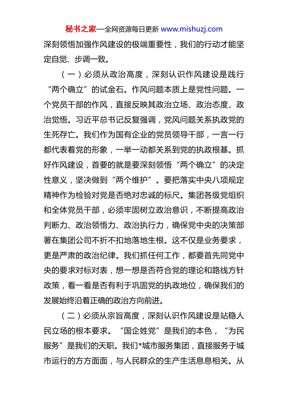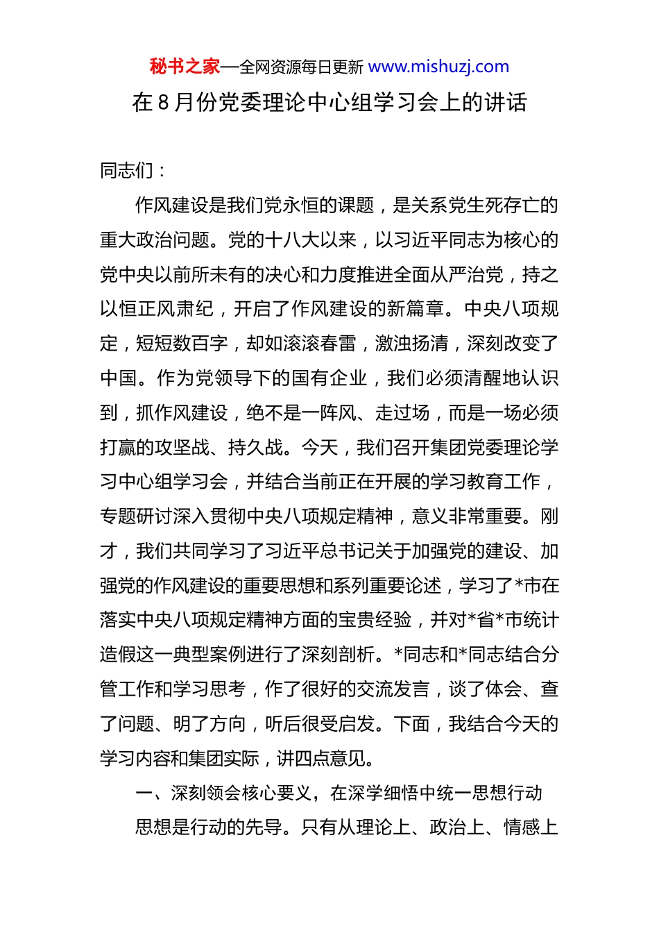 秘书之家—全网资源每日更新 www.mishuzj.com在 8 月份党委理论中心组学习会上的讲话 同志们:作风建设是我们党永恒的课题,是关系党生死存亡的重大政治问题。党的十八大以来,以习近平同志为核心的党中央以前所未有的决心和力度推进全面从严治党,持之以恒正风肃纪,开启了作风建设的新篇章。中央八项规定,短短数百字,却如滚滚春雷,激浊扬清,深刻改变了中国。作为党领导下的国有企业,我们必须清醒地认识到,抓作风建设,绝不是一阵风、走过场,而是一场必须打赢的攻坚战、持久战。今天,我们召开集团党委理论学习中心组学习会,并结合当前正在开展的学习教育工作,专题研讨深入贯彻中央八项规定精神,意义非常重要。刚才,我们共同学习了习近平总书记关于加强党的建设、加强党的作风建设的重要思想和系列重要论述,学习了*市在落实中央八项规定精神方面的宝贵经验,并对*省*市统计造假这一典型案例进行了深刻剖析。*同志和*同志结合分管工作和学习思考,作了很好的交流发言,谈了体会、查了问题、明了方向,听后很受启发。下面,我结合今天的学习内容和集团实际,讲四点意见。一、深刻领会核心要义,在深学细悟中统一思想行动思想是行动的先导。只有从理论上、政治上、情感上秘书之家—全网资源每日更新 www.mishuzj.com深刻领悟加强作风建设的极端重要性,我们的行动才能坚定自觉、步调一致。(一)必须从政治高度,深刻认识作风建设是践行“两个确立”的试金石。作风问题本质上是党性问题。一个党员干部的作风,直接反映其政治立场、政治态度、政治觉悟。习近平总书记反复强调,党风问题关系执政党的生死存亡。我们作为国有企业的党员领导干部,一言一行都代表着党的形象,一举一动都关系到党的执政根基。抓好作风建设,首要的就是要深刻领悟“两个确立”的决定性意义,坚决做到“两个维护”。要把落实中央八项规定精神作为检验对党是否绝对忠诚的标尺。集团各级党组织和全体党员干部,必须牢固树立政治意识,不断提高政治判断力、政治领悟力、政治执行力,确保党中央的决策部署在集团公司不折不扣地落地生根。这不仅是业务要求,更是严肃的政治纪律。我们抓任何工作,都要首先同党中央的要求对标对表,想一想是否符合党的理论和路线方针政策,看一看是否有利于巩固党的执政地位,确保我们的发展始终沿着正确的政治方向前进。(二)必须从宗旨高度,深刻认识作风建设是站稳人民立场的根本要求。“国企姓党”是我们的本色,“为民服务”是我们的天职。我们*城市服务集团,直接服务于城市运行的方方面面,与人民群众的生产生活息息相关。从秘书之家—全网资源每日更新 www.mishuzj.com市政养护到公共交通,从环境卫生到智慧城市建设,我们的每一项工作,都牵动着千家万户的冷暖。因此,我们必须始终牢记“人民至上”的价值导向,将解决人民群众急难愁盼问题作为检验我们作风建设成效的最终标准。要坚决摒弃那些高高在上、脱离群众的官僚主义作风,深入一线、深入基层,去听群众的真实声音,去看群众的真实需求。我们服务的“最后一公里”,恰恰是检验我们作风的“最前沿阵地”。只有把党的群众路线深深植根于思想中、具体落实到行动上,将职工群众的满意度、人民群众的获得感作为我们工作的出发点和落脚点,我们的企业才能真正成为党和人民最可信赖的“依靠力量”。(三)必须从发展高度,深刻认识作风建设是推动集团高质量发展的坚强保障。“事业成败,关键在人,关键在作风。”当前,集团正处在转型升级、跨越发展的关键时期。我们面临的市场竞争日益激烈,我们承担的改革任务日益繁重。无论是开拓新业务、还是攻坚硬骨头项目,都需要一支政治过硬、本领高强、作风优良的铁军。如果我们的干部队伍中,存在形式主义、官僚主义,工作推诿扯皮、效率低下;如果存在享乐主义、奢靡之风,精神懈怠、不思进取,那么再宏伟的蓝图也只能是空中楼阁。优良的作风就是战斗力、就是生产力、就是竞争力。我们必须把作风建设的成效,最终体现在推动集团经济高质量发秘书之家—全网资源每日更新 www.mishuzj.com展和深化改革创新的强大动力上,为集团在新征程上实现“奋进攀升、倍...