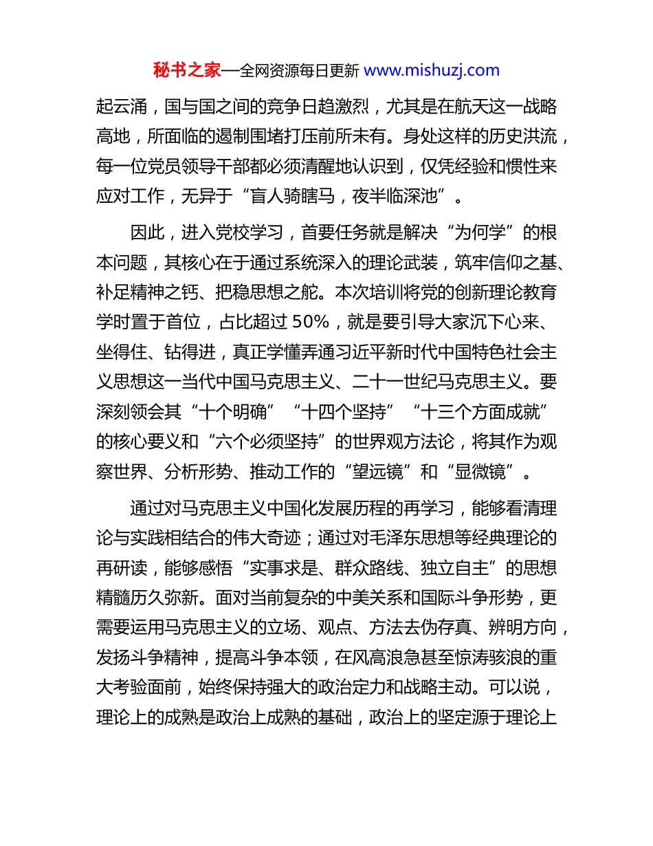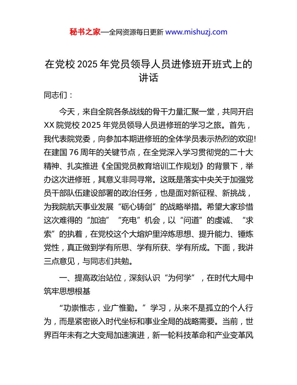 秘书之家—全网资源每日更新 www.mishuzj.com在党校 2025 年党员领导人员进修班开班式上的讲话同志们:今天,来自全院各条战线的骨干力量汇聚一堂,共同开启XX 院党校 2025 年党员领导人员进修班的学习之旅。首先,我代表院党委,向参加本期进修班的全体学员表示热烈的欢迎!在建国 76 周年的关键节点,在全党深入学习贯彻党的二十大精神、扎实推进《全国党员教育培训工作规划》的背景下,举办这次进修班,其意义非同寻常。这既是落实中央关于加强党员干部队伍建设部署的政治任务,也是面对新征程、新挑战,为我院航天事业发展“砺心铸剑”的战略举措。希望大家珍惜这次难得的“加油”“充电”机会,以“问道”的虔诚、“求索”的执着,在党校这个大熔炉里淬炼思想、提升能力、锤炼党性,真正做到学有所思、学有所获、学有所成。下面,我讲三点意见,与同志们共勉。一、提高政治站位,深刻认识“为何学”,在时代大局中筑牢思想根基“功崇惟志,业广惟勤。”学习,从来不是孤立的个人行为,而是紧密嵌入时代坐标和事业全局的战略需要。当前,世界百年未有之大变局加速演进,新一轮科技革命和产业变革风秘书之家—全网资源每日更新 www.mishuzj.com起云涌,国与国之间的竞争日趋激烈,尤其是在航天这一战略高地,所面临的遏制围堵打压前所未有。身处这样的历史洪流,每一位党员领导干部都必须清醒地认识到,仅凭经验和惯性来应对工作,无异于“盲人骑瞎马,夜半临深池”。因此,进入党校学习,首要任务就是解决“为何学”的根本问题,其核心在于通过系统深入的理论武装,筑牢信仰之基、补足精神之钙、把稳思想之舵。本次培训将党的创新理论教育学时置于首位,占比超过 50%,就是要引导大家沉下心来、坐得住、钻得进,真正学懂弄通习近平新时代中国特色社会主义思想这一当代中国马克思主义、二十一世纪马克思主义。要深刻领会其“十个明确”“十四个坚持”“十三个方面成就”的核心要义和“六个必须坚持”的世界观方法论,将其作为观察世界、分析形势、推动工作的“望远镜”和“显微镜”。通过对马克思主义中国化发展历程的再学习,能够看清理论与实践相结合的伟大奇迹;通过对毛泽东思想等经典理论的再研读,能够感悟“实事求是、群众路线、独立自主”的思想精髓历久弥新。面对当前复杂的中美关系和国际斗争形势,更需要运用马克思主义的立场、观点、方法去伪存真、辨明方向,发扬斗争精神,提高斗争本领,在风高浪急甚至惊涛骇浪的重大考验面前,始终保持强大的政治定力和战略主动。可以说,理论上的成熟是政治上成熟的基础,政治上的坚定源于理论上秘书之家—全网资源每日更新 www.mishuzj.com的清醒。这次学习,就是要帮助大家完成一次思想上的溯源、精神上的洗礼,从而更好地担当起时代赋予航天人的历史重任。二、聚焦能力短板,精准把握“学什么”,在攻坚克难中砥砺担当之肩“人能弘道,非道弘人。”在座的各位都是院各单位、各部门的中坚力量,在各自岗位上取得了不俗的成绩。但必须认识到,知识结构、能力素养和本领恐慌是动态变化的。根据集团公司 2025 年最新的干部能力评估分析和院内调研情况,当前我院部分领导干部在适应高质量发展要求方面,还存在一些亟待补齐的能力短板。本次进修班的课程设置,正是聚焦这些“短板”和“痛点”,力求精准施教、靶向赋能。一是要着力提升驾驭复杂局面的战略决策能力。航天事业是系统工程,领导干部不能只埋头于具体业务,更要抬头看路、谋划全局。面对资源约束、技术瓶颈和外部风险交织的复杂环境,如何做出最优决策?课程中专门设置了《管理者的博弈思维和科学决策》等内容,就是要引导大家跳出传统思维定式,学会运用科学工具进行系统分析、权衡利弊,在多重目标和约束条件下找到最优解,提高决策的科学性、预见性和有效性。二是要着力提升贯通融合发展的系统集成能力。随着新型号、新项目的不断涌现,跨领域、跨部门的协同作战已成常态。然而,“各扫门前雪”“信息壁垒”“协同效率不高”等问题秘书之家—全网资源每日更新 www.mishuzj.com依然存在。这就要求领导干部必须具备强大的系统集成能力。课程体系中的《从...
