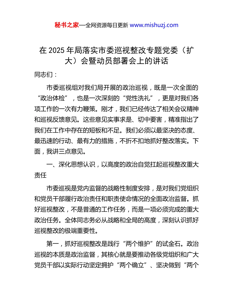 秘书之家—全网资源每日更新 www.mishuzj.com在 2025 年局落实市委巡视整改专题党委(扩大)会暨动员部署会上的讲话同志们:市委巡视组对我们局开展的政治巡视,既是一次全面的“政治体检”,也是一次深刻的“党性洗礼”,更是对我们各项工作的一次有力鞭策。刚才,我们已经传达了相关会议精神和巡视反馈意见。这些意见实事求是、切中要害,精准指出了我们在工作中存在的短板和不足。我们必须以最坚决的态度、最迅速的行动、最有力的措施,不折不扣地抓好整改落实。下面,我讲三点意见。一、深化思想认识,以高度的政治自觉扛起巡视整改重大责任市委巡视是党内监督的战略性制度安排,是对我们党组织和党员干部履行政治责任和职责使命情况的全面政治监督。抓好巡视整改,不是普通的工作任务,而是一项必须完成的重大政治任务。全体同志务必从战略和全局的高度,深刻认识抓好巡视整改的极端重要性。第一,抓好巡视整改是践行“两个维护”的试金石。政治巡视的本质是政治监督,其核心就是要推动各级党组织和广大党员干部以实际行动坚定拥护“两个确立”、坚决做到“两个秘书之家—全网资源每日更新 www.mishuzj.com维护”。巡视反馈的每一个问题,都从不同侧面反映出我们在政治站位、政治意识、政治能力上可能存在的差距。能否正视问题、直面问题,能否以“刮骨疗毒”的勇气和“壮士断腕”的决心来解决问题,直接检验着我们的政治忠诚度、政治判断力、政治领悟力、政治执行力。我们必须把巡视整改作为一次深刻的政治淬炼,把整改成效作为衡量对党忠诚与否的重要标尺,通过扎扎实实的整改,确保党的路线方针政策和党中央、市委的决策部署在*市司法行政系统得到不折不扣的贯彻执行。第二,抓好巡视整改是推进全面从严治党的关键环节。党的自我革命是我们党跳出治乱兴衰历史周期率的第二个答案。巡视是推进党的自我革命、全面从严治党的战略性利器。巡视发现问题是为了解决问题,发现问题的“前半篇文章”做得好不好,关键要看整改这“后半篇文章”做得实不实。如果对巡视反馈的问题视而不见、敷衍了事,甚至“新官不理旧账”,那么巡视的震慑作用就会大打折扣,全面从严治党就会成为一句空话。我们必须深刻认识到,巡视整改的过程,就是强化纪律规矩、净化政治生态、修复制度漏洞的过程。要通过整改,让纪律真正成为带电的“高压线”,让管党治党从“宽松软”走向“严紧硬”,持续巩固和发展我们系统风清气正的良好政治生态。第三,抓好巡视整改是推动司法行政工作高质量发展的强大动力。当前,我市正处在奋力推进现代化新*建设的关键时秘书之家—全网资源每日更新 www.mishuzj.com期,对法治建设提出了新的更高要求。巡视反馈的问题,表面上看是具体业务或管理上的瑕疵,但根源上都与我们的工作理念、工作作风、发展方式密切相关,是制约司法行政事业高质量发展的堵点和痛点。我们不能就问题改问题,必须把巡视整改与贯彻落实习近平法治思想结合起来,与服务保障全市中心工作结合起来,与深化司法行政领域改革结合起来。要善于从政治巡视反馈的问题中,找准改革攻坚的突破口和制度创新的着力点,通过整改一个问题,带动解决一类问题,完善一批制度,从而将整改成果转化为提升依法治市水平、优化法治化营商环境、增强人民群众法治获得感的实际成效,为现代化新*建设提供更加坚实的法治保障。二、聚焦核心问题,以刀刃向内的勇气抓好巡视反馈精准整改市委巡视组反馈的意见,聚焦六个方面,为我们精准“画像”,问题点得准、点得深、点得实。我们必须坚持问题导向,拿出“不贰过”的决心,聚焦反馈意见,逐条逐项对照检查,动真碰硬、精准发力,确保问题整改清仓见底、见到实效。(一)在贯彻落实上级决策部署上要见行见效。巡视反馈指出我们在学懂弄通做实习近平法治思想、服务保障全市重大战略等方面还存在差距。对此,必须在“结合”与“转化”上狠下功夫。理论学习不能停留在读文件、记笔记的层面,要真秘书之家—全网资源每日更新 www.mishuzj.com正内化于心、外化于行。要紧密围绕市委、市政府关于西部陆海新通道、成渝地区双城经济圈、数字*等重大战略部署,主动思考、主动谋...