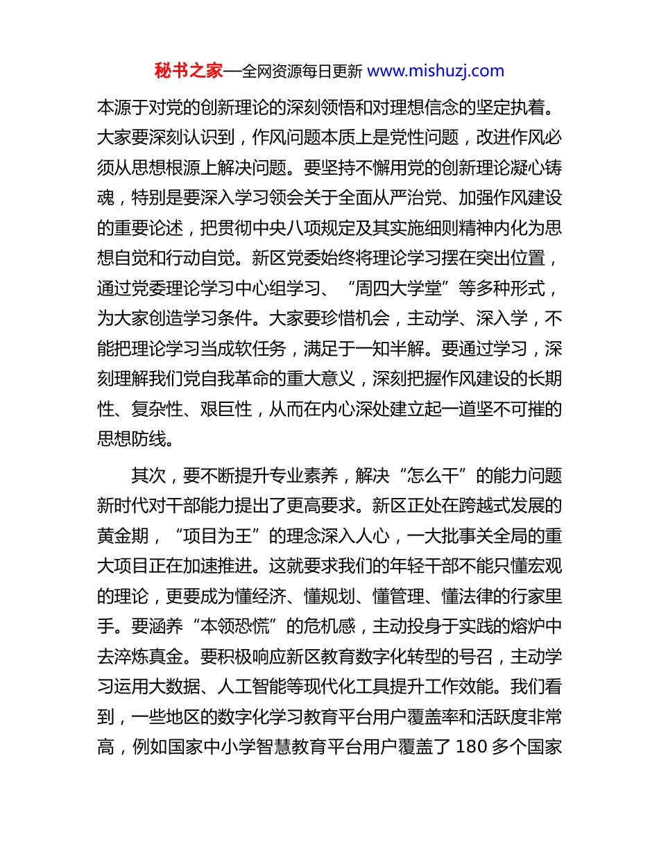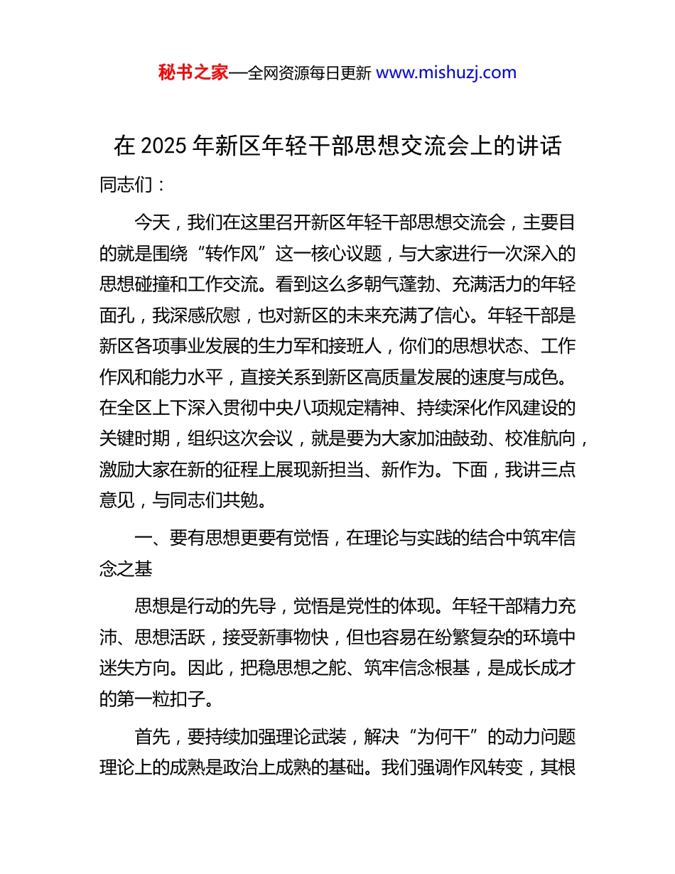 秘书之家—全网资源每日更新 www.mishuzj.com在 2025 年新区年轻干部思想交流会上的讲话同志们:今天,我们在这里召开新区年轻干部思想交流会,主要目的就是围绕“转作风”这一核心议题,与大家进行一次深入的思想碰撞和工作交流。看到这么多朝气蓬勃、充满活力的年轻面孔,我深感欣慰,也对新区的未来充满了信心。年轻干部是新区各项事业发展的生力军和接班人,你们的思想状态、工作作风和能力水平,直接关系到新区高质量发展的速度与成色。在全区上下深入贯彻中央八项规定精神、持续深化作风建设的关键时期,组织这次会议,就是要为大家加油鼓劲、校准航向,激励大家在新的征程上展现新担当、新作为。下面,我讲三点意见,与同志们共勉。一、要有思想更要有觉悟,在理论与实践的结合中筑牢信念之基思想是行动的先导,觉悟是党性的体现。年轻干部精力充沛、思想活跃,接受新事物快,但也容易在纷繁复杂的环境中迷失方向。因此,把稳思想之舵、筑牢信念根基,是成长成才的第一粒扣子。首先,要持续加强理论武装,解决“为何干”的动力问题理论上的成熟是政治上成熟的基础。我们强调作风转变,其根秘书之家—全网资源每日更新 www.mishuzj.com本源于对党的创新理论的深刻领悟和对理想信念的坚定执着。大家要深刻认识到,作风问题本质上是党性问题,改进作风必须从思想根源上解决问题。要坚持不懈用党的创新理论凝心铸魂,特别是要深入学习领会关于全面从严治党、加强作风建设的重要论述,把贯彻中央八项规定及其实施细则精神内化为思想自觉和行动自觉。新区党委始终将理论学习摆在突出位置,通过党委理论学习中心组学习、“周四大学堂”等多种形式,为大家创造学习条件。大家要珍惜机会,主动学、深入学,不能把理论学习当成软任务,满足于一知半解。要通过学习,深刻理解我们党自我革命的重大意义,深刻把握作风建设的长期性、复杂性、艰巨性,从而在内心深处建立起一道坚不可摧的思想防线。其次,要不断提升专业素养,解决“怎么干”的能力问题新时代对干部能力提出了更高要求。新区正处在跨越式发展的黄金期,“项目为王”的理念深入人心,一大批事关全局的重大项目正在加速推进。这就要求我们的年轻干部不能只懂宏观的理论,更要成为懂经济、懂规划、懂管理、懂法律的行家里手。要涵养“本领恐慌”的危机感,主动投身于实践的熔炉中去淬炼真金。要积极响应新区教育数字化转型的号召,主动学习运用大数据、人工智能等现代化工具提升工作效能。我们看到,一些地区的数字化学习教育平台用户覆盖率和活跃度非常高,例如国家中小学智慧教育平台用户覆盖了 180 多个国家秘书之家—全网资源每日更新 www.mishuzj.com和地区,某些市级党员远程教育平台注册用户超过百万。我们新区也要加快建设类似的数字化干部学习平台,为大家提供更便捷、高效的学习渠道,希望大家能主动拥抱数字化浪潮,成为善用现代技术解决实际问题的复合型人才。同时,要向实践学习,向群众学习。新区推行的“项目首席负责制”就是一个极好的锻炼平台,它要求年轻干部直面招商引资、征地拆迁、企业帮办等一线工作的复杂局面,这正是大家提升实践能力的“练兵场”。最后,要始终涵养为民情怀,解决“为谁干”的立场问题我们党的根基在人民、血脉在人民、力量在人民。作风好不好,最终要由人民群众来评判。年轻干部要牢固树立以人民为中心的发展思想,把群众的“表情包”当作工作的“晴雨表”。要学习我们队伍里那些扎根基层的先进典型,有的同志经过一年的基层锻炼,更加坚定了服务群众的决心。这说明,只有真正走到群众中去,才能理解群众的急难愁盼。新区开展的“开门教育群众点题作风整治”活动,梳理出了一批群众最关心、最直接、最现实的利益问题,比如老旧小区停车难、充电桩不足、雨污管网不畅等。解决这些具体问题,就是转变作风最生动的实践。大家要主动下沉一线,多到项目现场、田间地头、群众家中去,听真话、察实情,用心用情用力解决好群众的烦心事、揪心事,在服务群众中找到自身价值,赢得群众的信任和支持。秘书之家—全网资源每日更新 www.mishuzj.com二、要有活力更要有定力,在攻坚克难...