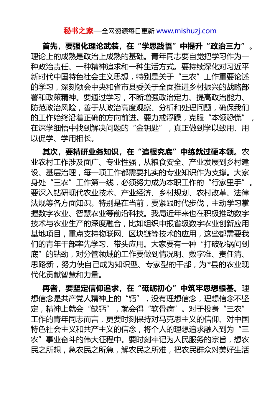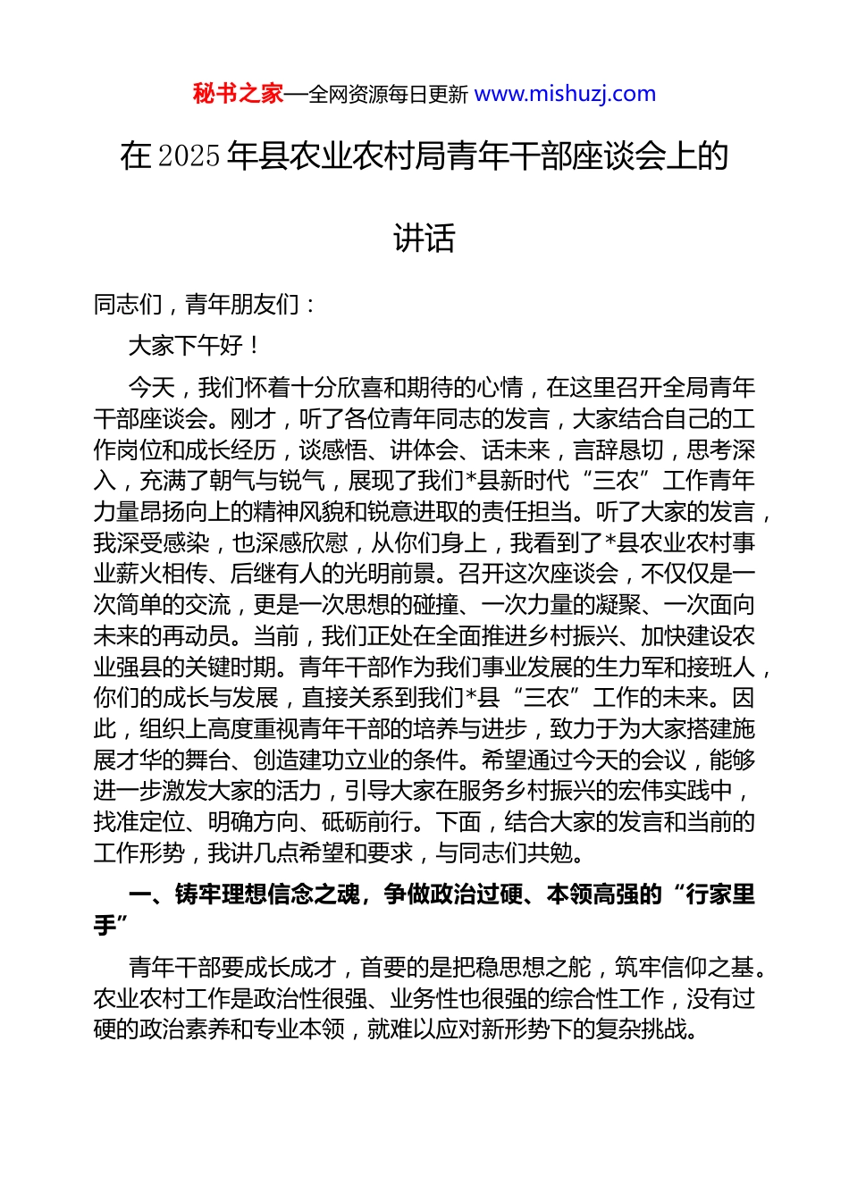 秘书之家—全网资源每日更新 www.mishuzj.com在 2025 年县农业农村局青年干部座谈会上的讲话同志们,青年朋友们:大家下午好!今天,我们怀着十分欣喜和期待的心情,在这里召开全局青年干部座谈会。刚才,听了各位青年同志的发言,大家结合自己的工作岗位和成长经历,谈感悟、讲体会、话未来,言辞恳切,思考深入,充满了朝气与锐气,展现了我们*县新时代“三农”工作青年力量昂扬向上的精神风貌和锐意进取的责任担当。听了大家的发言,我深受感染,也深感欣慰,从你们身上,我看到了*县农业农村事业薪火相传、后继有人的光明前景。召开这次座谈会,不仅仅是一次简单的交流,更是一次思想的碰撞、一次力量的凝聚、一次面向未来的再动员。当前,我们正处在全面推进乡村振兴、加快建设农业强县的关键时期。青年干部作为我们事业发展的生力军和接班人,你们的成长与发展,直接关系到我们*县“三农”工作的未来。因此,组织上高度重视青年干部的培养与进步,致力于为大家搭建施展才华的舞台、创造建功立业的条件。希望通过今天的会议,能够进一步激发大家的活力,引导大家在服务乡村振兴的宏伟实践中,找准定位、明确方向、砥砺前行。下面,结合大家的发言和当前的工作形势,我讲几点希望和要求,与同志们共勉。一、铸牢理想信念之魂,争做政治过硬、本领高强的“行家里手”青年干部要成长成才,首要的是把稳思想之舵,筑牢信仰之基。农业农村工作是政治性很强、业务性也很强的综合性工作,没有过硬的政治素养和专业本领,就难以应对新形势下的复杂挑战。秘书之家—全网资源每日更新 www.mishuzj.com首先,要强化理论武装,在“学思践悟”中提升“政治三力”。理论上的成熟是政治上成熟的基础。青年同志要自觉把学习作为一种政治责任、一种精神追求和一种生活方式。要持续深化对习近平新时代中国特色社会主义思想,特别是关于“三农”工作重要论述的学习,深刻领会中央和省市县委关于全面推进乡村振兴的战略部署和政策精神。要通过学习,不断增强政治定力、提高政治能力、防范政治风险,善于从政治高度观察、分析和处理问题,确保我们的工作始终沿着正确的方向前进。要力戒浮躁,克服“本领恐慌”,在深学细悟中找到解决问题的“金钥匙”,真正做到学以致用、用以促学、学用相长。其次,要精研业务知识,在“追根究底”中练就过硬本领。农业农村工作涉及面广、专业性强,从粮食安全、产业发展到乡村建设、基层治理,每一项工作都需要扎实的专业知识作为支撑。大家身处“三农”工作第一线,必须努力成为本职工作的“行家里手”。要深入钻研现代农业技术、产业经济、乡村规划、农村改革、法律法规等各方面知识。特别是在当前,要紧跟时代步伐,主动学习掌握数字农业、智慧农业等前沿科技。我局近年来也在积极推动数字技术与农业生产的深度融合,比如组织申报省级数字农业创新应用基地项目,重点支持物联网、区块链等技术的应用,这些都需要我们的青年干部率先学习、带头应用。大家要有一种“打破砂锅问到底”的钻劲,对分管领域的工作要做到情况明、数字准、责任清、思路新,努力使自己成为知识型、专家型的干部,为*县的农业现代化贡献智慧和力量。再者,要坚定信仰追求,在“砥砺初心”中筑牢思想根基。理想信念是共产党人精神上的“钙”,没有理想信念,理想信念不坚定,精神上就会“缺钙”,就会得“软骨病”。对于投身“三农”工作的青年同志而言,更要时刻保持对马克思主义的信仰、对中国特色社会主义和共产主义的信念,将个人的理想追求融入到为“三农”事业奋斗的伟大征程中。要时刻牢记为人民服务的宗旨,想农民之所想,急农民之所急,解农民之所难,把农民群众对美好生活秘书之家—全网资源每日更新 www.mishuzj.com的向往作为奋斗目标。要通过参加主题党日活动、重温入党誓词等形式,不断回顾初心、感悟使命,在思想上、行动上与党中央保持高度一致,以坚定的信仰和饱满的热情,全身心投入到乡村振兴的火热实践中,在服务“三农”的道路上书写无愧于时代的青春华章。二、勇于担当作为之肩,在乡村振兴的广阔舞台上建功立业“纸上得来终觉浅,绝知此事要躬行。”青年干部...