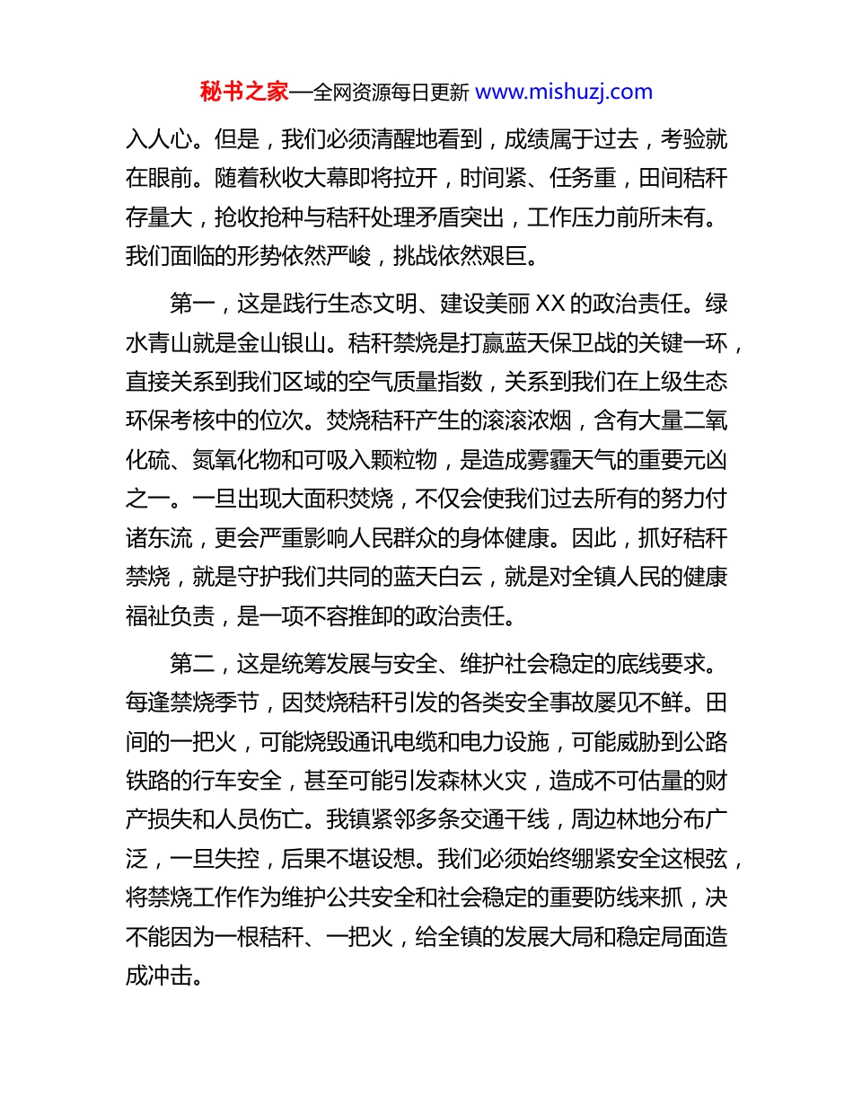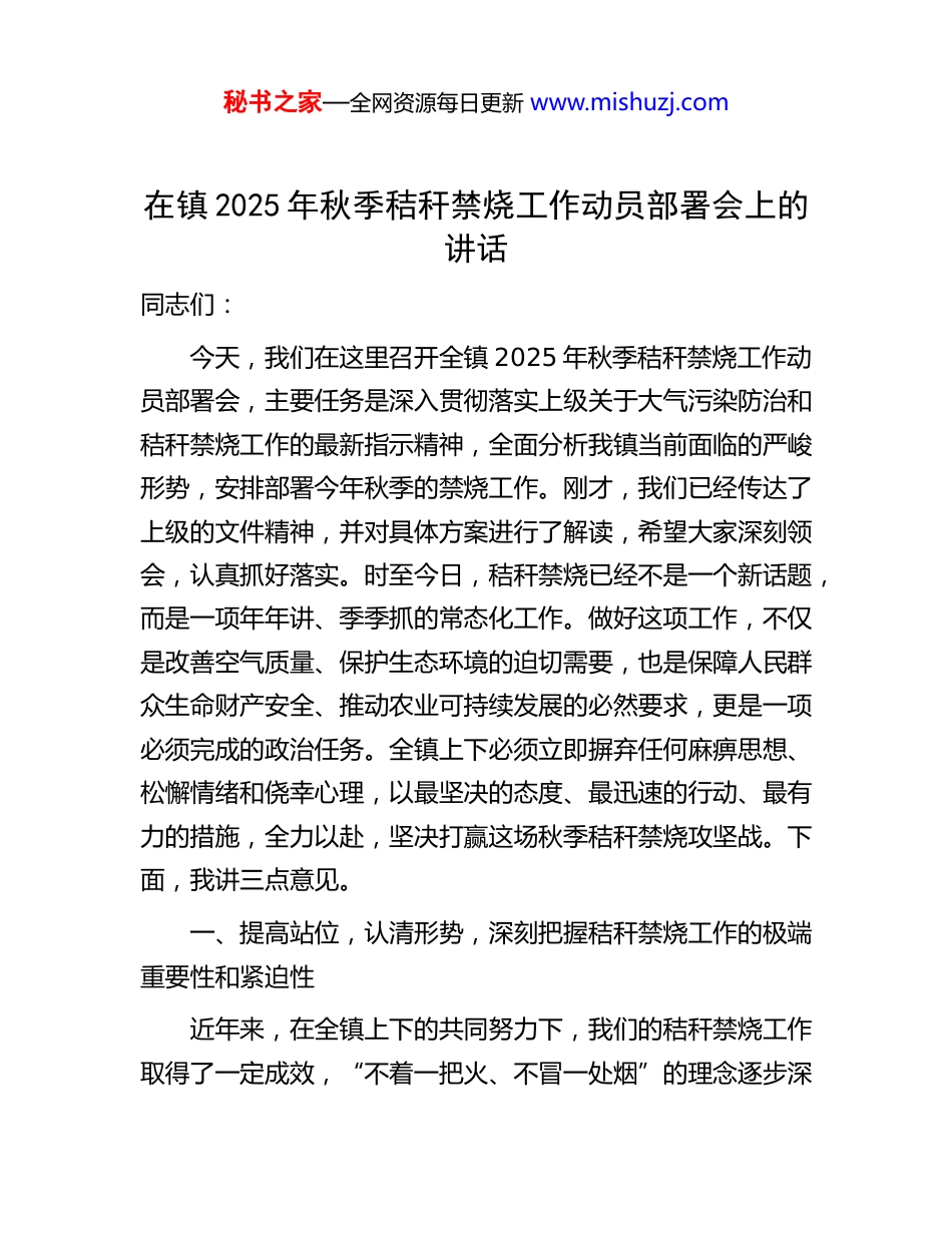 秘书之家—全网资源每日更新 www.mishuzj.com在镇 2025 年秋季秸秆禁烧工作动员部署会上的讲话同志们:今天,我们在这里召开全镇 2025 年秋季秸秆禁烧工作动员部署会,主要任务是深入贯彻落实上级关于大气污染防治和秸秆禁烧工作的最新指示精神,全面分析我镇当前面临的严峻形势,安排部署今年秋季的禁烧工作。刚才,我们已经传达了上级的文件精神,并对具体方案进行了解读,希望大家深刻领会,认真抓好落实。时至今日,秸秆禁烧已经不是一个新话题,而是一项年年讲、季季抓的常态化工作。做好这项工作,不仅是改善空气质量、保护生态环境的迫切需要,也是保障人民群众生命财产安全、推动农业可持续发展的必然要求,更是一项必须完成的政治任务。全镇上下必须立即摒弃任何麻痹思想、松懈情绪和侥幸心理,以最坚决的态度、最迅速的行动、最有力的措施,全力以赴,坚决打赢这场秋季秸秆禁烧攻坚战。下面,我讲三点意见。一、提高站位,认清形势,深刻把握秸秆禁烧工作的极端重要性和紧迫性近年来,在全镇上下的共同努力下,我们的秸秆禁烧工作取得了一定成效,“不着一把火、不冒一处烟”的理念逐步深秘书之家—全网资源每日更新 www.mishuzj.com入人心。但是,我们必须清醒地看到,成绩属于过去,考验就在眼前。随着秋收大幕即将拉开,时间紧、任务重,田间秸秆存量大,抢收抢种与秸秆处理矛盾突出,工作压力前所未有。我们面临的形势依然严峻,挑战依然艰巨。第一,这是践行生态文明、建设美丽 XX 的政治责任。绿水青山就是金山银山。秸秆禁烧是打赢蓝天保卫战的关键一环,直接关系到我们区域的空气质量指数,关系到我们在上级生态环保考核中的位次。焚烧秸秆产生的滚滚浓烟,含有大量二氧化硫、氮氧化物和可吸入颗粒物,是造成雾霾天气的重要元凶之一。一旦出现大面积焚烧,不仅会使我们过去所有的努力付诸东流,更会严重影响人民群众的身体健康。因此,抓好秸秆禁烧,就是守护我们共同的蓝天白云,就是对全镇人民的健康福祉负责,是一项不容推卸的政治责任。第二,这是统筹发展与安全、维护社会稳定的底线要求。每逢禁烧季节,因焚烧秸秆引发的各类安全事故屡见不鲜。田间的一把火,可能烧毁通讯电缆和电力设施,可能威胁到公路铁路的行车安全,甚至可能引发森林火灾,造成不可估量的财产损失和人员伤亡。我镇紧邻多条交通干线,周边林地分布广泛,一旦失控,后果不堪设想。我们必须始终绷紧安全这根弦,将禁烧工作作为维护公共安全和社会稳定的重要防线来抓,决不能因为一根秸秆、一把火,给全镇的发展大局和稳定局面造成冲击。秘书之家—全网资源每日更新 www.mishuzj.com第三,这是推动资源化利用、促进农业高质量发展的转型契机。秸秆是“放错地方的资源”。长期以来,部分群众习惯于“一烧了之”,既浪费了宝贵的生物质资源,也造成了严重的环境污染。我们必须转变观念,将秸秆禁烧的过程,转变为推动秸秆综合利用的过程。要大力推广秸秆的“五化”利用,即肥料化、饲料化、燃料化、原料化、基料化。通过科学还田,可以培肥地力,实现农业的绿色循环发展;通过加工成饲料、燃料,可以为养殖业和清洁能源产业提供支持;通过用作工业原料和食用菌基料,可以延长农业产业链,增加农民收入。根据相关测算,一些地区通过科学规划和产业带动,秸秆综合利用率已稳定在 95%以上,甚至超过 97%。这充分说明,秸秆里有文章可做,有产业可兴,有财富可挖。我们必须抓住这个契机,化“包袱”为财富,推动我镇农业发展方式的深刻变革。二、聚焦关键,精准发力,全面落实秸秆禁烧与综合利用的各项举措打赢秋季秸秆禁烧攻坚战,必须坚持疏堵结合、标本兼治的原则,在“宣、用、管、查”四个字上下足功夫,构建起“不能烧、不愿烧、不敢烧”的工作闭环。第一,突出“宣”字为先,营造全域覆盖、家喻户晓的禁烧氛围。宣传引导是做好一切群众工作的基础。要迅速掀起新一轮的宣传高潮,让禁烧政策法规真正走进千家万户,根植于秘书之家—全网资源每日更新 www.mishuzj.com群众心中。一是宣传形式要“立体化”。要立即行动起来,更新全镇所有的宣传牌,在各村主干道、田间地头等醒目...