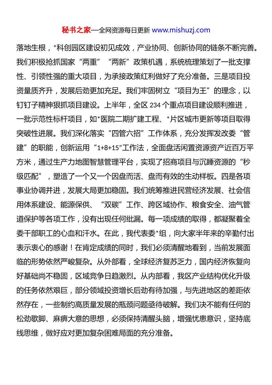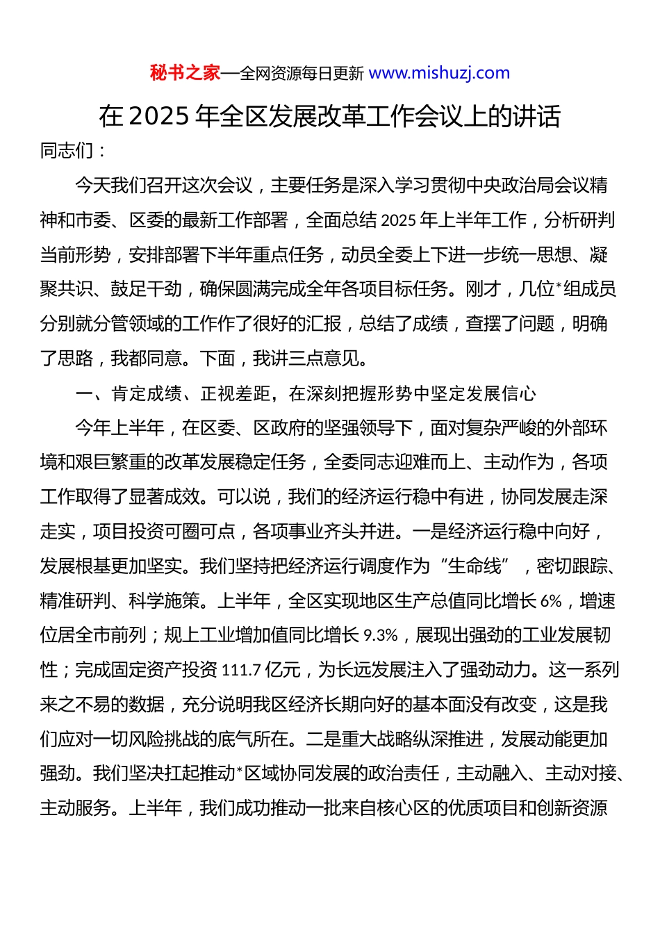 秘书之家—全网资源每日更新 www.mishuzj.com在 2025 年全区发展改革工作会议上的讲话同志们:今天我们召开这次会议,主要任务是深入学习贯彻中央政治局会议精神和市委、区委的最新工作部署,全面总结 2025 年上半年工作,分析研判当前形势,安排部署下半年重点任务,动员全委上下进一步统一思想、凝聚共识、鼓足干劲,确保圆满完成全年各项目标任务。刚才,几位*组成员分别就分管领域的工作作了很好的汇报,总结了成绩,查摆了问题,明确了思路,我都同意。下面,我讲三点意见。一、肯定成绩、正视差距,在深刻把握形势中坚定发展信心今年上半年,在区委、区政府的坚强领导下,面对复杂严峻的外部环境和艰巨繁重的改革发展稳定任务,全委同志迎难而上、主动作为,各项工作取得了显著成效。可以说,我们的经济运行稳中有进,协同发展走深走实,项目投资可圈可点,各项事业齐头并进。一是经济运行稳中向好,发展根基更加坚实。我们坚持把经济运行调度作为“生命线”,密切跟踪、精准研判、科学施策。上半年,全区实现地区生产总值同比增长 6%,增速位居全市前列;规上工业增加值同比增长 9.3%,展现出强劲的工业发展韧性;完成固定资产投资 111.7 亿元,为长远发展注入了强劲动力。这一系列来之不易的数据,充分说明我区经济长期向好的基本面没有改变,这是我们应对一切风险挑战的底气所在。二是重大战略纵深推进,发展动能更加强劲。我们坚决扛起推动*区域协同发展的政治责任,主动融入、主动对接、主动服务。上半年,我们成功推动一批来自核心区的优质项目和创新资源秘书之家—全网资源每日更新 www.mishuzj.com落地生根,*科创园区建设初见成效,产业协同、创新协同的链条不断完善。我们积极抢抓国家“两重”“两新”政策机遇,系统梳理策划了一批支撑性、引领性强的重大项目,为承接政策红利做好了充分准备。三是项目投资量质齐升,发展后劲更加充足。我们牢固树立“项目为王”的理念,以钉钉子精神狠抓项目建设。上半年,全区 234 个重点项目建设顺利推进,一批示范性标杆项目,如*医院二期扩建工程、*片区城市更新等项目取得突破性进展。我们深化落实“四管六招”工作体系,充分发挥发改委“管建”的职能,创新运用“1+8+15”工作法,全面盘活闲置资源资产近百万平方米,通过生产力地图智慧管理平台,实现了招商项目与沉睡资源的“秒级匹配”,塑造了一个又一个因盘而活、盘而有效的生动样板。四是各项事业协调并进,发展大局更加稳固。我们统筹推进民营经济发展、社会信用体系建设、能源保供、“双碳”工作、跨区域协作、粮食安全、油气管道保护等各项工作,没有出现任何纰漏。每一项成绩的取得,都凝聚着全委干部职工的心血和汗水。在此,我代表委*组,向大家半年来的辛勤付出表示衷心的感谢!在肯定成绩的同时,我们必须清醒地看到,当前发展面临的形势依然严峻复杂。从外部看,全球经济复苏乏力,国内经济恢复向好基础尚不稳固,区域竞争日趋激烈。从内部看,我区产业结构优化升级的任务依然艰巨,部分领域投资增长后劲有待加强,与先进地区的差距依然存在,一些制约高质量发展的瓶颈问题亟待破解。我们决不能有任何的松劲歇脚、麻痹大意的思想,必须保持清醒头脑,增强忧患意识,坚持底线思维,做好应对更加复杂困难局面的充分准备。秘书之家—全网资源每日更新 www.mishuzj.com二、聚焦重点、精准发力,在服务中心大局中展现发改担当下半年是决定全年目标能否实现的关键时期,更是为“十五五”开局起步奠定坚实基础的攻坚阶段。全委上下必须把思想和行动统一到*中央的决策部署和市、区委的工作要求上来,紧紧围绕全区中心工作,以更加昂扬的斗志、更加务实的作风,全力以赴抓好各项工作落实。第一,要以更高站位融入区域协同发展,在构建新发展格局上取得新突破。*区域协同发展是重大国家战略,也是我区发展的最大机遇。我们不能满足于承接项目,更要着眼于深度融合。要持续深化与核心区相关部门的战略对接,推动从“项目协同”向“产业生态协同”和“制度创新协同”迈进。要聚焦重点产业链,吸引和集聚更多高端要素和创新资源,努力在区域产业链分工中占...
