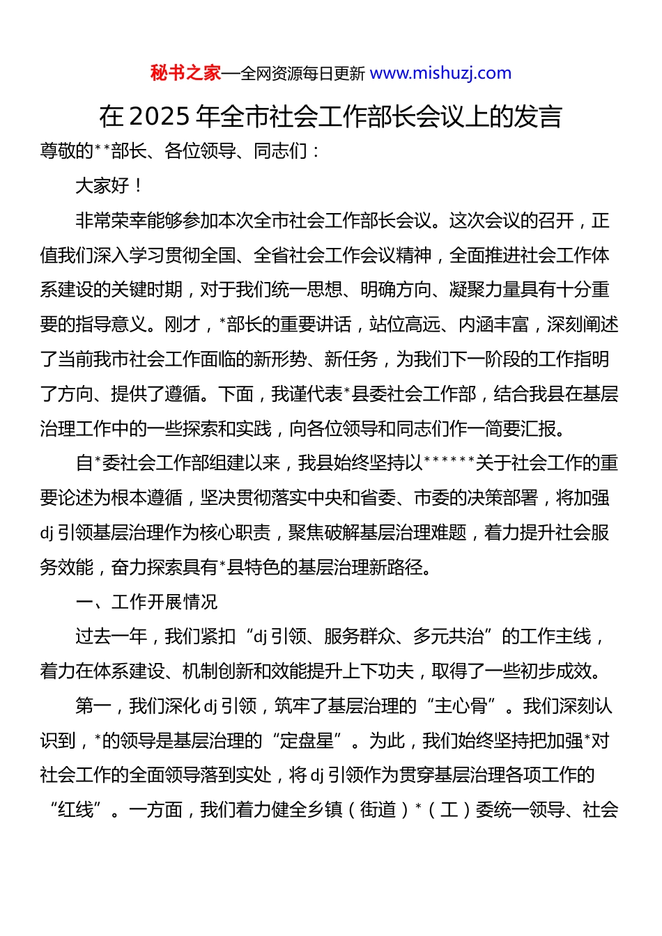 秘书之家—全网资源每日更新 www.mishuzj.com在 2025 年全市社会工作部长会议上的发言尊敬的**部长、各位领导、同志们:大家好!非常荣幸能够参加本次全市社会工作部长会议。这次会议的召开,正值我们深入学习贯彻全国、全省社会工作会议精神,全面推进社会工作体系建设的关键时期,对于我们统一思想、明确方向、凝聚力量具有十分重要的指导意义。刚才,*部长的重要讲话,站位高远、内涵丰富,深刻阐述了当前我市社会工作面临的新形势、新任务,为我们下一阶段的工作指明了方向、提供了遵循。下面,我谨代表*县委社会工作部,结合我县在基层治理工作中的一些探索和实践,向各位领导和同志们作一简要汇报。自*委社会工作部组建以来,我县始终坚持以******关于社会工作的重要论述为根本遵循,坚决贯彻落实中央和省委、市委的决策部署,将加强dj 引领基层治理作为核心职责,聚焦破解基层治理难题,着力提升社会服务效能,奋力探索具有*县特色的基层治理新路径。一、工作开展情况过去一年,我们紧扣“dj 引领、服务群众、多元共治”的工作主线,着力在体系建设、机制创新和效能提升上下功夫,取得了一些初步成效。第一,我们深化 dj 引领,筑牢了基层治理的“主心骨”。我们深刻认识到,*的领导是基层治理的“定盘星”。为此,我们始终坚持把加强*对社会工作的全面领导落到实处,将 dj 引领作为贯穿基层治理各项工作的“红线”。一方面,我们着力健全乡镇(街道)*(工)委统一领导、社会秘书之家—全网资源每日更新 www.mishuzj.com工作部门统筹协调的基层治理体制,指导全县所有村(社区)完成*组织领导下的基层群众自治机制的优化完善,确保*组织在基层治理中的领导核心地位不动摇。另一方面,我们大力推进在新经济组织、新社会组织、新就业群体中的 dj 工作,即“两新一新”dj。通过建立流动*员驿站、行业 dj 联盟等方式,将*的组织和工作有效覆盖到快递小哥、外卖配送员、网约车司机等新就业群体中,年内新建“两新”*组织 35 个,覆盖从业人员超过3000 人,真正把*的政治优势和组织优势转化为治理效能。第二,我们聚焦减负增效,激活了基层运转的“源动力”。针对长期困扰基层的“小马拉大车”、权责不对等问题,我们牵头开展了为期半年的专项整治行动。通过全面梳理、精准施策,我们推动市级层面调整下放了涉及民生服务、综合执法等领域的 28 项权限,确保权随事走、费随事转。同时,我们大力清理规范了村(社区)级的各类议事协调机构和工作台账,压减比例超过 40%,并建立起准入制度,有效遏制了形式主义和不必要的负担向基层蔓延。通过这一系列“减法”,基层干部从繁杂的事务性工作中解放出来,有更多的时间和精力深入群众、服务群众,基层的运转效能和干事创业活力得到显著提升。第三,我们创新服务模式,提升了民生福祉的“幸福感”。我们坚持以人民为中心的发展思想,推动治理重心下移、资源下沉。借鉴先进地区的“枫桥经验”,我们整合综治、信访、司法、人社等部门力量,在全县12 个乡镇(街道)全面建成“一站式”社会矛盾纠纷调处化解中心。过去一年,全县各级调解组织累计受理和化解各类社会矛盾纠纷超过 1120 件,秘书之家—全网资源每日更新 www.mishuzj.com调解成功率达到 95%以上,实现了“小事不出村、大事不出镇、矛盾不上交”的目标。在服务群众方面,我们依托*群服务中心和新时代文明实践站,整合各类服务资源,打造了“15 分钟便民服务圈”。通过线上“智慧社区”平台和线下网格员走访,累计开展各类群众服务活动超过 8000 次,服务群众超过 10 万人次,群众对社区服务的综合满意度稳定在 98%以上。综合来看,人民群众的获得感、幸福感、安全感更加充实。第四,我们注重队伍建设,夯实了社会工作人才的“奠基石”。基层治理的现代化,关键在人才。我们高度重视社会工作人才队伍的专业化、职业化建设。年内,我们组织了 2 期全县社区工作者能力提升专题培训班,覆盖超过 500 名社区“两委”干部和专职网格员。同时,我们积极与高校合作,建立了社会工作专业实习基地,并首次面向社会公开招募了 20 名持证专业社工,充...