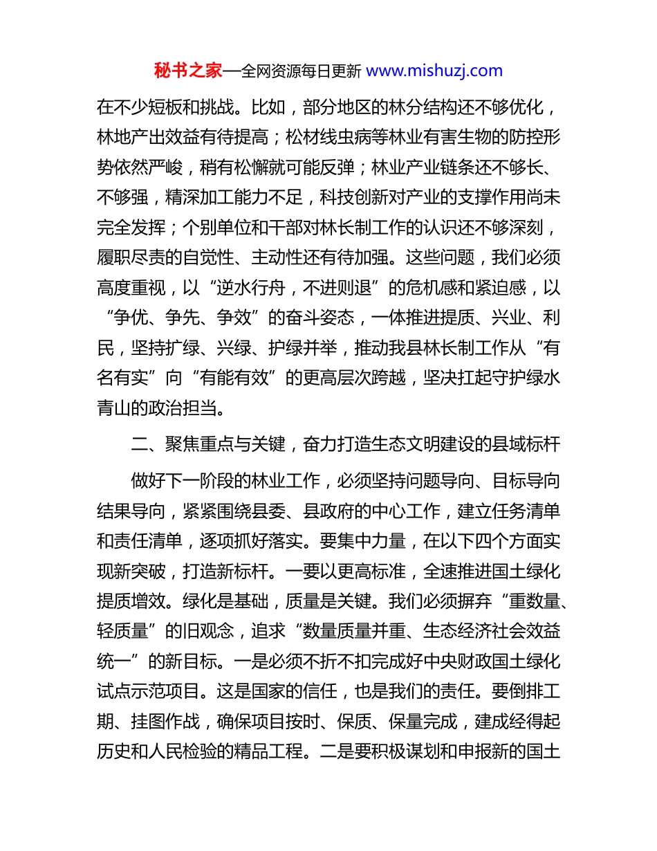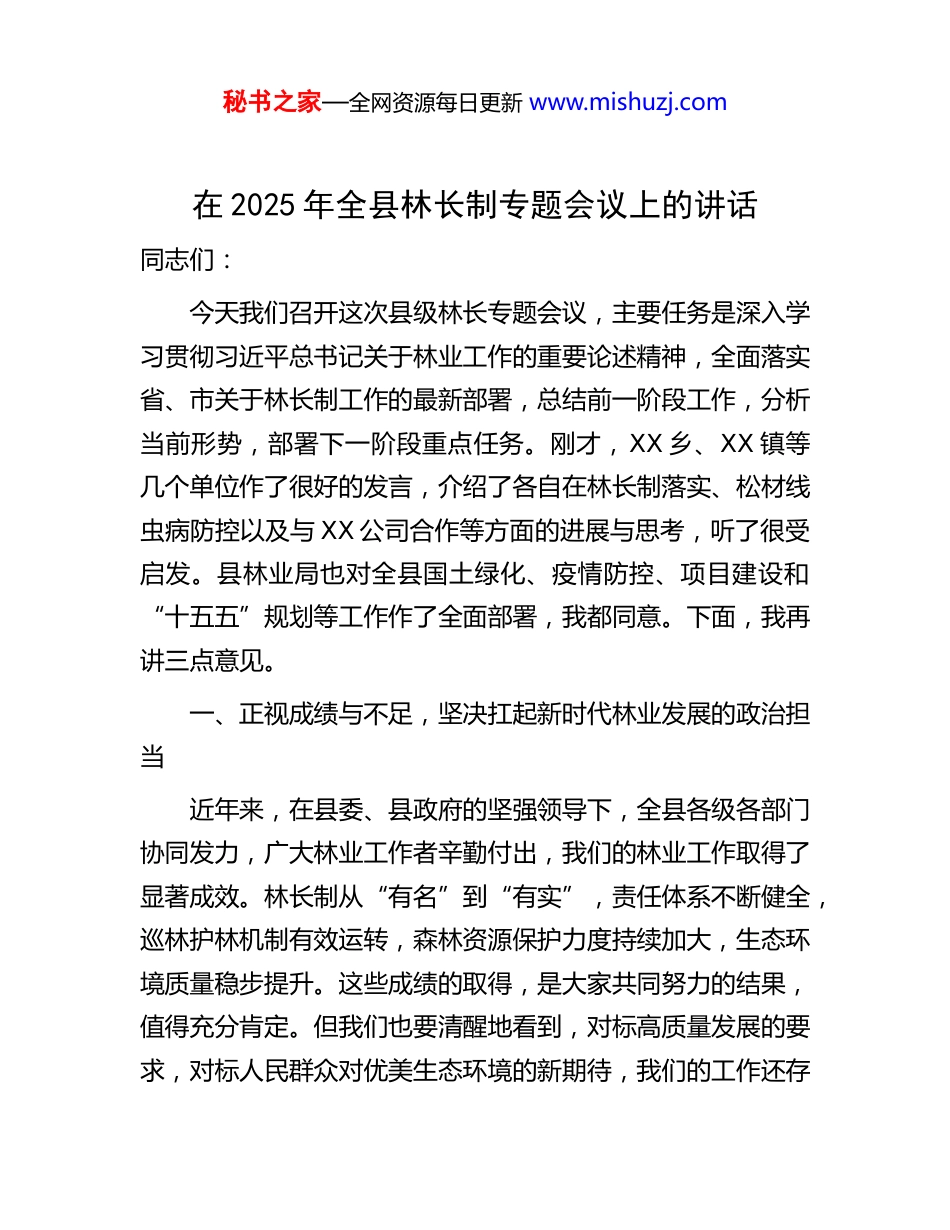 秘书之家—全网资源每日更新 www.mishuzj.com在 2025 年全县林长制专题会议上的讲话同志们:今天我们召开这次县级林长专题会议,主要任务是深入学习贯彻习近平总书记关于林业工作的重要论述精神,全面落实省、市关于林长制工作的最新部署,总结前一阶段工作,分析当前形势,部署下一阶段重点任务。刚才,XX 乡、XX 镇等几个单位作了很好的发言,介绍了各自在林长制落实、松材线虫病防控以及与 XX 公司合作等方面的进展与思考,听了很受启发。县林业局也对全县国土绿化、疫情防控、项目建设和“十五五”规划等工作作了全面部署,我都同意。下面,我再讲三点意见。一、正视成绩与不足,坚决扛起新时代林业发展的政治担当近年来,在县委、县政府的坚强领导下,全县各级各部门协同发力,广大林业工作者辛勤付出,我们的林业工作取得了显著成效。林长制从“有名”到“有实”,责任体系不断健全,巡林护林机制有效运转,森林资源保护力度持续加大,生态环境质量稳步提升。这些成绩的取得,是大家共同努力的结果,值得充分肯定。但我们也要清醒地看到,对标高质量发展的要求,对标人民群众对优美生态环境的新期待,我们的工作还存秘书之家—全网资源每日更新 www.mishuzj.com在不少短板和挑战。比如,部分地区的林分结构还不够优化,林地产出效益有待提高;松材线虫病等林业有害生物的防控形势依然严峻,稍有松懈就可能反弹;林业产业链条还不够长、不够强,精深加工能力不足,科技创新对产业的支撑作用尚未完全发挥;个别单位和干部对林长制工作的认识还不够深刻,履职尽责的自觉性、主动性还有待加强。这些问题,我们必须高度重视,以“逆水行舟,不进则退”的危机感和紧迫感,以“争优、争先、争效”的奋斗姿态,一体推进提质、兴业、利民,坚持扩绿、兴绿、护绿并举,推动我县林长制工作从“有名有实”向“有能有效”的更高层次跨越,坚决扛起守护绿水青山的政治担当。二、聚焦重点与关键,奋力打造生态文明建设的县域标杆做好下一阶段的林业工作,必须坚持问题导向、目标导向结果导向,紧紧围绕县委、县政府的中心工作,建立任务清单和责任清单,逐项抓好落实。要集中力量,在以下四个方面实现新突破,打造新标杆。一要以更高标准,全速推进国土绿化提质增效。绿化是基础,质量是关键。我们必须摒弃“重数量、轻质量”的旧观念,追求“数量质量并重、生态经济社会效益统一”的新目标。一是必须不折不扣完成好中央财政国土绿化试点示范项目。这是国家的信任,也是我们的责任。要倒排工期、挂图作战,确保项目按时、保质、保量完成,建成经得起历史和人民检验的精品工程。二是要积极谋划和申报新的国土秘书之家—全网资源每日更新 www.mishuzj.com绿化项目。要抢抓机遇,主动对接国家政策,围绕国家储备林等重点方向,做好项目储备和申报工作,争取更多国家资金和政策支持。三是要着力提升现有林分的质量和效益。以我县国家储备林建设项目为重要抓手,扎实推进一期 12 万亩的建设任务。目前,项目已到账资金 5200 万元,已收储流转林地6.1 万亩,建设面积达到 3.8 万亩,这个势头要保持下去。要通过集约人工林栽培、现有林改培、中幼林抚育等综合措施,调整林分结构,培育大径材,切实增加森林蓄积量,提升森林生态系统的碳汇能力和综合效益,真正实现“一亩林就是万担粮”。二要以最严要求,坚决打赢松材线虫病歼灭战。松材线虫病被称为“无烟的森林火灾”,其危害性极大,防控工作一刻也不能放松。我们必须采取超常规的力度和措施,严格落实“分区施策、一地一策”的精准防控策略。一是对力争拔除疫点的乡镇,要下定决心,背水一战。必须确保国省干道、镇区、村级主要道路沿线 2 公里可视范围内,彻底清除所有寄主松科植物。要对照连续三年未发现疫情的拔除标准,逐项落实,确保如期实现“摘帽”目标。二是对已实现无疫情的乡镇,工作重心要放在“防”字上。要建立最严密的监测网络,做到“人防+技防”相结合,确保辖区内任何一棵松树的非正常死亡都能在第一时间被发现、被处置,坚决防止疫情输入和新发。三是对其他乡镇和单位,要严格执行差异化防控。要加强日常...