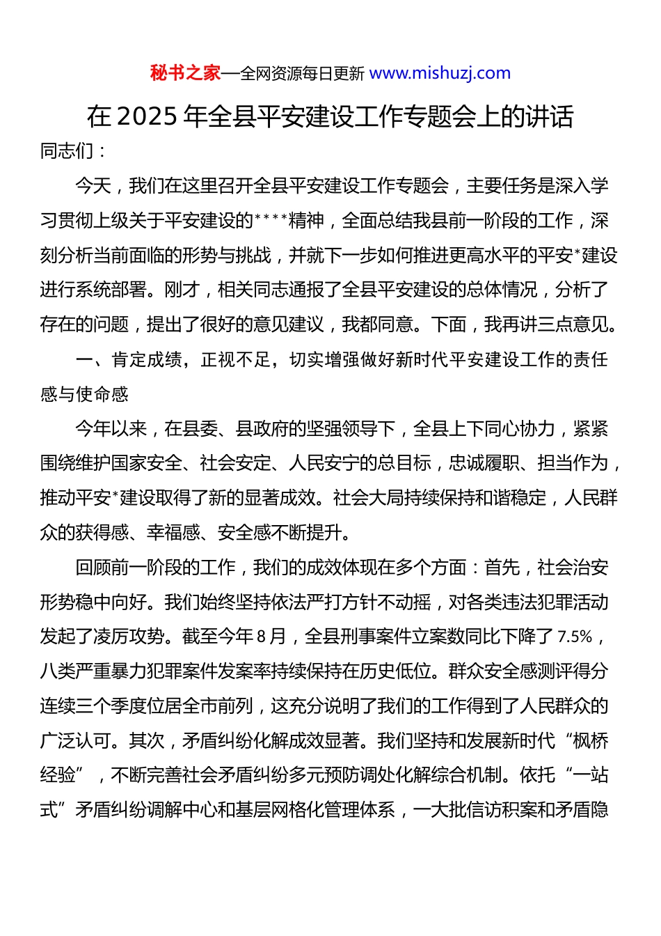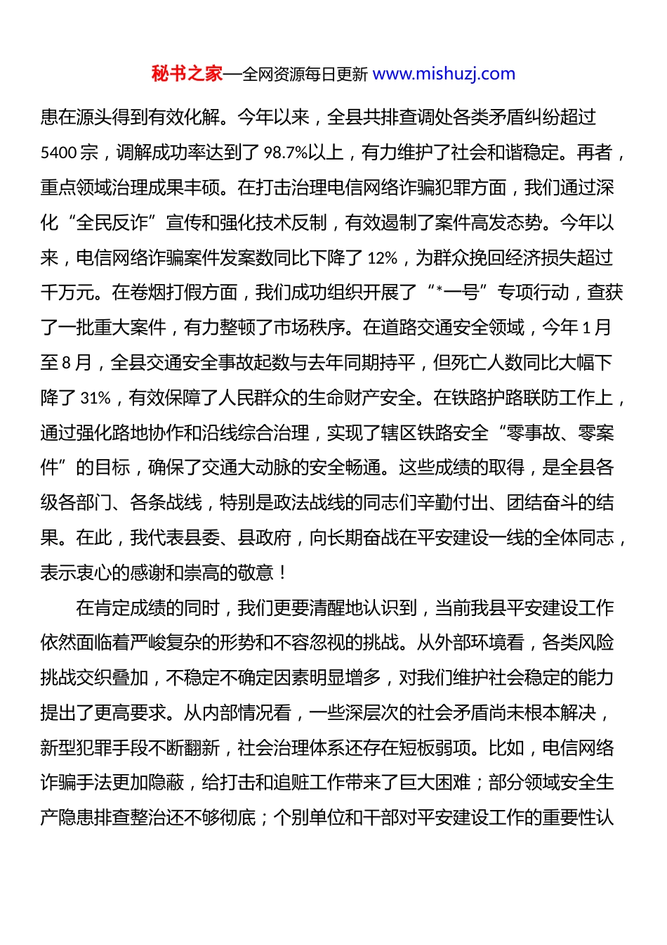 秘书之家—全网资源每日更新 www.mishuzj.com在 2025 年全县平安建设工作专题会上的讲话同志们:今天,我们在这里召开全县平安建设工作专题会,主要任务是深入学习贯彻上级关于平安建设的****精神,全面总结我县前一阶段的工作,深刻分析当前面临的形势与挑战,并就下一步如何推进更高水平的平安*建设进行系统部署。刚才,相关同志通报了全县平安建设的总体情况,分析了存在的问题,提出了很好的意见建议,我都同意。下面,我再讲三点意见。一、肯定成绩,正视不足,切实增强做好新时代平安建设工作的责任感与使命感今年以来,在县委、县政府的坚强领导下,全县上下同心协力,紧紧围绕维护国家安全、社会安定、人民安宁的总目标,忠诚履职、担当作为,推动平安*建设取得了新的显著成效。社会大局持续保持和谐稳定,人民群众的获得感、幸福感、安全感不断提升。回顾前一阶段的工作,我们的成效体现在多个方面:首先,社会治安形势稳中向好。我们始终坚持依法严打方针不动摇,对各类违法犯罪活动发起了凌厉攻势。截至今年 8 月,全县刑事案件立案数同比下降了 7.5%,八类严重暴力犯罪案件发案率持续保持在历史低位。群众安全感测评得分连续三个季度位居全市前列,这充分说明了我们的工作得到了人民群众的广泛认可。其次,矛盾纠纷化解成效显著。我们坚持和发展新时代“枫桥经验”,不断完善社会矛盾纠纷多元预防调处化解综合机制。依托“一站式”矛盾纠纷调解中心和基层网格化管理体系,一大批信访积案和矛盾隐秘书之家—全网资源每日更新 www.mishuzj.com患在源头得到有效化解。今年以来,全县共排查调处各类矛盾纠纷超过5400 宗,调解成功率达到了 98.7%以上,有力维护了社会和谐稳定。再者,重点领域治理成果丰硕。在打击治理电信网络诈骗犯罪方面,我们通过深化“全民反诈”宣传和强化技术反制,有效遏制了案件高发态势。今年以来,电信网络诈骗案件发案数同比下降了 12%,为群众挽回经济损失超过千万元。在卷烟打假方面,我们成功组织开展了“*一号”专项行动,查获了一批重大案件,有力整顿了市场秩序。在道路交通安全领域,今年 1 月至 8 月,全县交通安全事故起数与去年同期持平,但死亡人数同比大幅下降了 31%,有效保障了人民群众的生命财产安全。在铁路护路联防工作上,通过强化路地协作和沿线综合治理,实现了辖区铁路安全“零事故、零案件”的目标,确保了交通大动脉的安全畅通。这些成绩的取得,是全县各级各部门、各条战线,特别是政法战线的同志们辛勤付出、团结奋斗的结果。在此,我代表县委、县政府,向长期奋战在平安建设一线的全体同志,表示衷心的感谢和崇高的敬意!在肯定成绩的同时,我们更要清醒地认识到,当前我县平安建设工作依然面临着严峻复杂的形势和不容忽视的挑战。从外部环境看,各类风险挑战交织叠加,不稳定不确定因素明显增多,对我们维护社会稳定的能力提出了更高要求。从内部情况看,一些深层次的社会矛盾尚未根本解决,新型犯罪手段不断翻新,社会治理体系还存在短板弱项。比如,电信网络诈骗手法更加隐蔽,给打击和追赃工作带来了巨大困难;部分领域安全生产隐患排查整治还不够彻底;个别单位和干部对平安建设工作的重要性认秘书之家—全网资源每日更新 www.mishuzj.com识不足、责任心不强、措施落实不到位的问题依然存在。对此,我们必须始终保持“等不起”的紧迫感、“慢不得”的危机感和“放不下”的使命感,以高度的政治自觉和行动自觉,全力以赴抓好各项工作落实。二、聚焦关键,精准施策,奋力开创更高水平平安*建设的新局面平安是发展的前提,是人民幸福安康的基本要求。面对新形势、新任务,我们必须坚持问题导向、目标导向、结果导向相统一,聚焦关键环节和重点领域,下更大力气、采取得力措施,推动平安建设工作再上新台阶。(一)坚持源头治理,全力防范化解社会矛盾风险。防范化解风险是平安建设的永恒课题。我们必须把工作重心从事后处置转移到事前预防上来,下好先手棋,打好主动仗。一要深化矛盾纠纷排查化解。要健全常态化排查机制,特别是要紧盯征地拆迁、劳资纠纷、婚姻家庭、邻里关系等重点领域,做到早...
