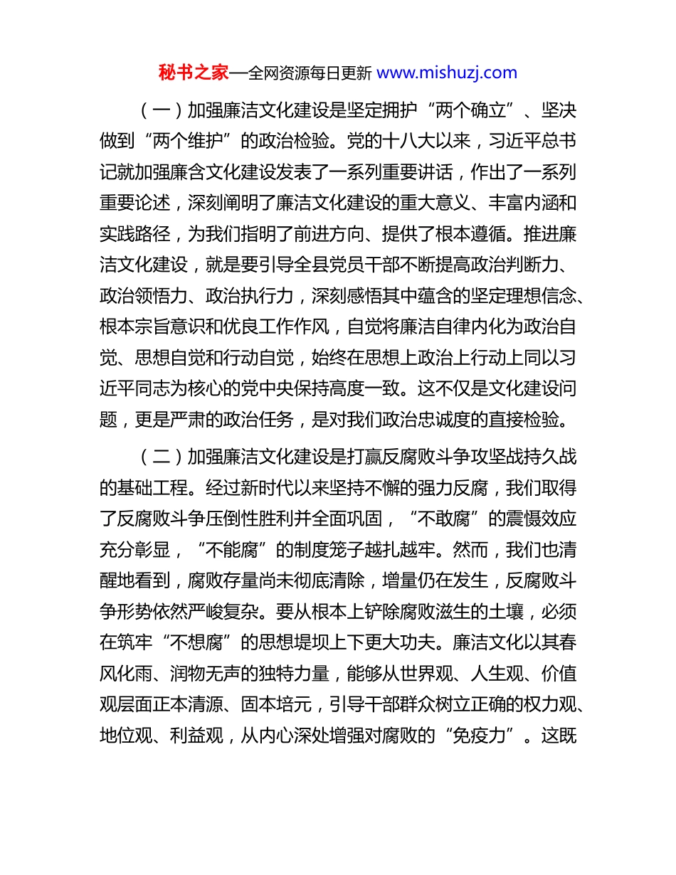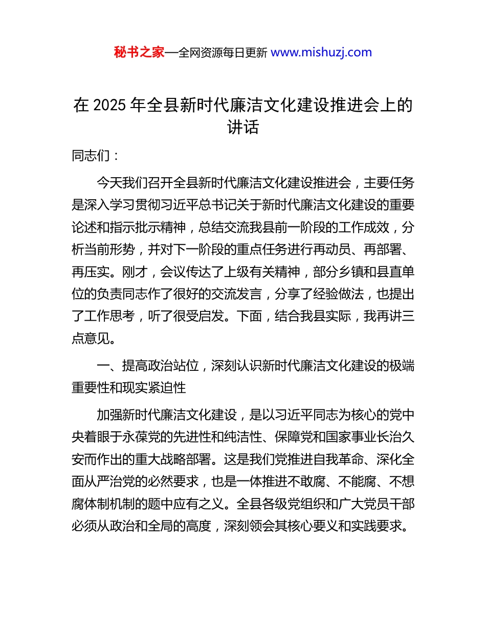 秘书之家—全网资源每日更新 www.mishuzj.com在 2025 年全县新时代廉洁文化建设推进会上的讲话同志们:今天我们召开全县新时代廉洁文化建设推进会,主要任务是深入学习贯彻习近平总书记关于新时代廉洁文化建设的重要论述和指示批示精神,总结交流我县前一阶段的工作成效,分析当前形势,并对下一阶段的重点任务进行再动员、再部署、再压实。刚才,会议传达了上级有关精神,部分乡镇和县直单位的负责同志作了很好的交流发言,分享了经验做法,也提出了工作思考,听了很受启发。下面,结合我县实际,我再讲三点意见。一、提高政治站位,深刻认识新时代廉洁文化建设的极端重要性和现实紧迫性加强新时代廉洁文化建设,是以习近平同志为核心的党中央着眼于永葆党的先进性和纯洁性、保障党和国家事业长治久安而作出的重大战略部署。这是我们党推进自我革命、深化全面从严治党的必然要求,也是一体推进不敢腐、不能腐、不想腐体制机制的题中应有之义。全县各级党组织和广大党员干部必须从政治和全局的高度,深刻领会其核心要义和实践要求。秘书之家—全网资源每日更新 www.mishuzj.com(一)加强廉洁文化建设是坚定拥护“两个确立”、坚决做到“两个维护”的政治检验。党的十八大以来,习近平总书记就加强廉含文化建设发表了一系列重要讲话,作出了一系列重要论述,深刻阐明了廉洁文化建设的重大意义、丰富内涵和实践路径,为我们指明了前进方向、提供了根本遵循。推进廉洁文化建设,就是要引导全县党员干部不断提高政治判断力、政治领悟力、政治执行力,深刻感悟其中蕴含的坚定理想信念、根本宗旨意识和优良工作作风,自觉将廉洁自律内化为政治自觉、思想自觉和行动自觉,始终在思想上政治上行动上同以习近平同志为核心的党中央保持高度一致。这不仅是文化建设问题,更是严肃的政治任务,是对我们政治忠诚度的直接检验。(二)加强廉洁文化建设是打赢反腐败斗争攻坚战持久战的基础工程。经过新时代以来坚持不懈的强力反腐,我们取得了反腐败斗争压倒性胜利并全面巩固,“不敢腐”的震慑效应充分彰显,“不能腐”的制度笼子越扎越牢。然而,我们也清醒地看到,腐败存量尚未彻底清除,增量仍在发生,反腐败斗争形势依然严峻复杂。要从根本上铲除腐败滋生的土壤,必须在筑牢“不想腐”的思想堤坝上下更大功夫。廉洁文化以其春风化雨、润物无声的独特力量,能够从世界观、人生观、价值观层面正本清源、固本培元,引导干部群众树立正确的权力观、地位观、利益观,从内心深处增强对腐败的“免疫力”。这既秘书之家—全网资源每日更新 www.mishuzj.com是管长远、管根本的治本之策,也是我们打好反腐败斗争总体战、攻坚战、持久战不可或缺的基础性工程。(三)加强廉洁文化建设是护航 XX 县高质量跨越式发展的现实需要。当前,我县正处在转型升级、爬坡过坎的关键时期,一系列重大项目正在实施,一系列改革任务正在攻坚。越是发展的关键时期,越需要风清气正的政治生态和干事创业的良好环境。廉洁文化建设,就是要大力营造和弘扬崇廉拒腐、尚俭戒奢的社会风尚,激励广大干部清白做人、干净做事、廉洁用权、担当作为。一个地方的营商环境好不好,政治生态是重要决定因素。通过廉洁文化的深度浸润,能够有效净化社会风气,构建亲清政商关系,降低制度性交易成本,吸引更多优质资源和高端人才汇聚 XX,为我县在新征程上奋力谱写新篇章提供坚强的纪律保障和强大的精神动力。今年以来,在县委的坚强领导下,全县各级各部门围绕新时代廉洁文化建设做了大量工作,取得了一定成效。理论学习持续深化,阵地建设不断拓展,主题活动有声有色,宣传引导氛围日渐浓厚。比如,有的单位打造了廉洁文化主题公园,有的乡镇挖掘了本地历史先贤的廉洁事迹,有的部门开展了“廉洁家风”故事分享会,等等。这些工作为我们进一步深化廉洁文化建设打下了良好基础。但在肯定成绩的同时,我们也要正视存在的问题和不足:部分单位对廉洁文化建设的认识还不够到位,存在“说起来重要、做起来次要”的现象;工作举措上秘书之家—全网资源每日更新 www.mishuzj.com创新性不强,满足于完成“规定动作”,特色“自选动作...