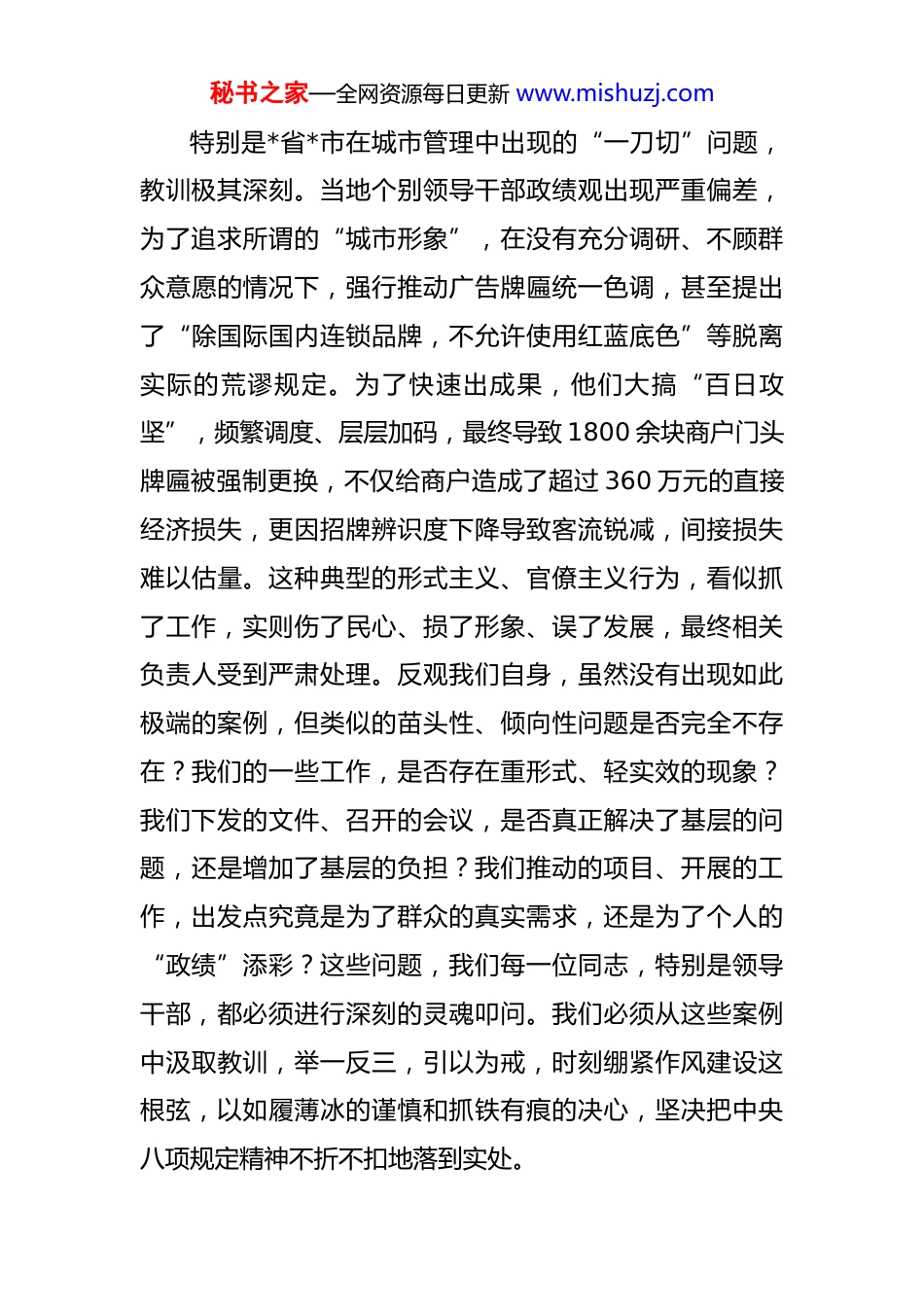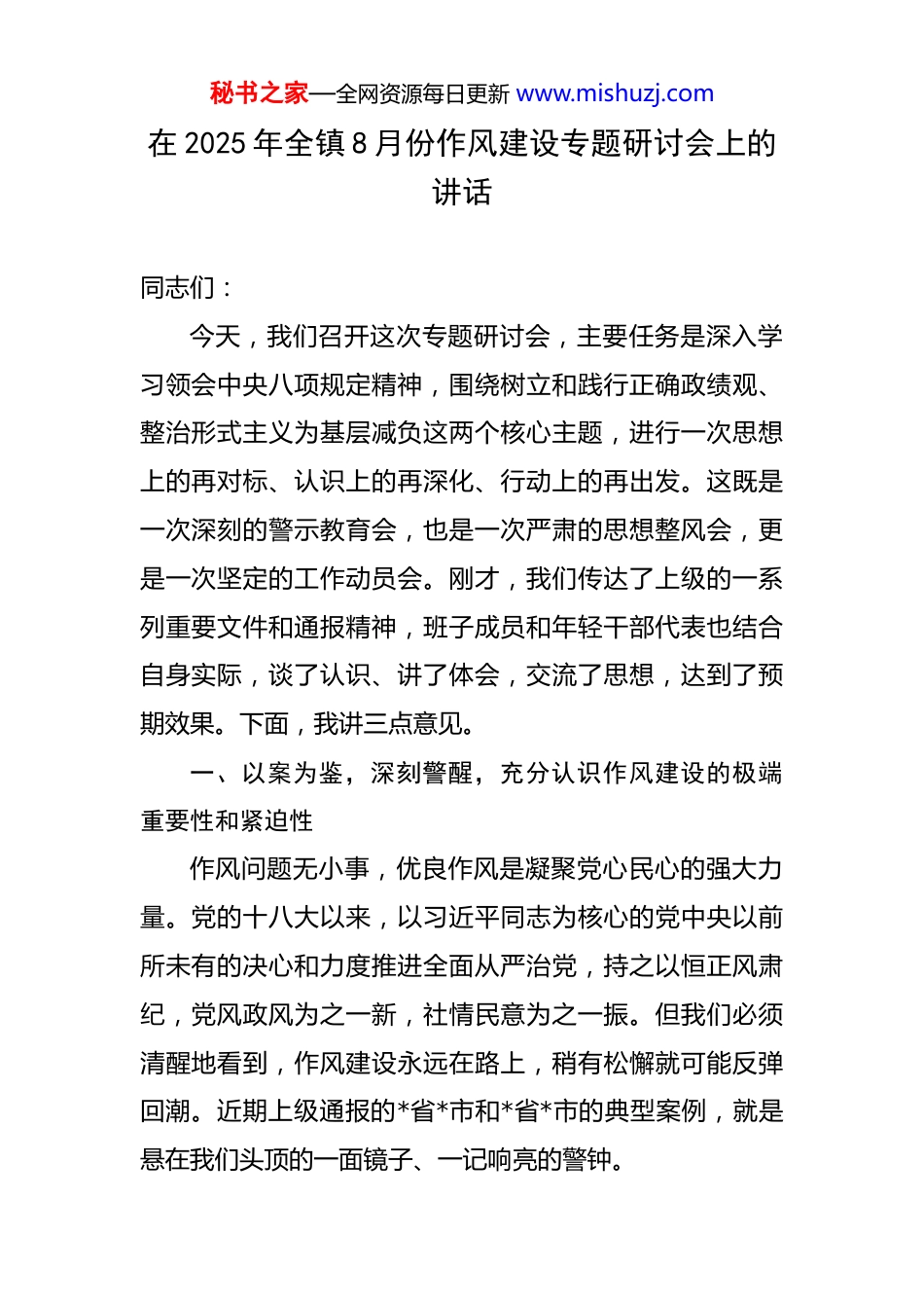 秘书之家—全网资源每日更新 www.mishuzj.com在 2025 年全镇 8 月份作风建设专题研讨会上的讲话 同志们:今天,我们召开这次专题研讨会,主要任务是深入学习领会中央八项规定精神,围绕树立和践行正确政绩观、整治形式主义为基层减负这两个核心主题,进行一次思想上的再对标、认识上的再深化、行动上的再出发。这既是一次深刻的警示教育会,也是一次严肃的思想整风会,更是一次坚定的工作动员会。刚才,我们传达了上级的一系列重要文件和通报精神,班子成员和年轻干部代表也结合自身实际,谈了认识、讲了体会,交流了思想,达到了预期效果。下面,我讲三点意见。一、以案为鉴,深刻警醒,充分认识作风建设的极端重要性和紧迫性作风问题无小事,优良作风是凝聚党心民心的强大力量。党的十八大以来,以习近平同志为核心的党中央以前所未有的决心和力度推进全面从严治党,持之以恒正风肃纪,党风政风为之一新,社情民意为之一振。但我们必须清醒地看到,作风建设永远在路上,稍有松懈就可能反弹回潮。近期上级通报的*省*市和*省*市的典型案例,就是悬在我们头顶的一面镜子、一记响亮的警钟。秘书之家—全网资源每日更新 www.mishuzj.com特别是*省*市在城市管理中出现的“一刀切”问题,教训极其深刻。当地个别领导干部政绩观出现严重偏差,为了追求所谓的“城市形象”,在没有充分调研、不顾群众意愿的情况下,强行推动广告牌匾统一色调,甚至提出了“除国际国内连锁品牌,不允许使用红蓝底色”等脱离实际的荒谬规定。为了快速出成果,他们大搞“百日攻坚”,频繁调度、层层加码,最终导致 1800 余块商户门头牌匾被强制更换,不仅给商户造成了超过 360 万元的直接经济损失,更因招牌辨识度下降导致客流锐减,间接损失难以估量。这种典型的形式主义、官僚主义行为,看似抓了工作,实则伤了民心、损了形象、误了发展,最终相关负责人受到严肃处理。反观我们自身,虽然没有出现如此极端的案例,但类似的苗头性、倾向性问题是否完全不存在?我们的一些工作,是否存在重形式、轻实效的现象?我们下发的文件、召开的会议,是否真正解决了基层的问题,还是增加了基层的负担?我们推动的项目、开展的工作,出发点究竟是为了群众的真实需求,还是为了个人的“政绩”添彩?这些问题,我们每一位同志,特别是领导干部,都必须进行深刻的灵魂叩问。我们必须从这些案例中汲取教训,举一反三,引以为戒,时刻绷紧作风建设这根弦,以如履薄冰的谨慎和抓铁有痕的决心,坚决把中央八项规定精神不折不扣地落到实处。秘书之家—全网资源每日更新 www.mishuzj.com二、刀刃向内,精准查摆,坚决纠治自身存在的形式主义顽疾整治形式主义为基层减负,关键在于敢于刀刃向内、自我革命。我们必须对照上级督导组发现的问题清单,对照典型案例暴露的共性问题,深入查摆我们在思想根源、工作实践中存在的差距和不足。第一,要坚决破除“唯上不唯实”的错误政绩观。正确的政绩观,是为民造福的政绩观,是经得起历史和人民检验的政绩观。我们必须清醒,我们手中的权力是人民赋予的,我们的工作是为了服务*镇的一方百姓。我们追求的发展,必须是高质量、可持续的发展,绝不能为了数据好看、场面热闹,而搞那些“花架子”工程、“盆景”式典型。在项目建设上,要多一些打基础、利长远的实事,少一些急功近利、寅吃卯粮的蠢事。在民生服务上,要多一些雪中送炭的温暖,少一些锦上添花的表演。特别是我们镇的生态保护、防汛防火、安全生产等工作,都是“潜绩”,平时看不见、摸不着,但一旦出问题就是天大的事。我们必须把这些“看不见”的工作,当作最大的政绩来抓,抓实抓细,确保万无一失。第二,要坚决整治“文山会海”和过度留痕。为基层减负,最直观的体现就是会议文件和检查考核少了,基层干部干事创业的时间和精力多了。经过前一阶段的努力,秘书之家—全网资源每日更新 www.mishuzj.com我镇在这方面取得了一定成效,但仍有提升空间。根据初步统计,2025 年上半年,我镇各基层单位平均接收的会议文件数量仍超过了预期,迎检次数虽有下降但依然偏多。一些不必要的会议、照搬照抄的文件、名目繁多的...
