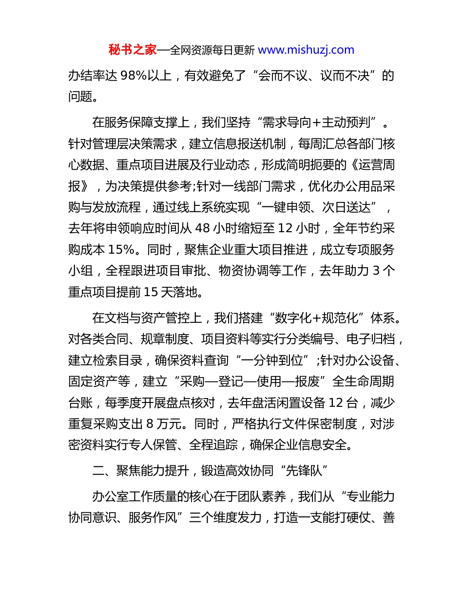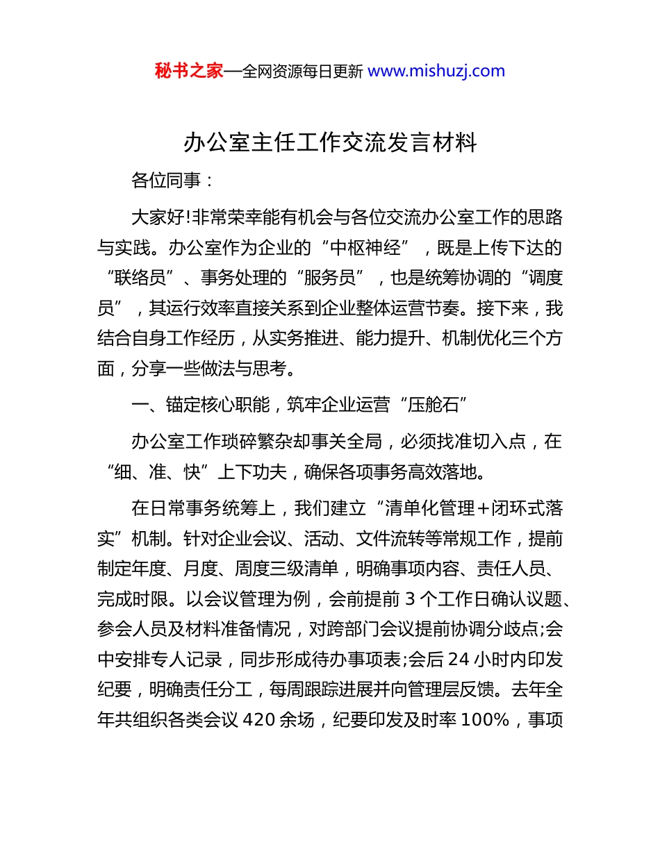 秘书之家—全网资源每日更新 www.mishuzj.com办公室主任工作交流发言材料各位同事:大家好!非常荣幸能有机会与各位交流办公室工作的思路与实践。办公室作为企业的“中枢神经”,既是上传下达的“联络员”、事务处理的“服务员”,也是统筹协调的“调度员”,其运行效率直接关系到企业整体运营节奏。接下来,我结合自身工作经历,从实务推进、能力提升、机制优化三个方面,分享一些做法与思考。一、锚定核心职能,筑牢企业运营“压舱石”办公室工作琐碎繁杂却事关全局,必须找准切入点,在“细、准、快”上下功夫,确保各项事务高效落地。在日常事务统筹上,我们建立“清单化管理+闭环式落实”机制。针对企业会议、活动、文件流转等常规工作,提前制定年度、月度、周度三级清单,明确事项内容、责任人员、完成时限。以会议管理为例,会前提前 3 个工作日确认议题、参会人员及材料准备情况,对跨部门会议提前协调分歧点;会中安排专人记录,同步形成待办事项表;会后 24 小时内印发纪要,明确责任分工,每周跟踪进展并向管理层反馈。去年全年共组织各类会议 420 余场,纪要印发及时率 100%,事项秘书之家—全网资源每日更新 www.mishuzj.com办结率达 98%以上,有效避免了“会而不议、议而不决”的问题。在服务保障支撑上,我们坚持“需求导向+主动预判”。针对管理层决策需求,建立信息报送机制,每周汇总各部门核心数据、重点项目进展及行业动态,形成简明扼要的《运营周报》,为决策提供参考;针对一线部门需求,优化办公用品采购与发放流程,通过线上系统实现“一键申领、次日送达”,去年将申领响应时间从 48 小时缩短至 12 小时,全年节约采购成本 15%。同时,聚焦企业重大项目推进,成立专项服务小组,全程跟进项目审批、物资协调等工作,去年助力 3 个重点项目提前 15 天落地。在文档与资产管控上,我们搭建“数字化+规范化”体系。对各类合同、规章制度、项目资料等实行分类编号、电子归档,建立检索目录,确保资料查询“一分钟到位”;针对办公设备、固定资产等,建立“采购—登记—使用—报废”全生命周期台账,每季度开展盘点核对,去年盘活闲置设备 12 台,减少重复采购支出 8 万元。同时,严格执行文件保密制度,对涉密资料实行专人保管、全程追踪,确保企业信息安全。二、聚焦能力提升,锻造高效协同“先锋队”办公室工作质量的核心在于团队素养,我们从“专业能力协同意识、服务作风”三个维度发力,打造一支能打硬仗、善秘书之家—全网资源每日更新 www.mishuzj.com打硬仗的队伍。在专业能力培养上,推行“常态化学习+实战化练兵”模式。建立“每周一学、每月一训”制度,围绕公文写作、会议组织、数据分析、应急处理等核心技能,邀请企业内部骨干或外部专家开展专题培训,去年累计组织培训 26 场,覆盖团队全员;同时,安排团队成员轮岗参与重大项目、重要会议的统筹协调工作,通过“以干代练”提升实战能力。例如,去年安排 3 名年轻员工全程跟进年度战略研讨会筹备,从议题梳理、嘉宾对接至会议执行,全程参与实战,其统筹协调能力得到显著提升。此外,我们还建立“技能比拼”机制,每季度开展公文写作、PPT 制作等技能竞赛,以赛促学、以赛促优,团队整体专业水平较去年提升 30%。在协同意识塑造上,构建“跨部门联动+内部补位”机制。针对跨部门工作,提前召开协调会明确各方职责与衔接节点,建立“每日沟通、每周汇总”制度,及时破解协同中的堵点问题。例如,在去年企业年度总结表彰大会筹备中,办公室联合人力资源、品牌宣传、行政后勤等 6 个部门成立专项工作组,每日同步进展、协调资源,最终确保大会零差错举办;在团队内部,推行“AB 角互补”制度,每个关键岗位均设置 A、B角,互为备份、互相支持,有效避免了因人员休假、出差导致的工作断档,全年实现核心工作“零延误”。秘书之家—全网资源每日更新 www.mishuzj.com在服务作风建设上,倡导“主动服务+精准服务”理念。提出“三个一”服务标准,即“一口清”(对职责范围内的事项一次性说清)、“马上办”(对能立即处理的事项即时响应)、“跟踪办”(对需持续推进的事项全...