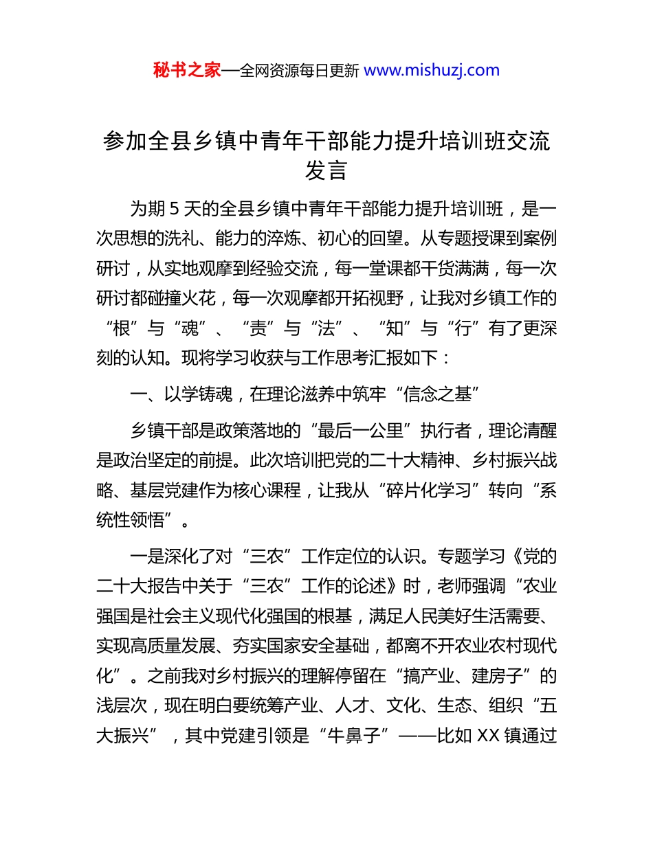 秘书之家—全网资源每日更新 www.mishuzj.com参加全县乡镇中青年干部能力提升培训班交流发言为期 5 天的全县乡镇中青年干部能力提升培训班,是一次思想的洗礼、能力的淬炼、初心的回望。从专题授课到案例研讨,从实地观摩到经验交流,每一堂课都干货满满,每一次研讨都碰撞火花,每一次观摩都开拓视野,让我对乡镇工作的“根”与“魂”、“责”与“法”、“知”与“行”有了更深刻的认知。现将学习收获与工作思考汇报如下:一、以学铸魂,在理论滋养中筑牢“信念之基”乡镇干部是政策落地的“最后一公里”执行者,理论清醒是政治坚定的前提。此次培训把党的二十大精神、乡村振兴战略、基层党建作为核心课程,让我从“碎片化学习”转向“系统性领悟”。一是深化了对“三农”工作定位的认识。专题学习《党的二十大报告中关于“三农”工作的论述》时,老师强调“农业强国是社会主义现代化强国的根基,满足人民美好生活需要、实现高质量发展、夯实国家安全基础,都离不开农业农村现代化”。之前我对乡村振兴的理解停留在“搞产业、建房子”的浅层次,现在明白要统筹产业、人才、文化、生态、组织“五大振兴”,其中党建引领是“牛鼻子”——比如 XX 镇通过秘书之家—全网资源每日更新 www.mishuzj.com“支部+合作社+农户”模式,把党组织建在产业链上,带动120 户农户种植高附加值蔬菜,年人均增收 8000 元,这让我深刻体会到“党建强则产业强,党建兴则乡村兴”。二是强化了对群众工作本质的理解。《习近平总书记关于群众工作的重要论述》课程中,老师分享了“习近平同志在宁德工作时‘四下基层’”的案例,“信访接待下基层、现场办公下基层、调查研究下基层、宣传党的方针政策下基层”,这“四下基层”不是“走过场”,而是“沉下去”——比如之前我处理 XX 村村民的土地纠纷,一开始只想着“按政策办事”,结果群众不理解,后来跟着老书记入户 3 次,倾听群众的诉求,协调村里的老党员做思想工作,终于达成和解,这让我明白群众工作要“共情为先、法理兼顾”,既要“讲政策”,更要“暖人心”。三是固化了对纪律规矩的敬畏。《乡镇干部廉洁自律专题教育》课程中,播放了近年来全县乡镇干部违纪违法的案例,有的利用职务之便收受礼品,有的违规审批项目,这些案例让我深受警醒——乡镇干部“官小权不小”,每一次决策都关系群众的切身利益,必须守牢“底线”、不碰“红线”,做到“心有所畏、言有所戒、行有所止”。二、以学增智,在能力锤炼中提升“干事之能”秘书之家—全网资源每日更新 www.mishuzj.com乡镇工作“上面千条线,下面一根针”,需要“十八般武艺”。此次培训聚焦基层治理、应急处置、产业发展等核心能力,让我从“经验主义”转向“专业主义”。一是掌握了基层治理的方法技巧。《乡镇基层治理创新实践》课程中,老师讲解了“积分制管理”“乡贤理事会”“网格化服务”等模式,其中 XX 村的“积分制”让我眼前一亮——他们把“垃圾分类、孝老爱亲、参与公益”等行为量化为积分,可兑换生活用品或免费体检,短短半年,村貌焕然一新,村民参与治理的积极性提高了 60%。我们镇 XX 村也有类似的需求,之前村民对公共卫生漠不关心,现在我打算借鉴这个模式,联合村“两委”制定积分规则,让“要我做”变成“我要做”。二是学会了应急处置的全流程方法。《乡镇突发事件应急处置》课程中,老师结合“XX 镇山体滑坡救援”案例,讲解了“风险排查-预警处置-善后总结”的全流程,强调“三个第一”:第一时间赶赴现场、第一时间报告情况、第一时间安抚群众。之前我参与过一次森林火灾扑救,因为没有及时疏散周边群众,差点造成人员伤亡,现在明白应急处置要“快、准、稳”——快是反应速度,准是问题判断,稳是群众情绪。三是开拓了产业发展的思路视野。实地观摩 XX 镇“农文旅融合示范园”时,我看到他们把“特色种植(草莓、葡萄)、秘书之家—全网资源每日更新 www.mishuzj.com乡村旅游(民宿、采摘)、农产品加工(草莓酱、葡萄酒)”结合起来,年营收超 2000 万元,带动 300 户农户就业。我们镇有丰富的生态资源(XX 山、XX 河)和特色农产品...