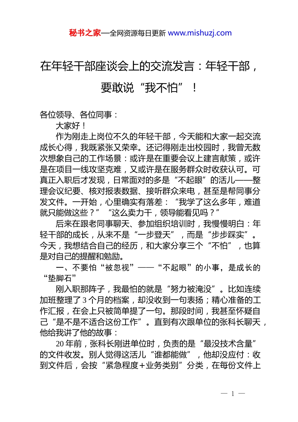 秘书之家—全网资源每日更新 www.mishuzj.com在年轻干部座谈会上的交流发言:年轻干部,要敢说“我不怕”!各位领导、各位同事:大家好!作为刚走上岗位不久的年轻干部,今天能和大家一起交流成长心得,我既紧张又荣幸。还记得刚走出校园时,我曾无数次想象自己的工作场景:或许是在重要会议上建言献策,或许是在项目一线攻坚克难,又或许是在服务群众时收获认可。可真正入职后才发现,日常面对的多是“不起眼”的活儿——整理会议纪要、核对报表数据、接听群众来电,甚至是帮同事分发文件。一开始,心里确实有落差:“我学了这么多年,难道就只能做这些?”“这么卖力干,领导能看见吗?”后来在跟老同事聊天、参加组织培训时,我慢慢明白:年轻干部的成长,从来不是“一步登天”,而是“步步踩实”。今天,我想结合自己的经历,和大家分享三个“不怕”,也算是对自己的提醒和勉励。一、不要怕“被忽视”——“不起眼”的小事,是成长的“垫脚石”刚入职那阵子,我最怕的就是“努力被淹没”。比如连续加班整理了 3 个月的档案,却没收到一句表扬;精心准备的工作汇报,在会上只被简单提了一句。那段时间,我甚至怀疑自己“是不是不适合这份工作”。直到有次跟单位的张科长聊天,他给我讲了他的故事:20 年前,张科长刚进单位时,负责的是“最没技术含量”的文件收发。别人觉得这活儿“谁都能做”,他却没应付:收到文件后,会按“紧急程度+业务类别”分类,在每份文件上— 1 —秘书之家—全网资源每日更新 www.mishuzj.com贴好便签,标注“需协调部门”“建议办结时间”;发出的文件,会登记台账,定期跟踪落实情况。就这么干了两年,单位里谁要找历史文件、谁要查政策依据,第一个想到的就是他。后来单位承担一项重大改革任务,需要梳理近 10 年的政策文件,张科长凭借自己整理的台账,仅用 3 天就完成了别人预计 1 周才能做完的工作,一下子成了“关键帮手”。他跟我说:“年轻干部最怕‘眼高手低’,总觉得小事‘掉价’,却忘了‘天下大事必作于细’。你整理的每一份纪要,都是在学习领导的思维逻辑;你核对的每一个数据,都是在培养严谨的工作习惯;你接的每一个群众电话,都是在积累沟通的技巧。这些‘看不见’的积累,就像给房子打地基——地基越深,房子才能盖得越高。”总书记曾说:“干部多‘墩墩苗’没有什么坏处,把基础搞扎实了,后面的路才能走得更稳更远。”“被忽视”的日子,其实就是我们的“墩苗期”。那些看似“没亮点”的工作,不是“浪费时间”,而是在为未来的“出彩”攒力气。就像农民种庄稼,播种后要经历漫长的“扎根”阶段,地面上看似平静,地下的根须却在拼命向深处生长——只有根扎得稳,后续才能扛住风雨、结出硕果。所以现在的我,再面对“不起眼”的工作时,会多问自己三个问题:“这件事里藏着什么可学的东西?”“我能不能比上次做得更细致?”“我的工作能给同事提供什么帮助?”慢慢发现,原来“被忽视”的不是努力,而是我们对“价值”的误解——当我们把小事做透、把基础打牢,“被看见”只是时间问题;就算暂时没被看见,那些沉淀下来的能力,也早已成为自己的“底气”。二、不要怕“被折腾”——“不安稳”的挑战,是能力的“加速器”入职半年后,我刚把手头的业务摸熟,正想“按部就班干— 2 —秘书之家—全网资源每日更新 www.mishuzj.com稳当”,领导却突然安排我参与一个跨部门的临时项目,还兼任了支部的宣传委员。那段时间,白天要跑项目调研,晚上要写宣传稿,周末还要整理调研数据,每天忙得像“旋转的陀螺”。有好几次,我都想跟领导说“我应付不过来”,甚至觉得“这就是瞎折腾,把我当‘万能替补’用”。直到项目结束后的总结会上,领导的一句话点醒了我:“年轻干部不要怕‘多干活’,每一次‘折腾’,都是给你们‘补能力’的机会。”现在回头看,那段“被折腾”的日子,确实是我成长最快的阶段:以前我只懂自己的业务岗,参与跨部门项目后,才摸清了单位“业务-财务-人事”的运转逻辑,现在跟其他部门沟通时,能一下子抓住关键;以前写材料只会“照模板套”,兼任宣传委员后,为了写好一篇党员故事,我跟着...