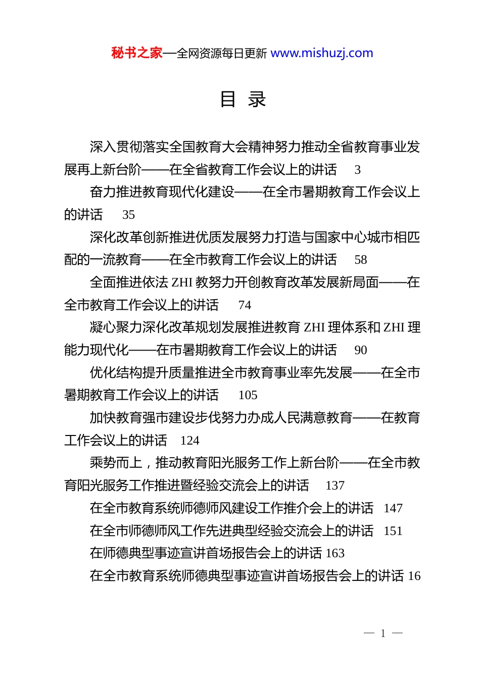 秘书之家—全网资源每日更新 www.mishuzj.com目 录深入贯彻落实全国教育大会精神努力推动全省教育事业发展再上新台阶——在全省教育工作会议上的讲话3奋力推进教育现代化建设——在全市暑期教育工作会议上的讲话35深化改革创新推进优质发展努力打造与国家中心城市相匹配的一流教育——在全市教育工作会议上的讲话58全面推进依法 ZHI 教努力开创教育改革发展新局面——在全市教育工作会议上的讲话74凝心聚力深化改革规划发展推进教育 ZHI 理体系和 ZHI 理能力现代化——在市暑期教育工作会议上的讲话90优化结构提升质量推进全市教育事业率先发展——在全市暑期教育工作会议上的讲话105加快教育强市建设步伐努力办成人民满意教育——在教育工作会议上的讲话124乘势而上,推动教育阳光服务工作上新台阶——在全市教育阳光服务工作推进暨经验交流会上的讲话137在全市教育系统师德师风建设工作推介会上的讲话 147在全市师德师风工作先进典型经验交流会上的讲话 151在师德典型事迹宣讲首场报告会上的讲话 163在全市教育系统师德典型事迹宣讲首场报告会上的讲话 16— 1 —秘书之家—全网资源每日更新 www.mishuzj.com7 在全市“师德师风建设年”活动启动仪式上的讲话170深入贯彻落实全国教育大会精神努力推动全省教育事业发展再上新台阶——在全省教育工作会议上的讲话网络教育工作 讲话 教育事业同志们:2018 年,是全面贯彻 D 的十九大精神的开局之年,是改革开放 40 周年,是全国教育大会胜利召开之年,也是河南教育发展不平凡的一年,是全省教育系统团结协作奋力拼搏的一年,是统一思想高位谋划的一年,是务实奋进攻坚克难的一年,是教育形象经受大考的一年,是 D 群工作提质给力的一年,是事业发展亮点纷呈的一年。省委、省政府高度重视教育工作,王国生书记对教育工作指示批示多达 33 次,深入郑州大学与青年师生代表座谈交流,出席教师节庆祝大会并亲切接见优秀教师代表,率团访问俄罗斯并亲自见证签署多个重大教育合作项目。陈润儿省长先后深入省教育厅、郑州大学、河南农业大学调研指导,亲赴河南大学宣讲十九大精神。省委、省人大、省政府、省政协领导同志多人多次到教育系统调研宣讲,对教育重大问题亲自协调解决。教育改革发展的环境和氛围更加有利,为新时代实现教育新发展新跨越开好— 2 —秘书之家—全网资源每日更新 www.mishuzj.com了局、起好了步、奠好了基。一、用“满意度”衡量成效,正确认识“2018 年教育工作怎么看”一年来,全省教育系统以习近平新时代中国特色社会主义思想为指导,深入贯彻落实 D 的十九大精神和全国教育大会精神,扎实贯彻落实省委十届六次、七次、八次全会和省“两会”精神,认真贯彻中 Y 和省委省政府决策部署,学习弘扬焦裕禄同志“三股劲”,落实立德树人根本任务,调结构,提质量,抓改革,促公平,各级各类教育呈现良好发展态势,有提升、有亮点、有突破,以教育改革发展的新成效、新面貌向改革开放四十周年献礼。总体上看,2018 年教育工作呈现出七个特点:1.学得实。就是习近平总书记关于教育工作的重要论述学得实。D 的十八大以来,以习近平同志为核心的 D 中 Y 高度重视教育事业,在习近平总书记亲自领导下,D 中 Y 就加强和改进教育工作出台一系列重要文件,作出一系列重要部署。习近平总书记多次到学校考察,给师生回信,对教育工作作出重要指示批示。特别是继 2016 年在全国高校思想政 ZHI 工作会议上发表重要讲话后,又在去年 9 月亲自出席全国教育大会并发表重要讲话,为推动新时代教育改革发展指明了方向。— 3 —秘书之家—全网资源每日更新 www.mishuzj.com全国教育大会胜利召开后,省委常委会专题传达学习大会精神,研究贯彻落实意见。省政府专门召开全国教育大会精神宣讲电视电话会议,霍金花副省长进行了专题宣讲。省委高校工委、省教育厅把学习宣传贯彻习近平总书记关于教育工作的重要论述和大会精神作为首要政 ZHI 任务,实施了宣传贯彻落实习近平总书记重要讲话和大会精神“十个一”工程,组织宣讲、深入传达,开展培训、深化认识,发挥优势、深度解读,摸清...