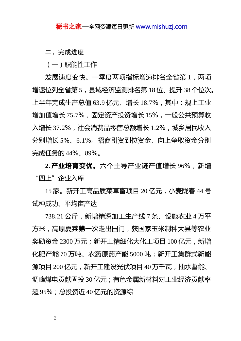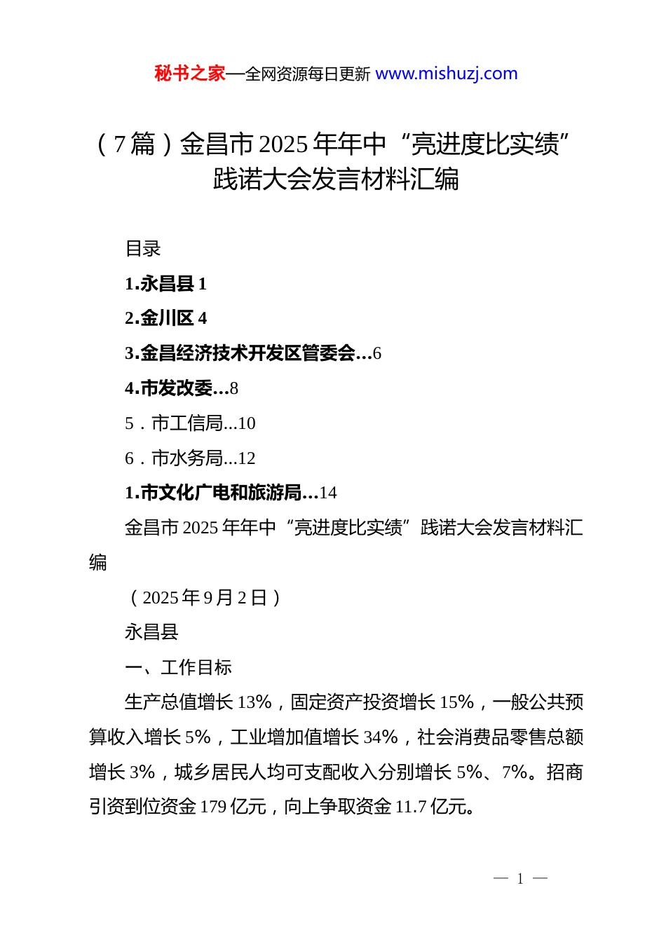 秘书之家—全网资源每日更新 www.mishuzj.com(7 篇)金昌市 2025 年年中“亮进度比实绩”践诺大会发言材料汇编目录1.永昌县 12.金川区 43.金昌经济技术开发区管委会…64.市发改委…85.市工信局…106.市水务局…121.市文化广电和旅游局…14金昌市 2025 年年中“亮进度比实绩”践诺大会发言材料汇编(2025 年 9 月 2 日)永昌县一、工作目标生产总值增长 13%,固定资产投资增长 15%,一般公共预算收入增长 5%,工业增加值增长 34%,社会消费品零售总额增长 3%,城乡居民人均可支配收入分别增长 5%、7%。招商引资到位资金 179 亿元,向上争取资金 11.7 亿元。— 1 —秘书之家—全网资源每日更新 www.mishuzj.com二、完成进度(一)职能性工作发展速度变快。一季度两项指标增速排名全省第 1,两项增速位列全省第 5,县域经济监测排名第 18 位、提升 38 个位次。上半年完成生产总值 63.9 亿元、增长 18.7%,其中:规上工业增加值增长 75.7%,固定资产投资增长 15%,一般公共预算收入增长 37.2%,社会消费品零售总额增长 1.2%,城乡居民收入分别增长 5%、6.1%。招商引资到位资金、向上争取资金分别完成任务的 44%、89%。2.产业培育变优。六个主导产业链产值增长 96%,新增“四上”企业入库15 家。新开工高品质菜草畜项目 20 亿元,小麦陇春 44 号试种成功、平均亩产达738.21 公斤,新增精深加工生产线 7 条、设施农业 4 万平方米,高原夏菜第一次走出国门,获国家玉米制种大县等农业奖励资金 2300 万元;新开工精细化大化工项目 100 亿元,新增化肥产能 70 万吨、农药原药产能 5000 吨;新开工集群式新能源项目 200 亿元,新开工建设光伏项目 40 万千瓦,抽水蓄能、调峰煤电贡献固投 30 亿元;有色金属新材料对工业经济贡献率超 95%;总投资近 40 亿元的资源综— 2 —秘书之家—全网资源每日更新 www.mishuzj.com合利用项目建成 5 个。省级旅游度假区、省级文旅振兴样板村加快创建,卍字灯俗纳入河西走廊国家遗产线路。支撑平台变强。永昌工业园区位列全省 63 个省级工业园区11 位,提升 25 个位次。公铁立交、综合管架、在线监测等基础配套日趋完善,盘活闲置土地 1000 亩,园区产值增长 60%。研究编制永昌农业园区总体规划,水源国家农业产业强镇获批实施,5 亿元的万亩有机基地全面启动;“元生爱特奶绵羊”品种即将公布,将成为首个中国奶绵羊羊种;绵羊奶国家标准有望近期公布施行;永昌百亿级奶绵羊产业小镇规划编制完成,乳制品精深加工即将进入实施阶段。民生保障变实。一般公共预算民生支出占比超 75%,28 件省市县民生实事进度超七成。高考成绩再创佳绩,县一中标准化二期、河一小迁扩建开工建设。医保“统一协议、统一预算、统一结算”方式基本实现,“中医夜市”每周两次,“八段锦”等养生运动机关全面推广。所有学校球场对外开放,优秀代表、广大市民常态化登钟鼓楼“声动永昌、铸魂立德”。“有事找书记、有事找警察”经验做法全面推行。(二)突破性工作项目持续焕新。项目储备规模超千亿,申报下达一般债、— 3 —秘书之家—全网资源每日更新 www.mishuzj.com中央预等各类项目资金 6 亿元。兰张三四线征拆工作顺利推进,金山高速开工建设,21 亿元的 g312 线改建年内通车,29 亿元的能化投低阶煤、5 亿元的贝达生物一期建成投产。总投资 30亿元的 40 万吨磷酸、30 万吨净化磷酸项目签约落地,24 亿元的 750 千伏变电站、20 亿元的危废处置加快推进,引进 10 亿元以上项目 4 项,与神木市、神木市开发区实现飞地合作。城乡持续更新。全面启动精致城市建设三年行动,打通“断头路”、房地产遗留问题取得新突破,钟鼓楼商圈加快建设,改造雨污分流等城市管网 7 公里,实现燃气入户 1.5 万户。乡村建设、避险搬迁完成任务的 70%,拆除旧宅超 2000 院;近100 公里的村组道路全面开工,总投资 1.8 亿元的“三北六期”工程任务过半,总投资 4.2 亿元的东河灌区现代化改造报省发改委待批,总投资 6.8 亿元的 1700 万立方米的“水盆子”开工建...