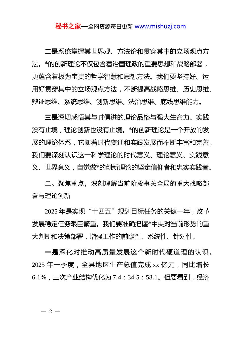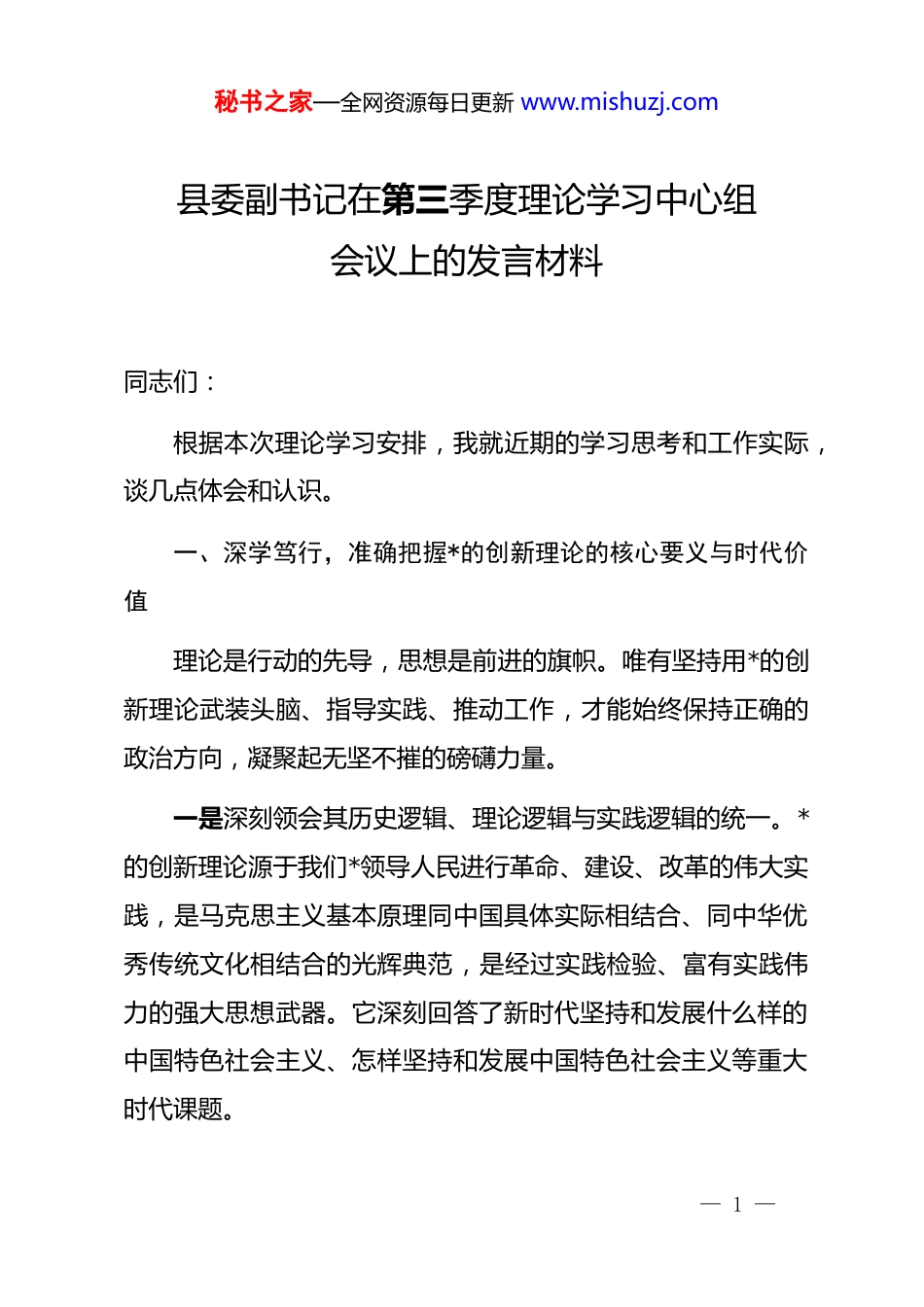 秘书之家—全网资源每日更新 www.mishuzj.com县委副书记在第三季度理论学习中心组会议上的发言材料同志们:根据本次理论学习安排,我就近期的学习思考和工作实际,谈几点体会和认识。一、深学笃行,准确把握*的创新理论的核心要义与时代价值理论是行动的先导,思想是前进的旗帜。唯有坚持用*的创新理论武装头脑、指导实践、推动工作,才能始终保持正确的政治方向,凝聚起无坚不摧的磅礴力量。一是深刻领会其历史逻辑、理论逻辑与实践逻辑的统一。*的创新理论源于我们*领导人民进行革命、建设、改革的伟大实践,是马克思主义基本原理同中国具体实际相结合、同中华优秀传统文化相结合的光辉典范,是经过实践检验、富有实践伟力的强大思想武器。它深刻回答了新时代坚持和发展什么样的中国特色社会主义、怎样坚持和发展中国特色社会主义等重大时代课题。— 1 —秘书之家—全网资源每日更新 www.mishuzj.com二是系统掌握其世界观、方法论和贯穿其中的立场观点方法。*的创新理论不仅包含着治国理政的重要思想和战略部署,更蕴含着极为宝贵的哲学智慧和思想方法。我们要坚持好、运用好贯穿其中的立场观点方法,不断提高战略思维、历史思维、辩证思维、系统思维、创新思维、法治思维、底线思维能力。三是深切感悟其与时俱进的理论品格与强大生命力。实践没有止境,理论创新也没有止境。*的创新理论是一个开放的发展的理论体系,它随着时代变迁和实践发展而不断丰富和完善。我们要深刻认识这一科学理论的时代意义、理论意义、实践意义、世界意义,自觉做*的创新理论的坚定信仰者和忠实实践者。二、聚焦重点,深刻理解当前阶段事关全局的重大战略部署与理论创新2025 年是实现“十四五”规划目标任务的关键一年,改革发展稳定任务艰巨繁重。我们要准确把握*中央对当前形势的重大判断和决策部署,增强工作的前瞻性、系统性、针对性。一是深化对推动高质量发展这个新时代硬道理的认识 。2025 年一季度,全县地区生产总值完成 xx 亿元,同比增长6.1%,三次产业结构优化为 7.4:34.5:58.1。但要看到,经济— 2 —秘书之家—全网资源每日更新 www.mishuzj.com发展仍面临需求不足、预期偏弱等挑战。我们要深刻把握科技自立自强作为国家发展战略支撑的地位,理解完善科技创新体系、加快实施创新驱动发展战略的紧迫性。要立足我县实际,积极培育和发展新质生产力,改造提升传统产业,培育壮大新兴产业,布局建设未来产业,完善现代化产业体系。目前,全县已启动 xx 高新技术产业园建设,规划总投资 xx 亿元,预计可带动就业 xx 人;xx 传统产业升级改造项目已完成投资 xx 亿元,技术改造覆盖率达 65%。二是深化对统筹发展与安全两件大事的认识。安全是发展的前提,发展是安全的保障。当前世界百年未有之大变局加速演进,不确定难预料因素增多。必须坚定不移贯彻总体国家安全观,把维护国家政治安全放在首位,统筹推进各领域安全。在网络安全方面,要健全网络综合治理体系,加强关键信息基础设施安全保护,提升数据安全保障能力。在产业安全方面,要着力保障产业链供应链安全稳定,提高粮食、能源资源安全保障能力。在经济安全方面,要防范化解重大经济金融风险,守住不发生系统性风险底线。目前,全县已建立网络安全应急响应机制,开展网络安全检查 xx 次,发现并整改隐患 xx 处;建立重点产业链供应链风险监测机制,覆盖企业 xx 家。— 3 —秘书之家—全网资源每日更新 www.mishuzj.com三是深化对全面深化改革开放的认识。改革开放是决定当代中国命运的关键一招。要深刻领会*中央关于进一步全面深化改革、推进中国式现代化的战略考量,坚持社会主义市场经济改革方向,坚持“两个毫不动摇”,着力破解深层次体制机制障碍。要持续推进“放管服”改革,优化营商环境,激发市场主体活力。2025 年一季度,全县新登记市场主体 xx 户,同比增长 xx%;完成重大项目投资 xx 亿元,占年度计划的 xx%。要扩大高水平对外开放,积极融入区域发展格局,提升开放型经济水平。三、知行合一,切实把学习成果转化为推动工作的强大动力和实际成效理论学习的价值在于运用,学习的...