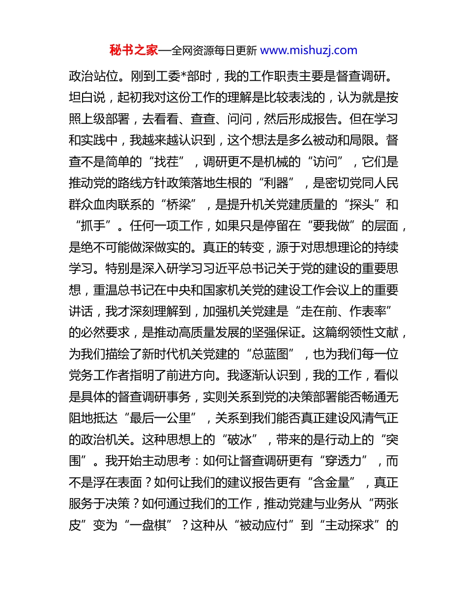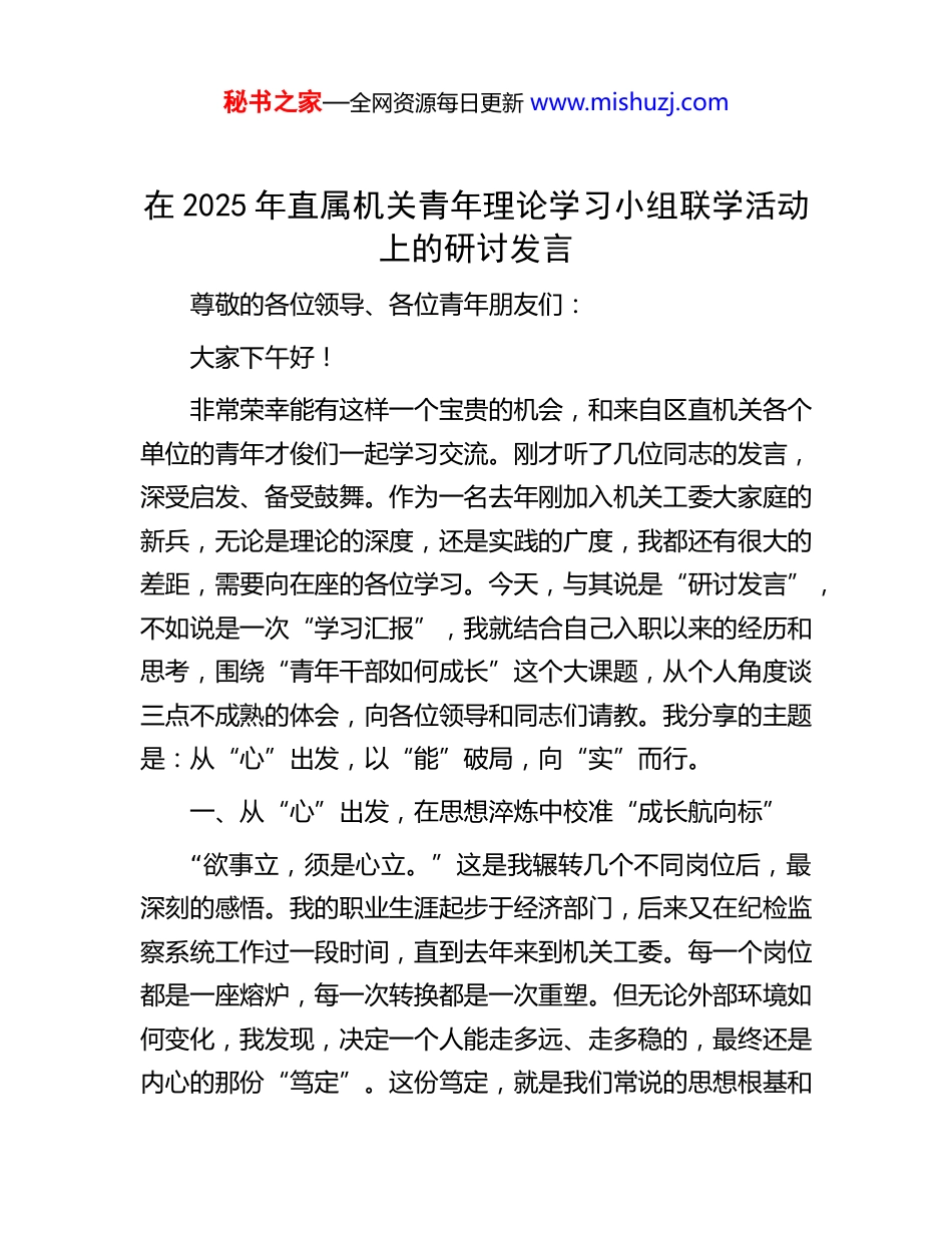 秘书之家—全网资源每日更新 www.mishuzj.com在 2025 年直属机关青年理论学习小组联学活动上的研讨发言尊敬的各位领导、各位青年朋友们:大家下午好!非常荣幸能有这样一个宝贵的机会,和来自区直机关各个单位的青年才俊们一起学习交流。刚才听了几位同志的发言,深受启发、备受鼓舞。作为一名去年刚加入机关工委大家庭的新兵,无论是理论的深度,还是实践的广度,我都还有很大的差距,需要向在座的各位学习。今天,与其说是“研讨发言”,不如说是一次“学习汇报”,我就结合自己入职以来的经历和思考,围绕“青年干部如何成长”这个大课题,从个人角度谈三点不成熟的体会,向各位领导和同志们请教。我分享的主题是:从“心”出发,以“能”破局,向“实”而行。一、从“心”出发,在思想淬炼中校准“成长航向标”“欲事立,须是心立。”这是我辗转几个不同岗位后,最深刻的感悟。我的职业生涯起步于经济部门,后来又在纪检监察系统工作过一段时间,直到去年来到机关工委。每一个岗位都是一座熔炉,每一次转换都是一次重塑。但无论外部环境如何变化,我发现,决定一个人能走多远、走多稳的,最终还是内心的那份“笃定”。这份笃定,就是我们常说的思想根基和秘书之家—全网资源每日更新 www.mishuzj.com政治站位。刚到工委*部时,我的工作职责主要是督查调研。坦白说,起初我对这份工作的理解是比较表浅的,认为就是按照上级部署,去看看、查查、问问,然后形成报告。但在学习和实践中,我越来越认识到,这个想法是多么被动和局限。督查不是简单的“找茬”,调研更不是机械的“访问”,它们是推动党的路线方针政策落地生根的“利器”,是密切党同人民群众血肉联系的“桥梁”,是提升机关党建质量的“探头”和“抓手”。任何一项工作,如果只是停留在“要我做”的层面,是绝不可能做深做实的。真正的转变,源于对思想理论的持续学习。特别是深入研学习习近平总书记关于党的建设的重要思想,重温总书记在中央和国家机关党的建设工作会议上的重要讲话,我才深刻理解到,加强机关党建是“走在前、作表率”的必然要求,是推动高质量发展的坚强保证。这篇纲领性文献,为我们描绘了新时代机关党建的“总蓝图”,也为我们每一位党务工作者指明了前进方向。我逐渐认识到,我的工作,看似是具体的督查调研事务,实则关系到党的决策部署能否畅通无阻地抵达“最后一公里”,关系到我们能否真正建设风清气正的政治机关。这种思想上的“破冰”,带来的是行动上的“突围”。我开始主动思考:如何让督查调研更有“穿透力”,而不是浮在表面?如何让我们的建议报告更有“含金量”,真正服务于决策?如何通过我们的工作,推动党建与业务从“两张皮”变为“一盘棋”?这种从“被动应付”到“主动探求”的秘书之家—全网资源每日更新 www.mishuzj.com心态转变,让我感到自己的工作有了灵魂。我想,对于青年干部而言,成长的第一步,就是要勤修思想之内功,在持续的理论学习中,把稳个人成长进步的“方向盘”,将个人的理想追求,深度融入党和人民的伟大事业之中,从而在平凡的岗位上找到不竭的动力和非凡的价值。二、以“能”破局,在专业训练中锻造“干事金刚钻”“没有金刚钻,揽不了瓷器活。”有了想干事的“心”,还必须有能干事的“能”。作为一名“新兵”,这种“本领恐慌”和“能力危机”我体会得尤为真切。面对机关党建工作的新形势、新任务,面对工委领导和同事们的高标准、严要求,我心中充满激情,渴望能尽快独当一面,作出贡献。但现实的“骨感”也时常让我感到压力:对党建理论的理解一知半解,对一些工作的历史沿革和深层逻辑知之不详;谋划工作时思路不够开阔,缺乏系统性思维;与基层单位沟通协调时,方式方法还不够灵活,技巧有待提升。这些“不能”的背后,是能力上的赤字。如何破局?唯有勤学苦练,锻造属于自己的“金刚钻”。我告诉自己,要把每一个“不能”的痛点,都变成能力跃升的支点。一是向政策文件学方法、学规范。政策文件是工作的“说明书”和“导航仪”。比如,中办、国办印发的《整治形式主义为基层减负若干规定》,明确要求规范督查检查考核工作。秘书之家—全网...