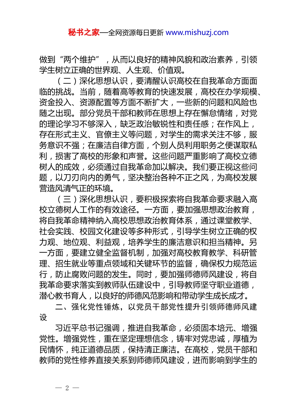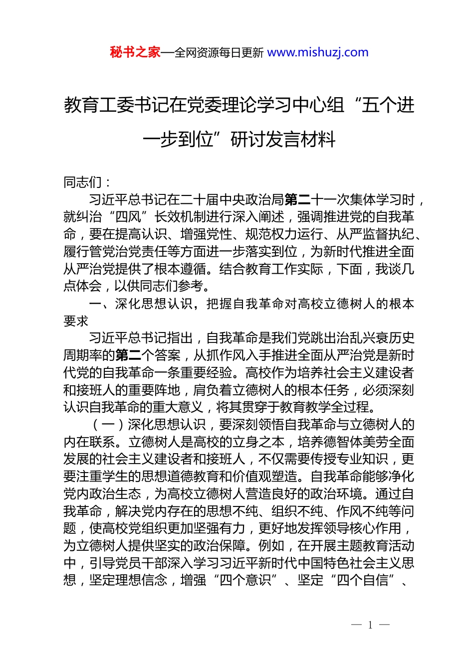 秘书之家—全网资源每日更新 www.mishuzj.com教育工委书记在党委理论学习中心组“五个进一步到位”研讨发言材料同志们:习近平总书记在二十届中央政治局第二十一次集体学习时,就纠治“四风”长效机制进行深入阐述,强调推进党的自我革命,要在提高认识、增强党性、规范权力运行、从严监督执纪、履行管党治党责任等方面进一步落实到位,为新时代推进全面从严治党提供了根本遵循。结合教育工作实际,下面,我谈几点体会,以供同志们参考。一、深化思想认识,把握自我革命对高校立德树人的根本要求习近平总书记指出,自我革命是我们党跳出治乱兴衰历史周期率的第二个答案,从抓作风入手推进全面从严治党是新时代党的自我革命一条重要经验。高校作为培养社会主义建设者和接班人的重要阵地,肩负着立德树人的根本任务,必须深刻认识自我革命的重大意义,将其贯穿于教育教学全过程。(一)深化思想认识,要深刻领悟自我革命与立德树人的内在联系。立德树人是高校的立身之本,培养德智体美劳全面发展的社会主义建设者和接班人,不仅需要传授专业知识,更要注重学生的思想道德教育和价值观塑造。自我革命能够净化党内政治生态,为高校立德树人营造良好的政治环境。通过自我革命,解决党内存在的思想不纯、组织不纯、作风不纯等问题,使高校党组织更加坚强有力,更好地发挥领导核心作用,为立德树人提供坚实的政治保障。例如,在开展主题教育活动中,引导党员干部深入学习习近平新时代中国特色社会主义思想,坚定理想信念,增强“四个意识”、坚定“四个自信”、— 1 —秘书之家—全网资源每日更新 www.mishuzj.com做到“两个维护”,从而以良好的精神风貌和政治素养,引领学生树立正确的世界观、人生观、价值观。(二)深化思想认识,要清醒认识高校在自我革命方面面临的挑战。当前,随着高等教育的快速发展,高校在办学规模、资金投入、资源配置等方面不断扩大,一些新的问题和风险也随之出现。部分党员干部和教师在思想上存在懈怠情绪,对党的理论学习不够深入,缺乏政治敏锐性和责任感;在作风上,存在形式主义、官僚主义等问题,对学生的需求关注不够,服务意识不强;在廉洁自律方面,个别人员利用职务之便谋取私利,损害了高校的形象和声誉。这些问题严重影响了高校立德树人的成效,必须通过自我革命加以解决。我们要正视这些问题,以刀刃向内的勇气,坚决整治各种不正之风,为高校发展营造风清气正的环境。(三)深化思想认识,要积极探索将自我革命要求融入高校立德树人工作的有效途径。一方面,要加强思想政治教育,将自我革命精神纳入高校思想政治教育体系,通过课堂教学、社会实践、校园文化建设等多种形式,引导学生树立正确的权力观、地位观、利益观,培养学生的廉洁意识和担当精神。另一方面,要建立健全监督机制,加强对高校教育教学、科研管理、招生就业等重点领域和关键环节的监督,确保权力规范运行,防止腐败问题的发生。同时,要加强师德师风建设,将自我革命要求落实到教师队伍建设中,引导教师坚守职业道德,潜心教书育人,以良好的师德风范影响和带动学生成长成才。二、强化党性锤炼,以党员干部党性提升引领师德师风建设习近平总书记强调,推进自我革命,必须固本培元、增强党性。增强党性,重在坚定理想信念,铸牢对党忠诚,厚植为民情怀,纯正道德品质,保持清正廉洁。在高校,党员干部和教师的党性修养直接关系到师德师风建设,进而影响到学生的— 2 —秘书之家—全网资源每日更新 www.mishuzj.com成长和发展。(一)强化党性锤炼,要加强理论武装,坚定理想信念。高校要把学习贯彻习近平新时代中国特色社会主义思想作为首要政治任务,通过理论学习中心组学习、“三会一课”、主题党日等活动,引导党员干部和教师深入学习党的创新理论,深刻领悟“两个确立”的决定性意义,增强“四个意识”、坚定“四个自信”、做到“两个维护”。例如,定期举办专题讲座、读书班、研讨会等,邀请专家学者进行深入解读,组织党员干部和教师交流学习心得,不断提高政治理论水平。同时,要注重学以致用,将理论学习与教育教学实践相结合,引导党员干部和教师在工作中践行...