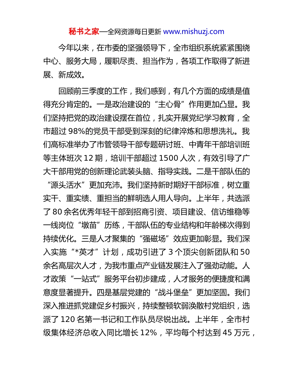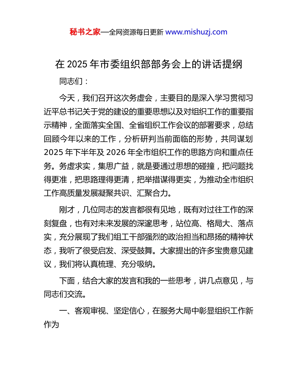 秘书之家—全网资源每日更新 www.mishuzj.com在 2025 年市委组织部部务会上的讲话提纲同志们:今天,我们召开这次务虚会,主要目的是深入学习贯彻习近平总书记关于党的建设的重要思想以及对组织工作的重要指示精神,全面落实全国、全省组织工作会议的部署要求,总结回顾今年以来的工作,分析研判当前面临的形势,共同谋划2025 年下半年及 2026 年全市组织工作的思路方向和重点任务。务虚求实,集思广益,就是要通过思想的碰撞,把问题找得更准,把思路理得更清,把举措谋得更实,为推动全市组织工作高质量发展凝聚共识、汇聚合力。刚才,几位同志的发言都很有见地,既有对过往工作的深刻复盘,也有对未来发展的深邃思考,站位高、格局大、落点实,充分展现了我们组工干部强烈的政治担当和昂扬的精神状态,我听了很受启发、深受鼓舞。大家提出的许多宝贵意见建议,我们将认真梳理、充分吸纳。下面,结合大家的发言和我的一些思考,讲几点意见,与同志们交流。一、客观审视、坚定信心,在服务大局中彰显组织工作新作为秘书之家—全网资源每日更新 www.mishuzj.com今年以来,在市委的坚强领导下,全市组织系统紧紧围绕中心、服务大局,履职尽责、担当作为,各项工作取得了新进展、新成效。回顾前三季度的工作,我们感到,有几个方面的成绩是值得充分肯定的。一是政治建设的“主心骨”作用更加凸显。我们坚持把党的政治建设摆在首位,扎实开展党纪学习教育,全市超过 98%的党员干部受到深刻的纪律淬炼和思想洗礼。我们高标准举办了市管领导干部专题研讨班、中青年干部培训班等主体班次 12 期,培训干部超过 1500 人次,有效引导了广大干部用党的创新理论武装头脑、指导实践。二是干部队伍的“源头活水”更加充沛。我们坚持新时期好干部标准,树立重实干、重实绩、重担当的鲜明选人用人导向。上半年,共选派了 80 余名优秀年轻干部到招商引资、项目建设、信访维稳等一线岗位“墩苗”历练,干部队伍的专业结构和年龄梯次得到持续优化。三是人才聚集的“强磁场”效应更加彰显。我们深入实施“*英才”计划,成功引进了 3 个顶尖创新团队和 50余名高层次人才,为我市重点产业链发展注入了强劲动能。人才政策“一站式”服务平台初步建成,人才服务的便捷度和满意度显著提升。四是基层党建的“战斗堡垒”更加坚固。我们深入推进抓党建促乡村振兴,持续整顿软弱涣散村党组织,选派了 120 名第一书记和工作队员尽锐出战。上半年,全市村级集体经济总收入同比增长 12%,平均每个村达到 45 万元,秘书之家—全网资源每日更新 www.mishuzj.com有力地夯实了乡村全面振兴的组织基础。在肯定成绩的同时,我们更要清醒地认识到工作中存在的短板和不足。正如刚才一些同志提到的,我们的工作还面临着不少挑战。这些问题,需要我们高度重视,并在下一步工作中切实加以解决。二、把握大势、直面挑战,深刻认识组织工作面临的新形势新任务当前,我们正处在一个深刻变革的时代,新一轮科技革命和产业变革加速演进,区域竞争日趋激烈,高质量发展的任务艰巨繁重。这为我们的组织工作带来了前所未有的新挑战、新要求。(一)干部能力素质面临“本领恐慌”的挑战。随着我市深度融入*城市群、建设*产业先行区域重大战略的推进,对干部驾驭市场经济、推动科技创新、应对复杂局面的能力提出了更高要求。但从现状来看,部分干部知识结构老化、专业能力不足、视野格局不宽的问题依然存在,“老办法不管用、新办法不会用”的现象时有发生。如何大规模、高效率地提升干部队伍的专业化能力,是我们必须破解的紧迫课题。(二)人才竞争格局面临“高端流失”的挑战。近年来,我们虽然在人才工作上投入了很大力气,但与*、*等先进地区相比,我们的人才政策吸引力、平台承载力、服务软实力仍有差距。高层次创新人才、产业领军人才和高技能人才“引不来、秘书之家—全网资源每日更新 www.mishuzj.com留不住”的问题比较突出,人才结构与我市产业转型升级的需求还不完全匹配,人才“蓄水池”亟待加固。(三)基层治理模式面临“转型阵痛”的挑战。随着城镇化进程加快,城乡结构、社会结构、利益格局发...