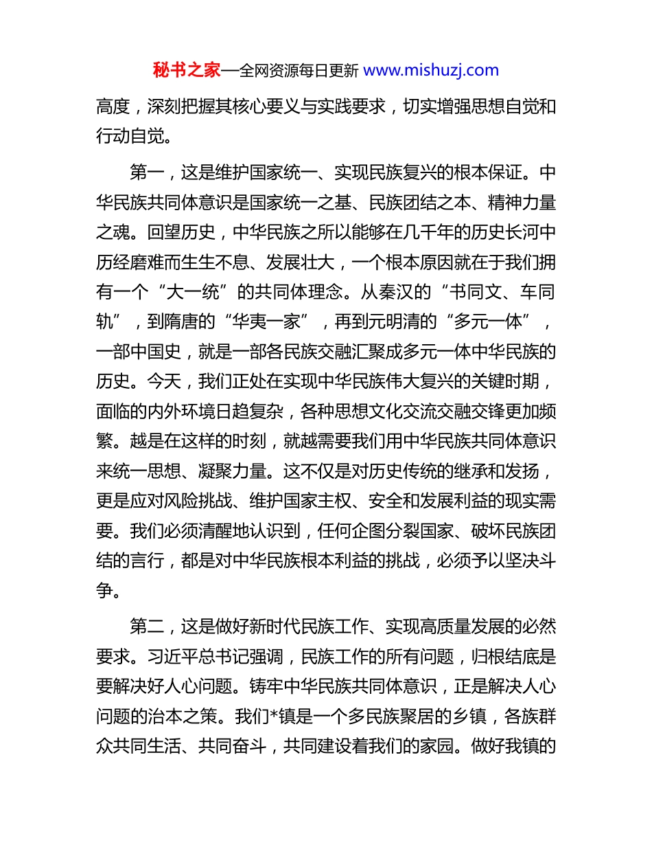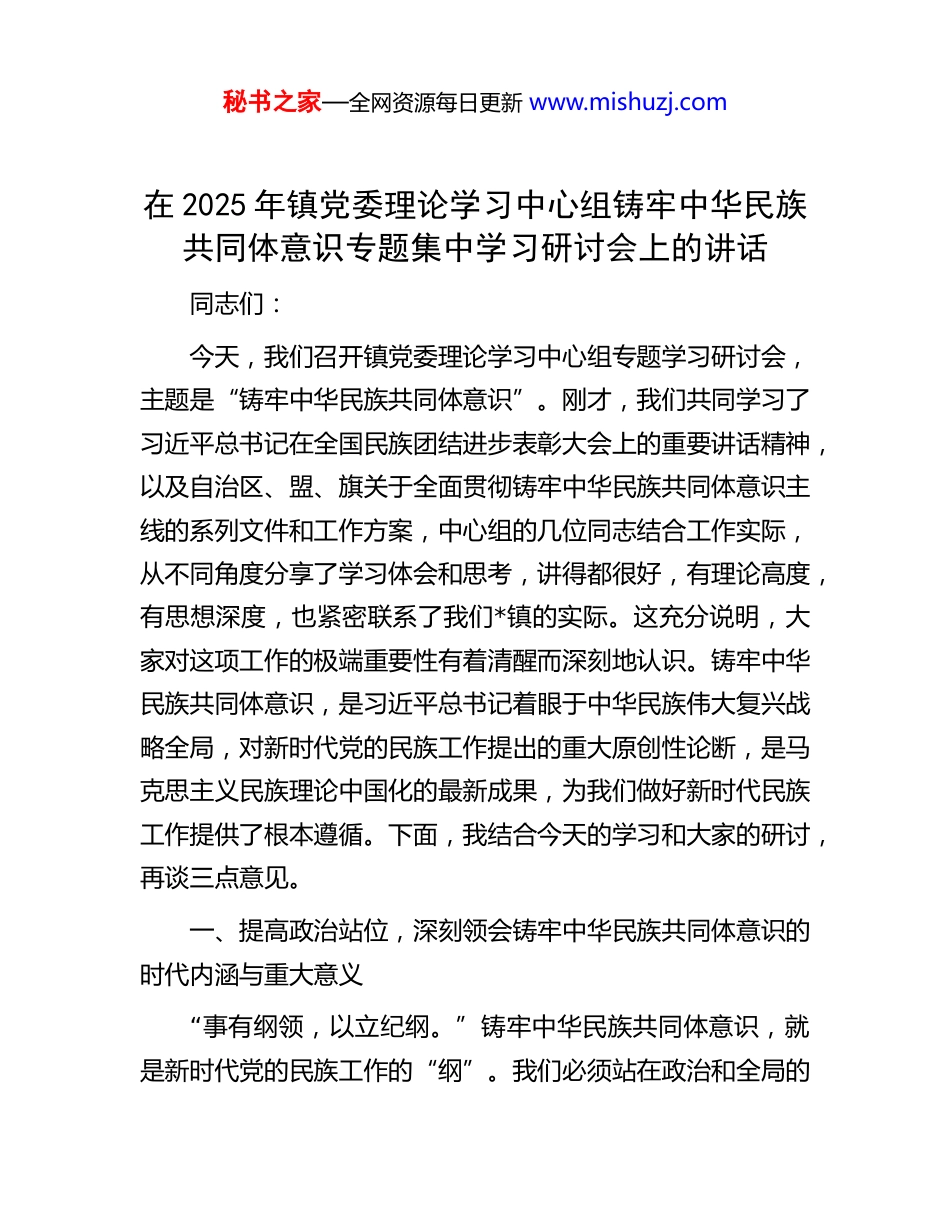 秘书之家—全网资源每日更新 www.mishuzj.com在 2025 年镇党委理论学习中心组铸牢中华民族共同体意识专题集中学习研讨会上的讲话同志们:今天,我们召开镇党委理论学习中心组专题学习研讨会,主题是“铸牢中华民族共同体意识”。刚才,我们共同学习了习近平总书记在全国民族团结进步表彰大会上的重要讲话精神,以及自治区、盟、旗关于全面贯彻铸牢中华民族共同体意识主线的系列文件和工作方案,中心组的几位同志结合工作实际,从不同角度分享了学习体会和思考,讲得都很好,有理论高度,有思想深度,也紧密联系了我们*镇的实际。这充分说明,大家对这项工作的极端重要性有着清醒而深刻地认识。铸牢中华民族共同体意识,是习近平总书记着眼于中华民族伟大复兴战略全局,对新时代党的民族工作提出的重大原创性论断,是马克思主义民族理论中国化的最新成果,为我们做好新时代民族工作提供了根本遵循。下面,我结合今天的学习和大家的研讨,再谈三点意见。一、提高政治站位,深刻领会铸牢中华民族共同体意识的时代内涵与重大意义“事有纲领,以立纪纲。”铸牢中华民族共同体意识,就是新时代党的民族工作的“纲”。我们必须站在政治和全局的秘书之家—全网资源每日更新 www.mishuzj.com高度,深刻把握其核心要义与实践要求,切实增强思想自觉和行动自觉。第一,这是维护国家统一、实现民族复兴的根本保证。中华民族共同体意识是国家统一之基、民族团结之本、精神力量之魂。回望历史,中华民族之所以能够在几千年的历史长河中历经磨难而生生不息、发展壮大,一个根本原因就在于我们拥有一个“大一统”的共同体理念。从秦汉的“书同文、车同轨”,到隋唐的“华夷一家”,再到元明清的“多元一体”,一部中国史,就是一部各民族交融汇聚成多元一体中华民族的历史。今天,我们正处在实现中华民族伟大复兴的关键时期,面临的内外环境日趋复杂,各种思想文化交流交融交锋更加频繁。越是在这样的时刻,就越需要我们用中华民族共同体意识来统一思想、凝聚力量。这不仅是对历史传统的继承和发扬,更是应对风险挑战、维护国家主权、安全和发展利益的现实需要。我们必须清醒地认识到,任何企图分裂国家、破坏民族团结的言行,都是对中华民族根本利益的挑战,必须予以坚决斗争。第二,这是做好新时代民族工作、实现高质量发展的必然要求。习近平总书记强调,民族工作的所有问题,归根结底是要解决好人心问题。铸牢中华民族共同体意识,正是解决人心问题的治本之策。我们*镇是一个多民族聚居的乡镇,各族群众共同生活、共同奋斗,共同建设着我们的家园。做好我镇的秘书之家—全网资源每日更新 www.mishuzj.com民族工作,前提就是要让“三个离不开”“五个认同”的思想深深植根于每一个干部群众的心中。只有各族人民心往一处想、劲往一处使,才能形成推动经济社会发展的强大合力。当前,我镇正处于巩固拓展脱贫攻坚成果、全面推进乡村振兴的关键阶段,无论是发展庭院经济、改善人居环境,还是提升社会治理水平,都离不开各族群众的共同参与和团结奋斗。将铸牢中华民族共同体意识这条主线贯穿于全镇经济社会发展的各领域、全过程,才能确保我们的发展成果惠及每一位群众,才能不断提升各族群众的获得感、幸福感、安全感。第三,这是加强党的全面领导、巩固执政根基的战略举措我们党自成立之日起,就始终把解决民族问题、做好民族工作作为关系党和人民事业发展全局的大事。党的领导是民族工作取得胜利的根本保证。在新征程上,坚持和加强党对民族工作的全面领导,最核心、最关键的就是要以铸牢中华民族共同体意识为主线,不断巩固和发展平等团结互助和谐的社会主义民族关系。这项工作做得好不好,直接关系到党在民族地区的执政基础是否牢固,关系到边疆地区的繁荣稳定。我们作为基层党委,是党联系服务各族群众的“最后一公里”,肩负着把党中央的决策部署不折不扣落到实处的重大政治责任。我们必须把这项工作紧紧抓在手上,将其作为检验我们政治判断力、政治领悟力、政治执行力的重要标尺。秘书之家—全网资源每日更新 www.mishuzj.com二、总结实践成效,清醒认识当前工作中存在的短板与不足近年...