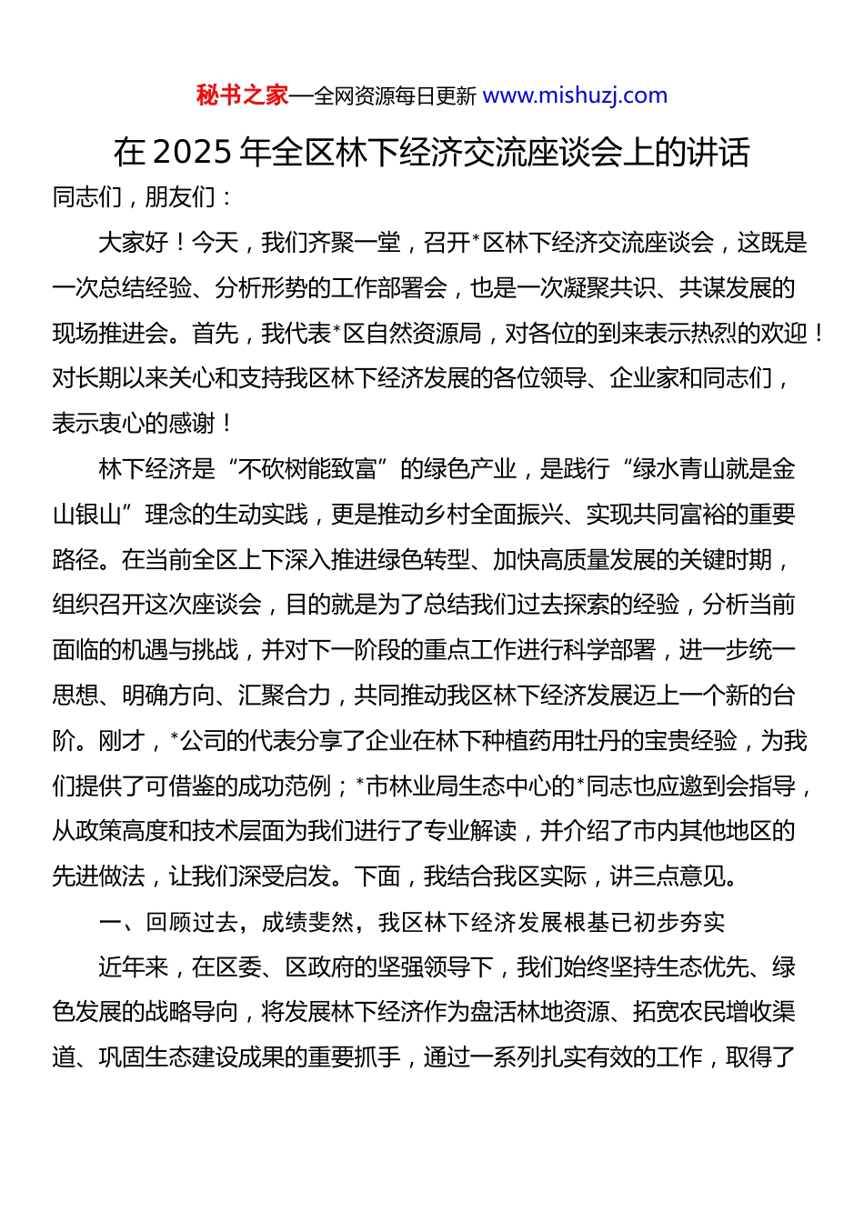秘书之家—全网资源每日更新 www.mishuzj.com在 2025 年全区林下经济交流座谈会上的讲话同志们,朋友们:大家好!今天,我们齐聚一堂,召开*区林下经济交流座谈会,这既是一次总结经验、分析形势的工作部署会,也是一次凝聚共识、共谋发展的现场推进会。首先,我代表*区自然资源局,对各位的到来表示热烈的欢迎!对长期以来关心和支持我区林下经济发展的各位领导、企业家和同志们,表示衷心的感谢!林下经济是“不砍树能致富”的绿色产业,是践行“绿水青山就是金山银山”理念的生动实践,更是推动乡村全面振兴、实现共同富裕的重要路径。在当前全区上下深入推进绿色转型、加快高质量发展的关键时期,组织召开这次座谈会,目的就是为了总结我们过去探索的经验,分析当前面临的机遇与挑战,并对下一阶段的重点工作进行科学部署,进一步统一思想、明确方向、汇聚合力,共同推动我区林下经济发展迈上一个新的台阶。刚才,*公司的代表分享了企业在林下种植药用牡丹的宝贵经验,为我们提供了可借鉴的成功范例;*市林业局生态中心的*同志也应邀到会指导,从政策高度和技术层面为我们进行了专业解读,并介绍了市内其他地区的先进做法,让我们深受启发。下面,我结合我区实际,讲三点意见。一、回顾过去,成绩斐然,我区林下经济发展根基已初步夯实近年来,在区委、区政府的坚强领导下,我们始终坚持生态优先、绿色发展的战略导向,将发展林下经济作为盘活林地资源、拓宽农民增收渠道、巩固生态建设成果的重要抓手,通过一系列扎实有效的工作,取得了秘书之家—全网资源每日更新 www.mishuzj.com阶段性成效。一是产业规模持续扩大,发展态势日益向好。我们立足全区总面积约*万亩的林地资源,积极引导和鼓励农户、合作社及企业因地制宜发展林下种植、林下养殖等多元化经营模式。截至 2024 年底,我区林下经济经营利用面积已达到 8.5 万亩,实现总产值近 3.2 亿元,同比增长 17.5%,连续三年保持了两位数以上的快速增长。这一系列数据背后,是我区林业产业结构不断优化、生态产品价值实现机制不断完善的有力证明。二是模式创新多点开花,特色品牌崭露头角。我们探索并推广了多种富有成效的发展模式。以*公司为代表的“龙头企业+基地+农户”模式,通过发展林下药用牡丹种植,不仅有效提升了林地的综合效益,更带动了周边超过 300 户农户实现年均增收 2 万元以上。同时,“林+禽”“林+菌”“林+药”等复合经营模式也在全区范围内得到推广,涌现出了一批如林下生态鸡养殖、羊肚菌种植等特色项目。这些成功的探索,不仅丰富了我区的“米袋子”和“菜篮子”,更鼓起了广大林农的“钱袋子”。我们还积极引导经营主体申请绿色、有机产品认证,初步培育了几个具有地方特色的林下产品品牌,市场认知度正在稳步提升。三是政策体系不断完善,服务保障坚实有力。为激发市场主体的内生动力,我区自然资源局联合财政、农业等部门,研究出台了一系列扶持政策。虽然目前尚未形成专门针对林下经济的系统性文件,但我们在林业发展资金中,已明确将林下经济项目纳入优先支持范围,并在项目贷款贴息、基地水电基础设施建设等方面给予倾斜。我们成立了由林业技术专家组成秘书之家—全网资源每日更新 www.mishuzj.com的技术服务团队,全年不定期深入田间地头,为经营主体提供从种苗选择、田间管理到病虫害防治的全程技术指导,有效解决了“想干但不会干”的技术难题。四是 dj 引领作用凸显,组织保障更加坚强。按照区组织部门的指导意见,我们坚持将 dj 工作与产业发展深度融合,探索把*支部建在产业链上、把*小组设在合作社里。通过发挥基层*组织的战斗堡垒作用和*员的先锋模范作用,有效整合了土地、资金、技术、人才等各类资源,破解了许多发展中的难题,为我区林下经济的持续健康发展提供了最可靠的组织保障。虽然我们取得了一些成绩,但这仅仅是迈出了第一步。我们必须清醒地认识到,与市内乃至国内的先进地区相比,我区林下经济发展仍然存在一些不容忽视的短板和问题。二、正视现状,认清形势,深刻把握林下经济发展的机遇与挑战当前,我区林下经济发展正处在一个重要的战略机遇期,同时...
