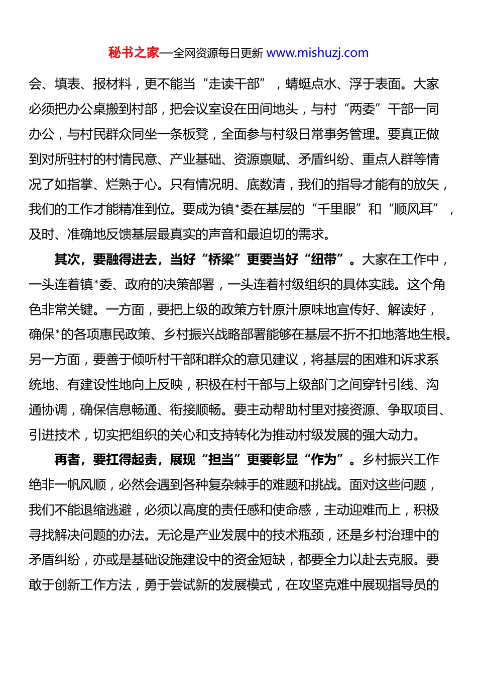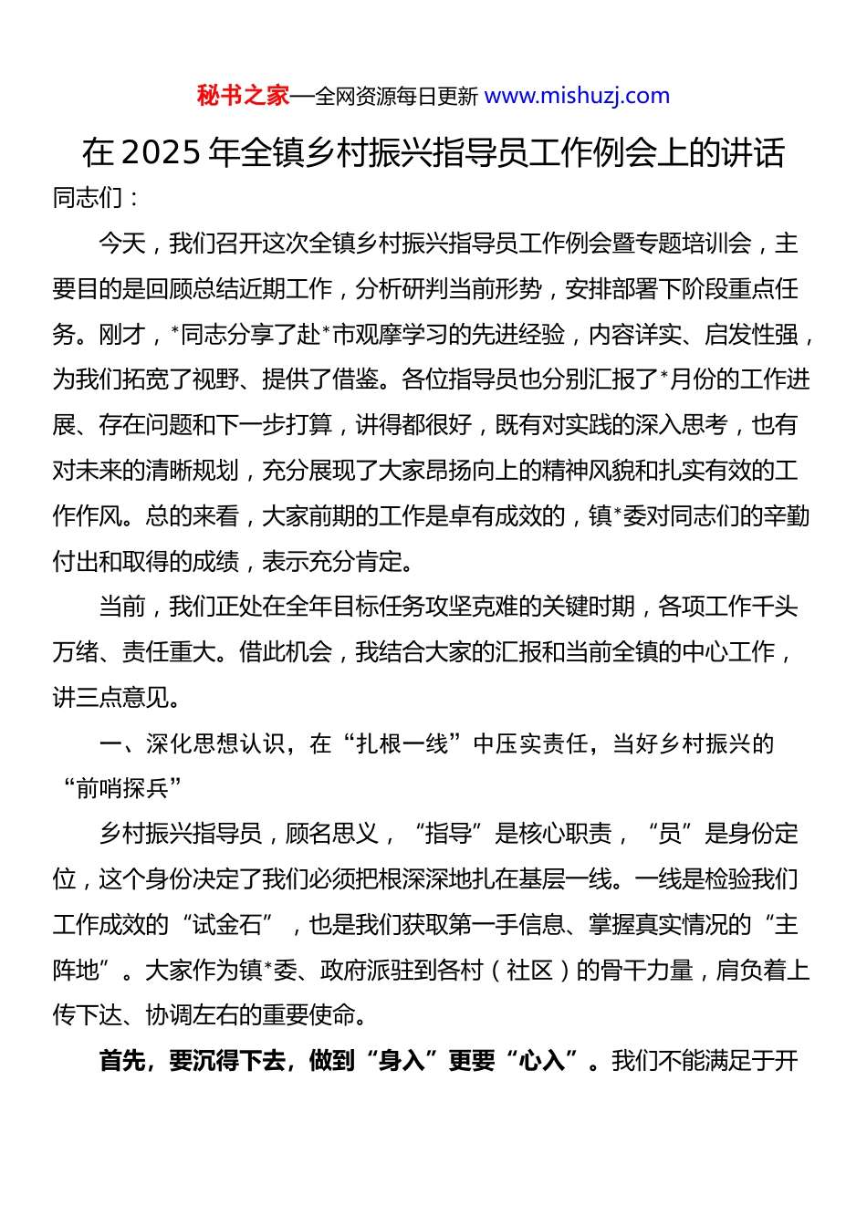 秘书之家—全网资源每日更新 www.mishuzj.com在 2025 年全镇乡村振兴指导员工作例会上的讲话同志们:今天,我们召开这次全镇乡村振兴指导员工作例会暨专题培训会,主要目的是回顾总结近期工作,分析研判当前形势,安排部署下阶段重点任务。刚才,*同志分享了赴*市观摩学习的先进经验,内容详实、启发性强,为我们拓宽了视野、提供了借鉴。各位指导员也分别汇报了*月份的工作进展、存在问题和下一步打算,讲得都很好,既有对实践的深入思考,也有对未来的清晰规划,充分展现了大家昂扬向上的精神风貌和扎实有效的工作作风。总的来看,大家前期的工作是卓有成效的,镇*委对同志们的辛勤付出和取得的成绩,表示充分肯定。当前,我们正处在全年目标任务攻坚克难的关键时期,各项工作千头万绪、责任重大。借此机会,我结合大家的汇报和当前全镇的中心工作,讲三点意见。一、深化思想认识,在“扎根一线”中压实责任,当好乡村振兴的“前哨探兵”乡村振兴指导员,顾名思义,“指导”是核心职责,“员”是身份定位,这个身份决定了我们必须把根深深地扎在基层一线。一线是检验我们工作成效的“试金石”,也是我们获取第一手信息、掌握真实情况的“主阵地”。大家作为镇*委、政府派驻到各村(社区)的骨干力量,肩负着上传下达、协调左右的重要使命。首先,要沉得下去,做到“身入”更要“心入”。我们不能满足于开秘书之家—全网资源每日更新 www.mishuzj.com会、填表、报材料,更不能当“走读干部”,蜻蜓点水、浮于表面。大家必须把办公桌搬到村部,把会议室设在田间地头,与村“两委”干部一同办公,与村民群众同坐一条板凳,全面参与村级日常事务管理。要真正做到对所驻村的村情民意、产业基础、资源禀赋、矛盾纠纷、重点人群等情况了如指掌、烂熟于心。只有情况明、底数清,我们的指导才能有的放矢,我们的工作才能精准到位。要成为镇*委在基层的“千里眼”和“顺风耳”,及时、准确地反馈基层最真实的声音和最迫切的需求。其次,要融得进去,当好“桥梁”更要当好“纽带”。大家在工作中,一头连着镇*委、政府的决策部署,一头连着村级组织的具体实践。这个角色非常关键。一方面,要把上级的政策方针原汁原味地宣传好、解读好,确保*的各项惠民政策、乡村振兴战略部署能够在基层不折不扣地落地生根。另一方面,要善于倾听村干部和群众的意见建议,将基层的困难和诉求系统地、有建设性地向上反映,积极在村干部与上级部门之间穿针引线、沟通协调,确保信息畅通、衔接顺畅。要主动帮助村里对接资源、争取项目、引进技术,切实把组织的关心和支持转化为推动村级发展的强大动力。再者,要扛得起责,展现“担当”更要彰显“作为”。乡村振兴工作绝非一帆风顺,必然会遇到各种复杂棘手的难题和挑战。面对这些问题,我们不能退缩逃避,必须以高度的责任感和使命感,主动迎难而上,积极寻找解决问题的办法。无论是产业发展中的技术瓶颈,还是乡村治理中的矛盾纠纷,亦或是基础设施建设中的资金短缺,都要全力以赴去克服。要敢于创新工作方法,勇于尝试新的发展模式,在攻坚克难中展现指导员的秘书之家—全网资源每日更新 www.mishuzj.com担当和风采,以实实在在的工作成效赢得群众的信任和支持,真正成为推动乡村振兴的中坚力量。二、聚焦核心任务,在“精准发力”中破解难题,当好乡村发展的“开路先锋”乡村振兴是一篇大文章,涉及产业、人才、文化、生态、组织等方方面面。作为指导员,我们必须学会“弹钢琴”,既要统筹兼顾,又要善于抓住主要矛盾和矛盾的主要方面。当前和今后一个时期,我们必须紧紧围绕镇里下发的年度乡村振兴任务清单,牢牢扭住以下几个核心指标不放松,集中精力抓好村级核心事务。第一,要以产业发展为根本,在壮大村级集体经济上实现新突破。产业兴旺是解决农村一切问题的前提。没有产业支撑,乡村振兴就是无源之水、无本之木。从上半年的情况看,我镇村级集体经济发展势头良好,总收入达到了 3850 万元,同比增长了 12.6%,但我们也要清醒地看到,各村之间发展不平衡的问题依然突出,部分村的产业模式单一、附加值低,抵御市场风险能力较弱。下一步,我们...