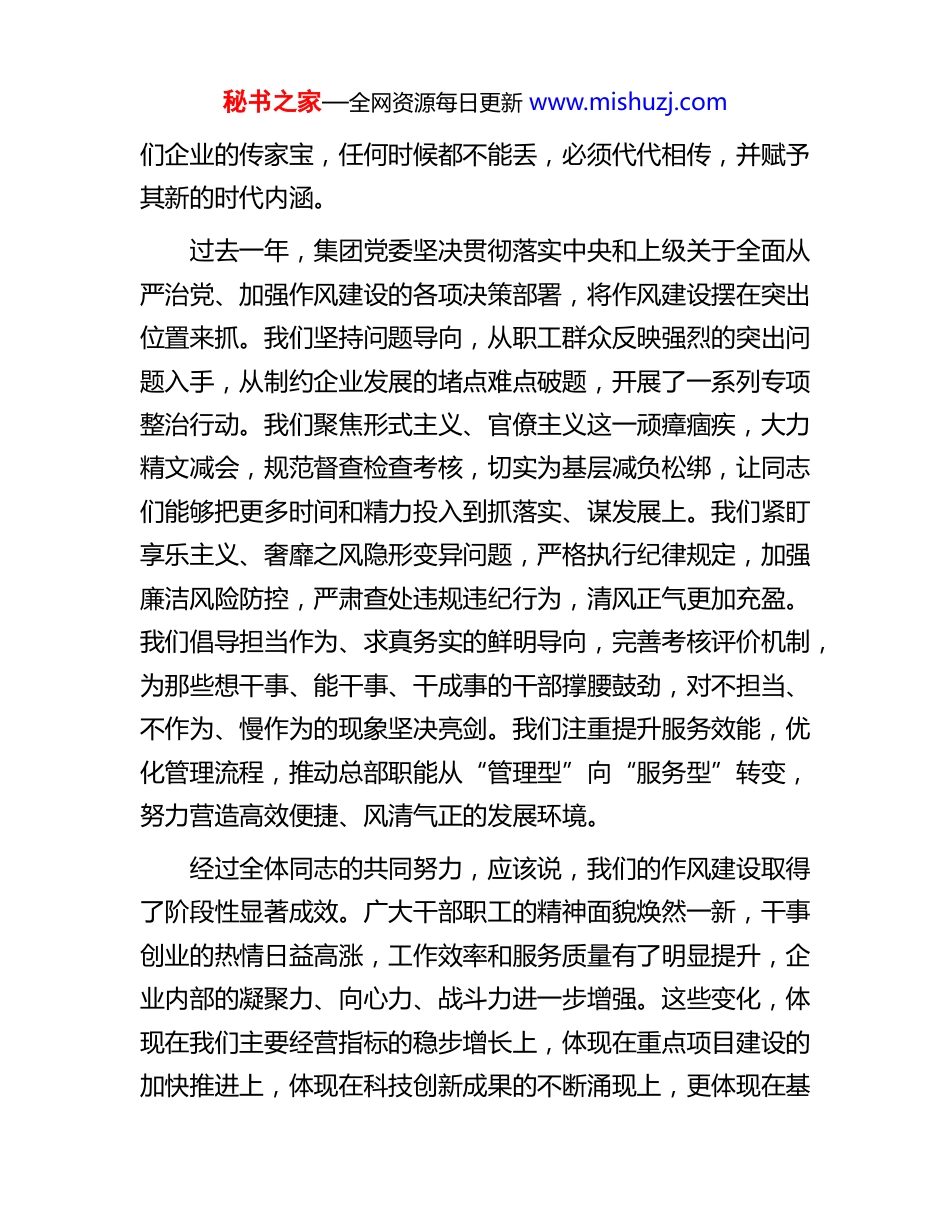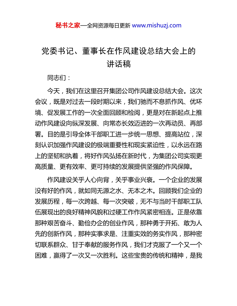 秘书之家—全网资源每日更新 www.mishuzj.com党委书记、董事长在作风建设总结大会上的讲话稿同志们:今天,我们在这里召开集团公司作风建设总结大会。这次会议,既是对过去一段时期以来,我们驰而不息抓作风、优环境、促发展工作的一次全面回顾和检阅,更是对在新起点上推动作风建设向纵深发展、向常态长效迈进的一次再动员、再部署。目的是引导全体干部职工进一步统一思想、提高站位,深刻认识加强作风建设的极端重要性和现实紧迫性,以永远在路上的坚韧和执着,将好作风弘扬在新时代,为集团公司实现更高质量、更有效率、更可持续的发展提供坚强的作风保障。作风建设关乎人心向背,关乎事业兴衰。一个企业的发展没有好的作风,就如同无源之水、无本之木。回顾我们企业的发展历程,每一次跨越、每一次突破,无不与当时干部职工队伍展现出的良好精神风貌和过硬工作作风紧密相连。正是依靠那种艰苦奋斗、勤俭办企的创业作风,那种勇于开拓、敢为人先的创新作风,那种实事求是、注重实效的务实作风,那种密切联系群众、甘于奉献的服务作风,我们才克服了一个又一个困难,赢得了一次又一次胜利。这些宝贵的传统和精神,是我秘书之家—全网资源每日更新 www.mishuzj.com们企业的传家宝,任何时候都不能丢,必须代代相传,并赋予其新的时代内涵。过去一年,集团党委坚决贯彻落实中央和上级关于全面从严治党、加强作风建设的各项决策部署,将作风建设摆在突出位置来抓。我们坚持问题导向,从职工群众反映强烈的突出问题入手,从制约企业发展的堵点难点破题,开展了一系列专项整治行动。我们聚焦形式主义、官僚主义这一顽瘴痼疾,大力精文减会,规范督查检查考核,切实为基层减负松绑,让同志们能够把更多时间和精力投入到抓落实、谋发展上。我们紧盯享乐主义、奢靡之风隐形变异问题,严格执行纪律规定,加强廉洁风险防控,严肃查处违规违纪行为,清风正气更加充盈。我们倡导担当作为、求真务实的鲜明导向,完善考核评价机制,为那些想干事、能干事、干成事的干部撑腰鼓劲,对不担当、不作为、慢作为的现象坚决亮剑。我们注重提升服务效能,优化管理流程,推动总部职能从“管理型”向“服务型”转变,努力营造高效便捷、风清气正的发展环境。经过全体同志的共同努力,应该说,我们的作风建设取得了阶段性显著成效。广大干部职工的精神面貌焕然一新,干事创业的热情日益高涨,工作效率和服务质量有了明显提升,企业内部的凝聚力、向心力、战斗力进一步增强。这些变化,体现在我们主要经营指标的稳步增长上,体现在重点项目建设的加快推进上,体现在科技创新成果的不断涌现上,更体现在基秘书之家—全网资源每日更新 www.mishuzj.com层单位和职工群众满意度、获得感的切实提升上。对此,职工群众是认可的,上级组织是肯定的。在此,我代表集团党委,向为作风建设付出辛勤努力的全体干部职工,表示衷心的感谢!在肯定成绩的同时,我们更要保持清醒的头脑,绝不能有松口气、歇歇脚的想法。作风建设永远在路上,一些深层次问题具有顽固性和反复性,不可能一蹴而就、一劳永逸。我们必须清醒地看到,与新时代新任务的要求相比,与职工群众的期盼相比,我们的作风建设仍然存在一些不容忽视的问题和差距。比如,形式主义、官僚主义在某些方面、某些环节依然存在,有时还改头换面、潜入地下。有的工作满足于“开了会、发了文”,但在抓落实的“最后一公里”上力度不够、效果不彰;有的干部习惯于坐在办公室听汇报、看材料,深入基层一线调研解决实际问题的次数不多、深度不够;有的部门在制定政策、部署任务时,未能充分考虑基层实际,存在“一刀切”现象,增加了执行难度。再比如,担当精神不足、斗争本领不强的问题依然存在。面对改革发展中的硬骨头,有的同志存在畏难情绪,缺乏攻坚克难的锐气和勇气,“等靠要”思想仍未根除;面对市场竞争的严峻挑战,有的同志创新意识不强,习惯于按部就班、墨守成规,敢闯敢试、敢为人先的劲头有所减弱。还比如,服务意识、工作效率仍有提升空间。个别窗口单位、服务岗位还存在“门好进、脸好看、事难办”的现象,审批环节多、流程长的问题尚未根本解决;...