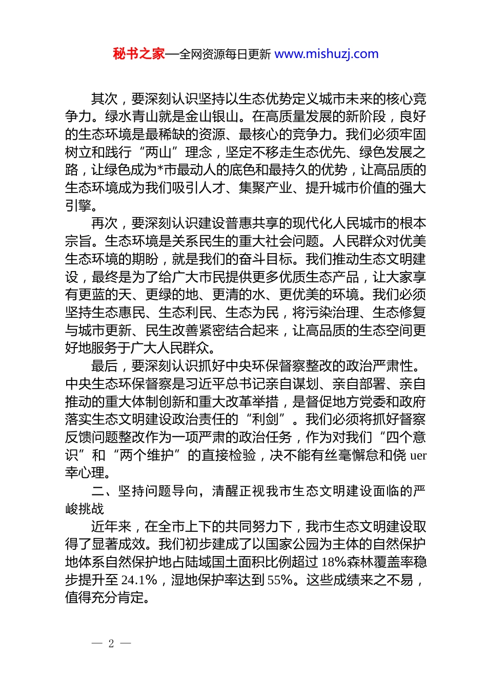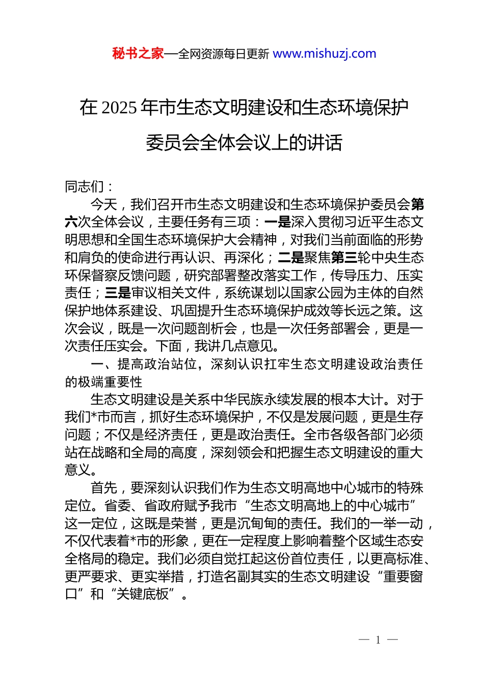 秘书之家—全网资源每日更新 www.mishuzj.com在 2025 年市生态文明建设和生态环境保护委员会全体会议上的讲话同志们:今天,我们召开市生态文明建设和生态环境保护委员会第六次全体会议,主要任务有三项:一是深入贯彻习近平生态文明思想和全国生态环境保护大会精神,对我们当前面临的形势和肩负的使命进行再认识、再深化;二是聚焦第三轮中央生态环保督察反馈问题,研究部署整改落实工作,传导压力、压实责任;三是审议相关文件,系统谋划以国家公园为主体的自然保护地体系建设、巩固提升生态环境保护成效等长远之策。这次会议,既是一次问题剖析会,也是一次任务部署会,更是一次责任压实会。下面,我讲几点意见。一、提高政治站位,深刻认识扛牢生态文明建设政治责任的极端重要性生态文明建设是关系中华民族永续发展的根本大计。对于我们*市而言,抓好生态环境保护,不仅是发展问题,更是生存问题;不仅是经济责任,更是政治责任。全市各级各部门必须站在战略和全局的高度,深刻领会和把握生态文明建设的重大意义。首先,要深刻认识我们作为生态文明高地中心城市的特殊定位。省委、省政府赋予我市“生态文明高地上的中心城市”这一定位,这既是荣誉,更是沉甸甸的责任。我们的一举一动,不仅代表着*市的形象,更在一定程度上影响着整个区域生态安全格局的稳定。我们必须自觉扛起这份首位责任,以更高标准、更严要求、更实举措,打造名副其实的生态文明建设“重要窗口”和“关键底板”。— 1 —秘书之家—全网资源每日更新 www.mishuzj.com其次,要深刻认识坚持以生态优势定义城市未来的核心竞争力。绿水青山就是金山银山。在高质量发展的新阶段,良好的生态环境是最稀缺的资源、最核心的竞争力。我们必须牢固树立和践行“两山”理念,坚定不移走生态优先、绿色发展之路,让绿色成为*市最动人的底色和最持久的优势,让高品质的生态环境成为我们吸引人才、集聚产业、提升城市价值的强大引擎。再次,要深刻认识建设普惠共享的现代化人民城市的根本宗旨。生态环境是关系民生的重大社会问题。人民群众对优美生态环境的期盼,就是我们的奋斗目标。我们推动生态文明建设,最终是为了给广大市民提供更多优质生态产品,让大家享有更蓝的天、更绿的地、更清的水、更优美的环境。我们必须坚持生态惠民、生态利民、生态为民,将污染治理、生态修复与城市更新、民生改善紧密结合起来,让高品质的生态空间更好地服务于广大人民群众。最后,要深刻认识抓好中央环保督察整改的政治严肃性。中央生态环保督察是习近平总书记亲自谋划、亲自部署、亲自推动的重大体制创新和重大改革举措,是督促地方党委和政府落实生态文明建设政治责任的“利剑”。我们必须将抓好督察反馈问题整改作为一项严肃的政治任务,作为对我们“四个意识”和“两个维护”的直接检验,决不能有丝毫懈怠和侥 uer幸心理。二、坚持问题导向,清醒正视我市生态文明建设面临的严峻挑战近年来,在全市上下的共同努力下,我市生态文明建设取得了显著成效。我们初步建成了以国家公园为主体的自然保护地体系自然保护地占陆域国土面积比例超过 18%森林覆盖率稳步提升至 24.1%,湿地保护率达到 55%。这些成绩来之不易,值得充分肯定。— 2 —秘书之家—全网资源每日更新 www.mishuzj.com但是,我们必须清醒地看到,对照中央的要求、人民的期盼和我们自身的定位,我市的生态环境保护工作仍然存在不少短板和弱项。第三轮中央生态环保督察反馈的意见,以及我们日常工作中掌握的情况,都印证了这一点。这些问题,根源不除,后患无穷,必须下定决心、动真碰硬加以解决。第一,思想认识的“偏差”依然存在。少数单位和干部对生态文明思想的认识和贯彻还停留在口头上,没有真正融入决策和实践中。有的认为经济发展是硬任务,生态保护是软指标,存在“重发展、轻保护”的惯性思维。有的对“党政同责、‘一岗双责’”的理解和落实不到位,压力传导层层递减,导致责任悬空。这种思想上的“温差”,是导致各类生态环境问题屡禁不止、反复发作的总根源。第二,污染防治攻坚的“硬仗”依然艰巨。蓝天、碧水、净土保卫战虽取得阶段性成效,...
