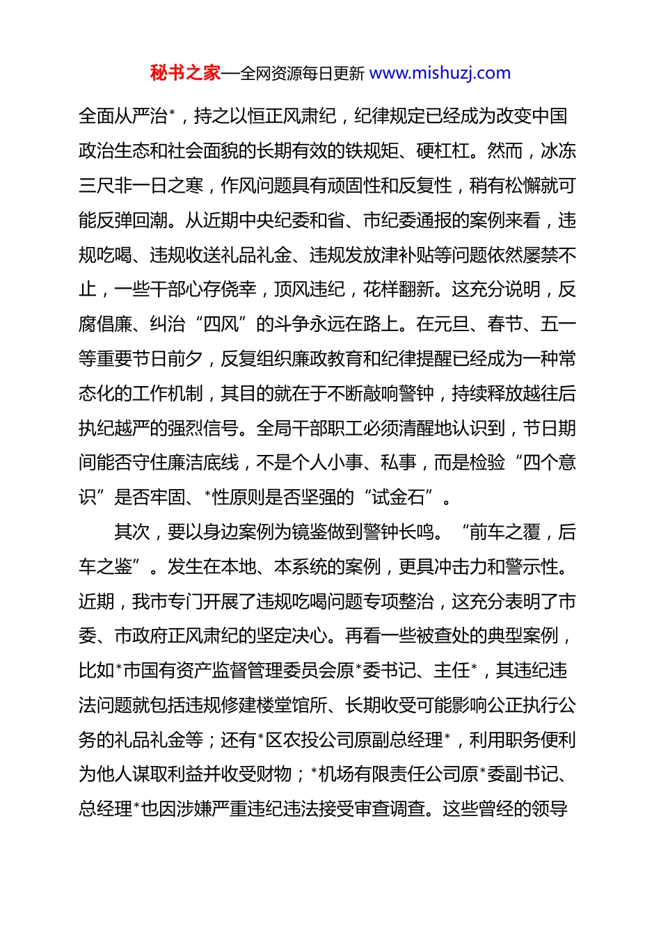 秘书之家—全网资源每日更新 www.mishuzj.com在 2025 年市审计局国庆中秋节前廉政教育和安全生产工作安排会议上的讲话同志们:在国庆、中秋两大佳节即将来临之际,我们今天专门召开这次会议,主要任务有两项:一是进行节前廉政警示教育,重申纪律要求,筑牢思想防线,确保全局干部职工度过一个风清气正、廉洁文明的节日;二是安排部署当前及节日期间的安全生产工作,压实各方责任,消除风险隐患,确保审计事业安全稳定发展。刚才,相关同志已经传达了上级有关正风肃纪和安全生产工作的最新精神与通报,要求很明确,措施很具体,大家要认真领会,坚决抓好贯彻落实。下面,我再讲三点意见。一、认清形势,筑牢思想防线,时刻绷紧廉洁自律之弦“廉不廉,看过年;洁不洁,看过节”。节日期间是人情往来的高峰期,也是考验*员干部*性修养、廉洁自律意识的关键节点,更是“四风”问题易发多发的高风险期。审计机关作为国家财产的“看门人”、经济安全的“守护者”,审计干部作为这支队伍的中坚力量,自身的廉洁与否,直接关系到审计监督的公信力和权威性。因此,必须以更高的标准、更严的要求、更实的举措,抓好节日期间的*风廉政建设。首先,要从政治高度深刻认识节日反腐的重要性。*的十八大以来,以***同志为核心的*中央以前所未有的决心和力度推进秘书之家—全网资源每日更新 www.mishuzj.com全面从严治*,持之以恒正风肃纪,纪律规定已经成为改变中国政治生态和社会面貌的长期有效的铁规矩、硬杠杠。然而,冰冻三尺非一日之寒,作风问题具有顽固性和反复性,稍有松懈就可能反弹回潮。从近期中央纪委和省、市纪委通报的案例来看,违规吃喝、违规收送礼品礼金、违规发放津补贴等问题依然屡禁不止,一些干部心存侥幸,顶风违纪,花样翻新。这充分说明,反腐倡廉、纠治“四风”的斗争永远在路上。在元旦、春节、五一等重要节日前夕,反复组织廉政教育和纪律提醒已经成为一种常态化的工作机制,其目的就在于不断敲响警钟,持续释放越往后执纪越严的强烈信号。全局干部职工必须清醒地认识到,节日期间能否守住廉洁底线,不是个人小事、私事,而是检验“四个意识”是否牢固、*性原则是否坚强的“试金石”。其次,要以身边案例为镜鉴做到警钟长鸣。“前车之覆,后车之鉴”。发生在本地、本系统的案例,更具冲击力和警示性。近期,我市专门开展了违规吃喝问题专项整治,这充分表明了市委、市政府正风肃纪的坚定决心。再看一些被查处的典型案例,比如*市国有资产监督管理委员会原*委书记、主任*,其违纪违法问题就包括违规修建楼堂馆所、长期收受可能影响公正执行公务的礼品礼金等;还有*区农投公司原副总经理*,利用职务便利为他人谋取利益并收受财物;*机场有限责任公司原*委副书记、总经理*也因涉嫌严重违纪违法接受审查调查。这些曾经的领导秘书之家—全网资源每日更新 www.mishuzj.com干部,如今沦为阶下囚,教训何其深刻!他们无一不是从一顿饭、一份礼、一次“小意思”开始,逐步放松警惕,最终滑向腐败的深渊。这些案例就是悬在我们头顶的达摩克利斯之剑,提醒我们每一个人,纪律的红线不可逾越,法律的底线不容触碰。审计干部手握审计监督权,在审计过程中会接触到大量的单位和个人,面临的诱惑和考验更多、更直接,必须时刻保持清醒的头脑,以案为鉴、以案为鉴、以案促改,做到知敬畏、存戒惧、守底线。再次,要聚焦审计权力运行守住廉洁底线。审计权力是宪法和法律赋予的重要监督权,是公共权力。权力越大,风险越高,被“围猎”的概率也越大。审计干部必须深刻认识到,手中的权力是*和人民赋予的,只能用来为人民服务,绝不能异化为谋取私利的工具。在审计项目实施中,要严格遵守审计“四严禁”工作要求和“八不准”工作纪律,坚决杜绝“关系审”“人情审”“利益审”。在与被审计单位交往中,要把握好“亲”与“清”的界限,做到交往有度、公私分明,既要热情服务、帮助解决问题,又要坚守原则、不拿原则做交易。特别是在当前我市大力推进优化营商环境的背景下,审计机关更要发挥好监督保障作用。一个廉洁高效的审计环境,本身就是营商环境的重要组成部分。如果审计人员吃拿...