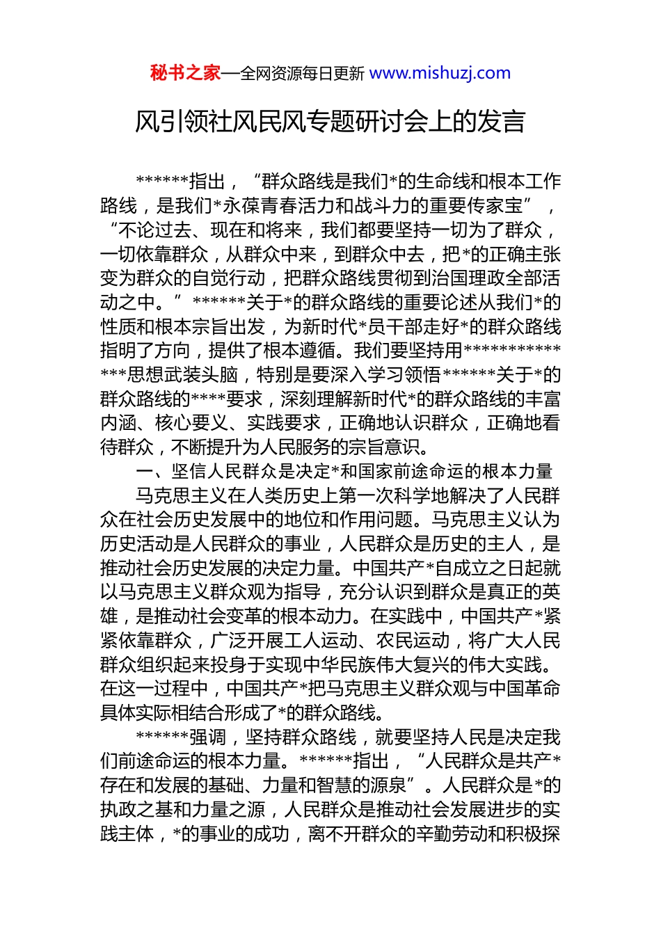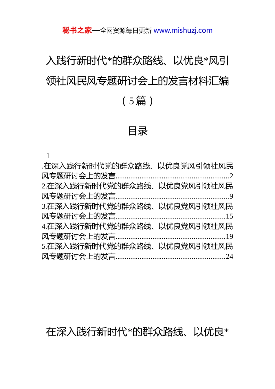秘书之家—全网资源每日更新 www.mishuzj.com入践行新时代*的群众路线、以优良*风引领社风民风专题研讨会上的发言材料汇编(5 篇)目录1.在深入践行新时代党的群众路线、以优良党风引领社风民风专题研讨会上的发言.............................................................22.在深入践行新时代党的群众路线、以优良党风引领社风民风专题研讨会上的发言.............................................................93.在深入践行新时代党的群众路线、以优良党风引领社风民风专题研讨会上的发言...........................................................154.在深入践行新时代党的群众路线、以优良党风引领社风民风专题研讨会上的发言...........................................................195.在深入践行新时代党的群众路线、以优良党风引领社风民风专题研讨会上的发言...........................................................24在深入践行新时代*的群众路线、以优良*秘书之家—全网资源每日更新 www.mishuzj.com风引领社风民风专题研讨会上的发言******指出,“群众路线是我们*的生命线和根本工作路线,是我们*永葆青春活力和战斗力的重要传家宝”,“不论过去、现在和将来,我们都要坚持一切为了群众,一切依靠群众,从群众中来,到群众中去,把*的正确主张变为群众的自觉行动,把群众路线贯彻到治国理政全部活动之中。”******关于*的群众路线的重要论述从我们*的性质和根本宗旨出发,为新时代*员干部走好*的群众路线指明了方向,提供了根本遵循。我们要坚持用**************思想武装头脑,特别是要深入学习领悟******关于*的群众路线的****要求,深刻理解新时代*的群众路线的丰富内涵、核心要义、实践要求,正确地认识群众,正确地看待群众,不断提升为人民服务的宗旨意识。一、坚信人民群众是决定*和国家前途命运的根本力量马克思主义在人类历史上第一次科学地解决了人民群众在社会历史发展中的地位和作用问题。马克思主义认为历史活动是人民群众的事业,人民群众是历史的主人,是推动社会历史发展的决定力量。中国共产*自成立之日起就以马克思主义群众观为指导,充分认识到群众是真正的英雄,是推动社会变革的根本动力。在实践中,中国共产*紧紧依靠群众,广泛开展工人运动、农民运动,将广大人民群众组织起来投身于实现中华民族伟大复兴的伟大实践。在这一过程中,中国共产*把马克思主义群众观与中国革命具体实际相结合形成了*的群众路线。******强调,坚持群众路线,就要坚持人民是决定我们前途命运的根本力量。******指出,“人民群众是共产*存在和发展的基础、力量和智慧的源泉”。人民群众是*的执政之基和力量之源,人民群众是推动社会发展进步的实践主体,*的事业的成功,离不开群众的辛勤劳动和积极探秘书之家—全网资源每日更新 www.mishuzj.com索,只有尊重群众实践,鼓励群众的实践创造,激发群众的积极性、主动性和创造性,才能实现中华民族伟大复兴新民主主义革命时期,在广大人民群众的支持下,中国共产*不断发展壮大,取得了革命的胜利。正如******所指出的,辽沈战役胜利是东北人民全力支援拼出来的,淮海战役胜利是老百姓用小车推出来的,渡江战役胜利是老百姓用小船划出来的。******反复强调:“离开了人民,我们就会一事无成。”“人民是共和国的坚实根基,人民是我们执政的最大底气。”面向未来,我们必须坚持同人民在一起,我们要紧紧依靠人民,充分发挥人民主体作用,尊重人民首创精神,为了人民干事创业,依靠人民干事创业。二、把人民利益摆在至高无上的位置坚持人民利益至上既是由*的性质宗旨决定的,也是由*的初心使命决定的。中国共产*没有自己的特殊私利,自成立之日起就始终把人民利益作为最高价值标准。*经过一百多年的奋斗,团结带领人民群众从站起来到富起来、再到强起来,充分体现了中国共产*人为国为民的高尚情怀。新时代走好*的群众路线,就要坚持一切为了人民,以实现人民利益为最高价值追求。坚持人民利益至上,把实现好、维护好、发展好最广大人民群众的根本利益作为一切工作的出发点和落脚点。******多次...