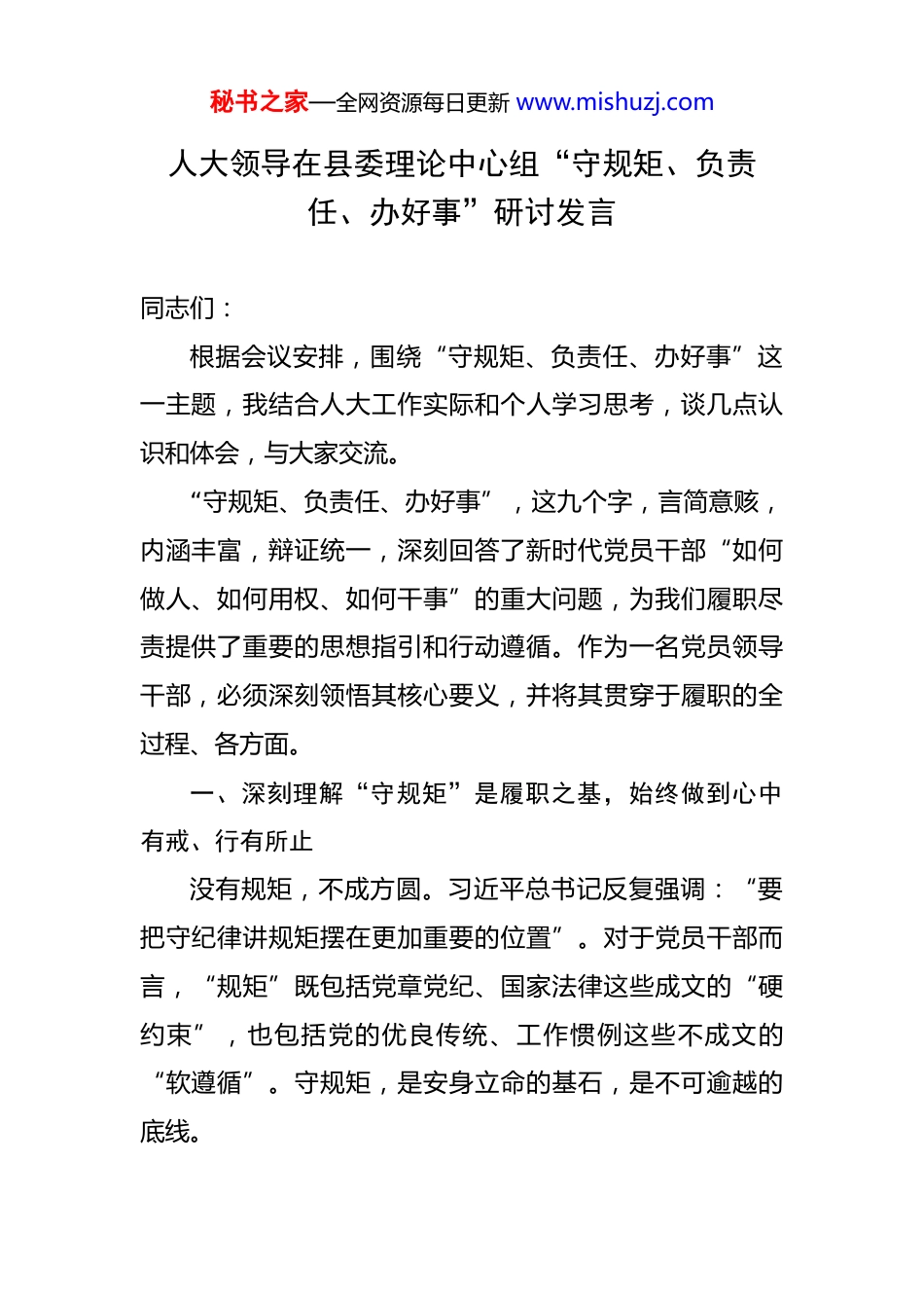 秘书之家—全网资源每日更新 www.mishuzj.com人大领导在县委理论中心组“守规矩、负责任、办好事”研讨发言 同志们:根据会议安排,围绕“守规矩、负责任、办好事”这一主题,我结合人大工作实际和个人学习思考,谈几点认识和体会,与大家交流。“守规矩、负责任、办好事”,这九个字,言简意赅,内涵丰富,辩证统一,深刻回答了新时代党员干部“如何做人、如何用权、如何干事”的重大问题,为我们履职尽责提供了重要的思想指引和行动遵循。作为一名党员领导干部,必须深刻领悟其核心要义,并将其贯穿于履职的全过程、各方面。一、深刻理解“守规矩”是履职之基,始终做到心中有戒、行有所止没有规矩,不成方圆。习近平总书记反复强调:“要把守纪律讲规矩摆在更加重要的位置”。对于党员干部而言,“规矩”既包括党章党纪、国家法律这些成文的“硬约束”,也包括党的优良传统、工作惯例这些不成文的“软遵循”。守规矩,是安身立命的基石,是不可逾越的底线。秘书之家—全网资源每日更新 www.mishuzj.com(一)要把政治规矩挺在前面。最大的规矩就是政治规矩。作为人大干部,更要旗帜鲜明讲政治。要深刻领悟“两个确立”的决定性意义,坚决做到“两个维护”,始终在思想上政治上行动上同以习近平同志为核心的党中央保持高度一致。要坚持党对人大工作的全面领导,严格执行重大事项向县委请示报告制度,确保人大工作始终在县委的领导下,围绕中心、服务大局,依法有序开展。绝不能把依法履职同党的领导对立起来,更不能打着“代表人民”的旗号,挑战党的领导。(二)要把法律规矩刻在心中。人大是国家权力机关,也是法律实施的监督机关,必须带头尊法学法守法用法。要牢固树立法治思维,坚持依法办事、依规用权,严格按照法定权限、法定程序行使职权。无论是开展监督工作,还是作出决议决定,都要于法有据,确保每一项工作都经得起法律和历史的检验。要善于运用法治方式破解发展难题、化解社会矛盾,推动全社会形成办事依法、遇事找法、解决问题用法、化解矛盾靠法的良好氛围。(三)要把纪律规矩融入日常。要时刻绷紧廉洁自律这根弦,带头严格遵守中央八项规定及其实施细则精神,知敬畏、存戒惧、守底线。要注重家风建设,管好自己、管好家人、管好身边人。要净化自己的“生活圈”“社交秘书之家—全网资源每日更新 www.mishuzj.com圈”,自觉抵制各种诱惑,做到清清白白做人、干干净净做事,永葆共产党员的政治本色。二、深刻理解“负责任”是履职之要,始终做到心中有责、敢于担当干部干部,干是当头的。负责任,体现的是担当精神,是党性觉悟。习近平总书记指出:“看一个领导干部,很重要的是看有没有责任感,有没有担当精神。”有多大担当才能干多大事业,尽多大责任才会有多大成就。(一)要在服务发展大局中负责任。人大工作不是“二线”,而是服务发展、保障善治的“一线”。要紧紧围绕县委中心工作,找准人大履职的切入点和着力点。要聚焦全县经济社会发展的重大问题、改革攻坚的难点问题、人民群众关心的热点问题,深入开展调查研究,通过视察、调研、执法检查等方式,提出有针对性、可操作性的意见建议,以高质量的监督助推县委决策部署落地落实。要依法行使好重大事项决定权和人事任免权,把党的主张通过法定程序转变为全县人民的共同意志和自觉行动。(二)要在维护群众利益中负责任。人民代表大会制度的根基在人民、血脉在人民。我们要始终坚持以人民为中心,把维护好、实现好、发展好最广大人民的根本利益秘书之家—全网资源每日更新 www.mishuzj.com作为人大一切工作的出发点和落脚点。要密切同人大代表和人民群众的联系,健全“家、站、点”履职平台,畅通民意表达渠道,倾听群众呼声,反映群众意愿。对群众反映强烈的急难愁盼问题,要敢于监督、善于监督,督促“一府一委两院”切实加以解决,让人-民群众感受到公平正义就在身边。(三)要在加强自身建设中负责任。作为人大常委会的组成人员,要不断加强学习,努力成为人大工作的“行家里手”。要带头改进作风,大兴调查研究之风,扑下身子、沉到一线,掌握第一手情况。要充分发挥表率作用,带动机关全体干...