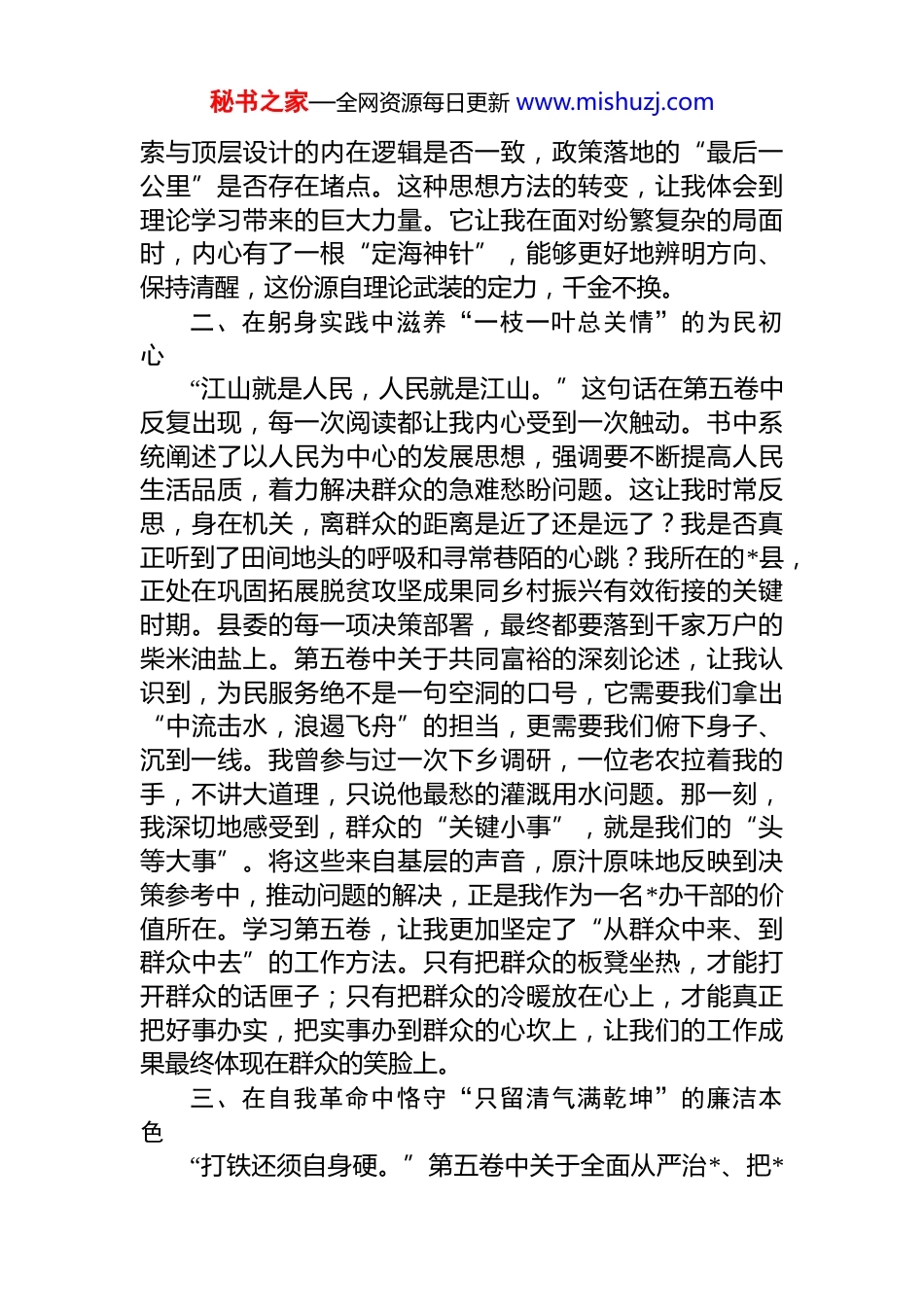秘书之家—全网资源每日更新 www.mishuzj.com县委办公室干部关于学习体会发言同志们:大家好。根据安排,我就学习《***谈治国理政》第五卷作个发言。与其说是发言,不如说是一次学习过程中的个人感悟与反思。作为一名在县委办公室工作的干部,每天接触大量的文稿、信息和指令,有时会不自觉地陷入事务主义的窠臼,对理论学习的重要性与紧迫性感受尤为深刻。捧读《***谈治国理政》第五卷这部沉甸甸的著作,我深切感受到,这不仅是案头常备的工具书,更是滋养精神启迪智慧、校准方向的“心学”宝典。下面,我从个人角度,谈三点粗浅的体会。一、在深学细悟中淬炼“风雨不动安如山”的政治定力《***谈治国理政》第五卷开篇便是*的二十大报告,系统擘画了新时代新征程的宏伟蓝图,读来令人心潮澎湃也让我对自己肩头的责任有了更清醒的认识。书中强调,中国共产*领导是中国式现代化的本质要求,这让我深刻反思,作为一名*办干部,最根本的“定力”源自何处?它源于对“两个确立”决定性意义的深刻领悟,源于对*的创新理论的真学真信。我时常自问,在日常繁杂的工作中,是否真正做到了从政治上看问题、办事情?在处理一件具体的事务时,是仅仅停留在“办结”层面,还是能够思考其背后的政治考量与深远影响?第五卷的学习,像一场及时的思想洗礼,让我跳出“文来文往”的局限,开始学着用系统观念和战略眼光去审视工作。比如,在参与草拟一份关于我县乡村振兴的材料时,我不再仅仅是整合各部门的数据和汇报,而是会对照书中关于产业、人才、文化、生态、组织“五个振兴”的系统论述,去思考我县的实践探秘书之家—全网资源每日更新 www.mishuzj.com索与顶层设计的内在逻辑是否一致,政策落地的“最后一公里”是否存在堵点。这种思想方法的转变,让我体会到理论学习带来的巨大力量。它让我在面对纷繁复杂的局面时,内心有了一根“定海神针”,能够更好地辨明方向、保持清醒,这份源自理论武装的定力,千金不换。二、在躬身实践中滋养“一枝一叶总关情”的为民初心“江山就是人民,人民就是江山。”这句话在第五卷中反复出现,每一次阅读都让我内心受到一次触动。书中系统阐述了以人民为中心的发展思想,强调要不断提高人民生活品质,着力解决群众的急难愁盼问题。这让我时常反思,身在机关,离群众的距离是近了还是远了?我是否真正听到了田间地头的呼吸和寻常巷陌的心跳?我所在的*县,正处在巩固拓展脱贫攻坚成果同乡村振兴有效衔接的关键时期。县委的每一项决策部署,最终都要落到千家万户的柴米油盐上。第五卷中关于共同富裕的深刻论述,让我认识到,为民服务绝不是一句空洞的口号,它需要我们拿出“中流击水,浪遏飞舟”的担当,更需要我们俯下身子、沉到一线。我曾参与过一次下乡调研,一位老农拉着我的手,不讲大道理,只说他最愁的灌溉用水问题。那一刻,我深切地感受到,群众的“关键小事”,就是我们的“头等大事”。将这些来自基层的声音,原汁原味地反映到决策参考中,推动问题的解决,正是我作为一名*办干部的价值所在。学习第五卷,让我更加坚定了“从群众中来、到群众中去”的工作方法。只有把群众的板凳坐热,才能打开群众的话匣子;只有把群众的冷暖放在心上,才能真正把好事办实,把实事办到群众的心坎上,让我们的工作成果最终体现在群众的笑脸上。三、在自我革命中恪守“只留清气满乾坤”的廉洁本色“打铁还须自身硬。”第五卷中关于全面从严治*、把*秘书之家—全网资源每日更新 www.mishuzj.com的自我革命进行到底的论述,字字千钧,振聋发聩。作为身处中枢机关的干部,一言一行都备受关注,更应当时刻保持如履薄冰的警醒。书中一个个反面案例的深刻剖析,一句句“常怀远虑、居安思危”的谆谆告诫,对我而言,既是警示,更是保护。我深刻地认识到,自我革命不是一时一事的要求,而是一生的修行。它要求我敢于“刀刃向内”,勇于“揭短亮丑”。在日常工作中,我是否因为追求效率而简化了程序?在人情往来中,我是否守住了原则和底线?在独处无人时,我是否做到了心存敬畏、行有所止?这些问题,都需要在学习中不断反思、在实践中时时检视。第五卷为我们加强作风建设...