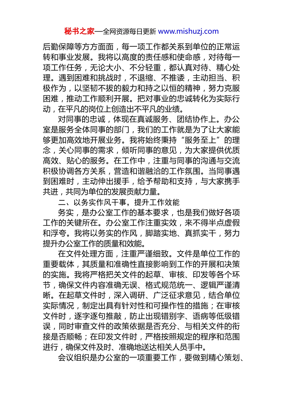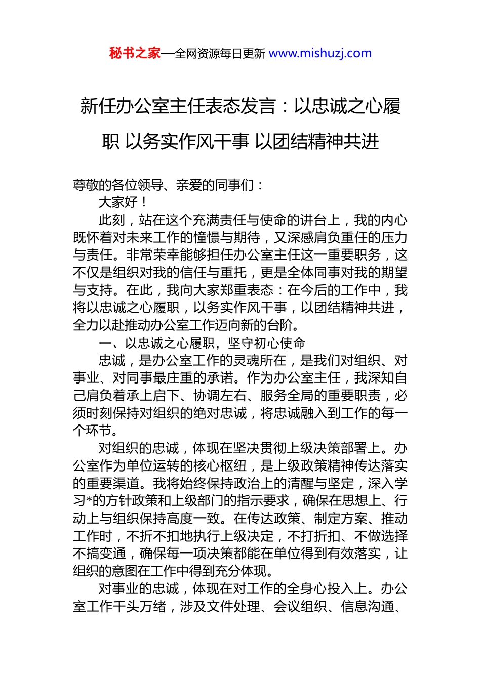秘书之家—全网资源每日更新 www.mishuzj.com新任办公室主任表态发言:以忠诚之心履职 以务实作风干事 以团结精神共进尊敬的各位领导、亲爱的同事们:大家好!此刻,站在这个充满责任与使命的讲台上,我的内心既怀着对未来工作的憧憬与期待,又深感肩负重任的压力与责任。非常荣幸能够担任办公室主任这一重要职务,这不仅是组织对我的信任与重托,更是全体同事对我的期望与支持。在此,我向大家郑重表态:在今后的工作中,我将以忠诚之心履职,以务实作风干事,以团结精神共进,全力以赴推动办公室工作迈向新的台阶。一、以忠诚之心履职,坚守初心使命忠诚,是办公室工作的灵魂所在,是我们对组织、对事业、对同事最庄重的承诺。作为办公室主任,我深知自己肩负着承上启下、协调左右、服务全局的重要职责,必须时刻保持对组织的绝对忠诚,将忠诚融入到工作的每一个环节。对组织的忠诚,体现在坚决贯彻上级决策部署上。办公室作为单位运转的核心枢纽,是上级政策精神传达落实的重要渠道。我将始终保持政治上的清醒与坚定,深入学习*的方针政策和上级部门的指示要求,确保在思想上、行动上与组织保持高度一致。在传达政策、制定方案、推动工作时,不折不扣地执行上级决定,不打折扣、不做选择不搞变通,确保每一项决策都能在单位得到有效落实,让组织的意图在工作中得到充分体现。对事业的忠诚,体现在对工作的全身心投入上。办公室工作千头万绪,涉及文件处理、会议组织、信息沟通、秘书之家—全网资源每日更新 www.mishuzj.com后勤保障等方方面面,每一项工作都关系到单位的正常运转和事业发展。我将以高度的责任感和使命感,对待每一项工作任务,无论大小、不分轻重,都认真对待、精心处理。遇到困难和挑战时,不退缩、不推诿,主动担当、积极作为,以坚韧不拔的毅力和持之以恒的精神,努力克服困难,推动工作顺利开展。把对事业的忠诚转化为实际行动,在平凡的岗位上创造出不平凡的业绩。对同事的忠诚,体现在真诚服务、团结协作上。办公室是服务全体同事的部门,我们的工作就是为了让大家能够更加高效地开展业务。我将始终秉持“服务至上”的理念,关心同事的需求,倾听同事的意见,为大家提供优质高效、贴心的服务。在工作中,注重与同事的沟通与交流积极协调各方关系,营造和谐融洽的工作氛围。当同事遇到困难时,主动伸出援手,给予帮助和支持,与大家携手共进,共同为单位的发展贡献力量。二、以务实作风干事,提升工作效能务实,是办公室工作的基本要求,也是我们做好各项工作的关键所在。办公室工作注重实效,来不得半点虚假和浮夸。我将以务实的作风,脚踏实地、真抓实干,努力提升办公室工作的质量和效能。在文件处理方面,注重严谨细致。文件是单位工作的重要载体,其质量和准确性直接影响到工作的开展和决策的实施。我将严格把关文件的起草、审核、印发等各个环节,确保文件内容准确无误、格式规范统一、逻辑严谨清晰。在起草文件时,深入调研、广泛征求意见,结合单位实际情况,制定出具有针对性和可操作性的措施;在审核文件时,逐字逐句推敲,防止出现错别字、语病等低级错误,同时审查文件的政策依据是否充分、与相关文件的衔接是否顺畅;在印发文件时,严格按照规定的程序和范围进行,确保文件及时、准确地送达相关人员手中。会议组织是办公室的一项重要工作,要做到精心策划、秘书之家—全网资源每日更新 www.mishuzj.com高效组织。会议是传达上级精神、部署工作任务、交流工作经验的重要平台,其组织水平直接影响到会议的效果。在会议组织过程中,我将提前做好各项准备工作,包括确定会议主题、议程、时间、地点,准备会议资料,通知参会人员等。在会议进行中,做好会议记录和服务工作,确保会议秩序井然、讨论充分。会议结束后,及时整理会议纪要,跟进会议决议的落实情况,建立会议决议督办机制定期检查工作进展,确保会议精神得到有效贯彻,各项工作按时完成。信息工作是办公室了解情况、掌握动态、辅助决策的重要手段。要加强信息的收集、整理和分析工作,建立畅通的信息渠道。一方面,主动与各部门沟通联系,及时获取第一手资料,确保信息的真实性和...