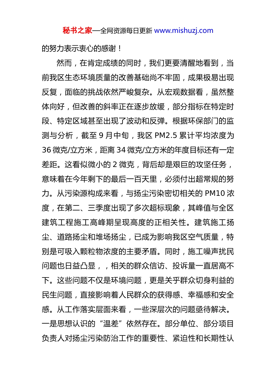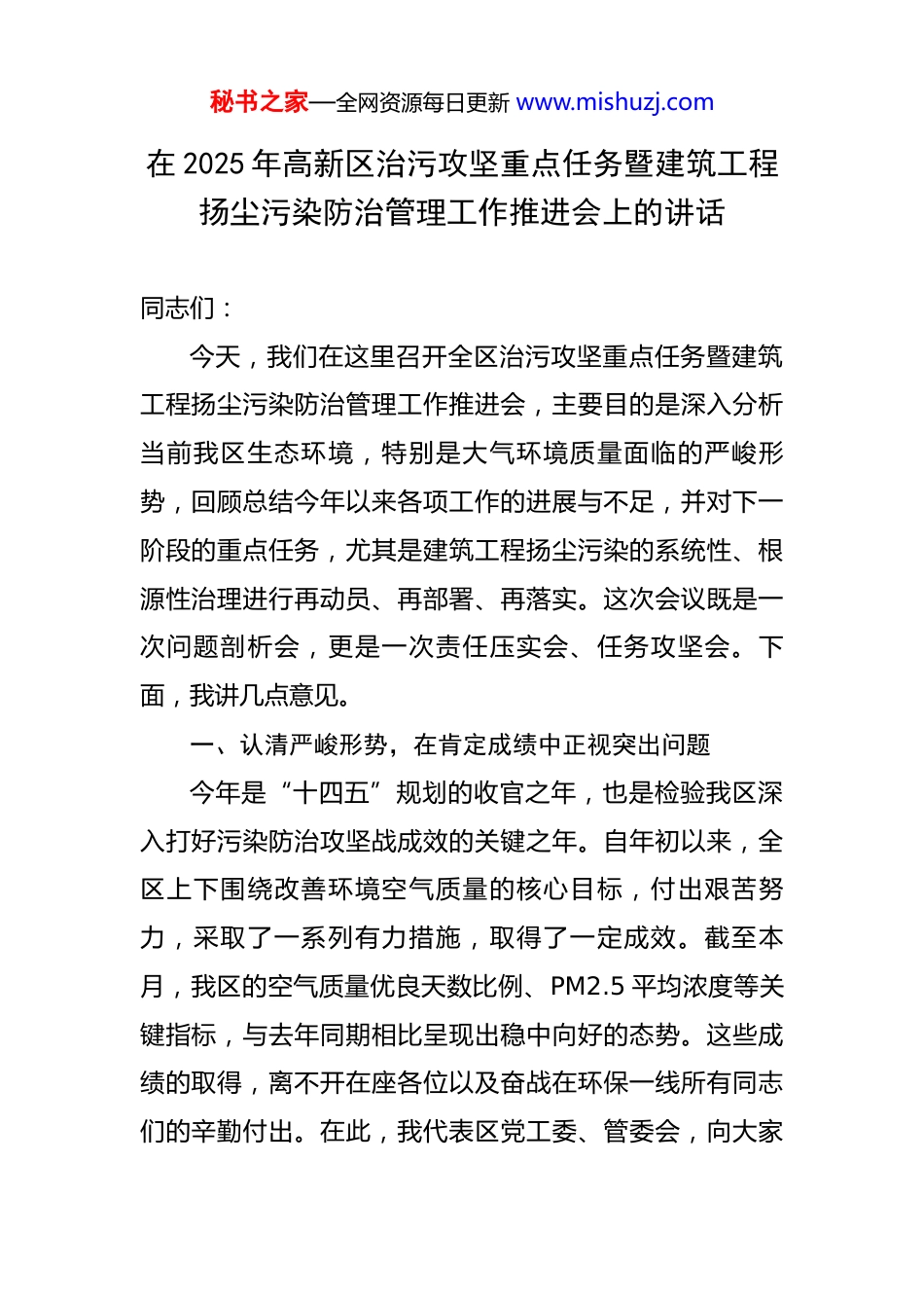 秘书之家—全网资源每日更新 www.mishuzj.com在 2025 年高新区治污攻坚重点任务暨建筑工程扬尘污染防治管理工作推进会上的讲话 同志们:今天,我们在这里召开全区治污攻坚重点任务暨建筑工程扬尘污染防治管理工作推进会,主要目的是深入分析当前我区生态环境,特别是大气环境质量面临的严峻形势,回顾总结今年以来各项工作的进展与不足,并对下一阶段的重点任务,尤其是建筑工程扬尘污染的系统性、根源性治理进行再动员、再部署、再落实。这次会议既是一次问题剖析会,更是一次责任压实会、任务攻坚会。下面,我讲几点意见。一、认清严峻形势,在肯定成绩中正视突出问题今年是“十四五”规划的收官之年,也是检验我区深入打好污染防治攻坚战成效的关键之年。自年初以来,全区上下围绕改善环境空气质量的核心目标,付出艰苦努力,采取了一系列有力措施,取得了一定成效。截至本月,我区的空气质量优良天数比例、PM2.5 平均浓度等关键指标,与去年同期相比呈现出稳中向好的态势。这些成绩的取得,离不开在座各位以及奋战在环保一线所有同志们的辛勤付出。在此,我代表区党工委、管委会,向大家秘书之家—全网资源每日更新 www.mishuzj.com的努力表示衷心的感谢!然而,在肯定成绩的同时,我们更要清醒地看到,当前我区生态环境质量的改善基础尚不牢固,成果极易出现反复,面临的挑战依然严峻复杂。从宏观数据看,虽然整体向好,但改善的斜率正在逐步放缓,部分指标在特定时段、特定区域甚至出现了波动和反弹。根据环保部门的监测与分析,截至 9 月中旬,我区 PM2.5 累计平均浓度为36 微克/立方米,距离 34 微克/立方米的年度目标还有一定差距。这看似微小的 2 微克,背后却是艰巨的攻坚任务,意味着在今年剩下的最后一百天里,必须付出超常规的努力。从污染源构成来看,与扬尘污染密切相关的 PM10 浓度,在第二、三季度出现了多次超标现象,其峰值与全区建筑工程施工高峰期呈现高度的正相关性。建筑施工扬尘、道路扬尘和堆场扬尘,已成为影响我区空气质量,特别是可吸入颗粒物浓度的主要矛盾。同时,施工噪声扰民问题也日益凸显,,相关的群众信访、投诉量一直居高不下。这些问题不仅是环境问题,更是关乎群众切身利益的民生问题,直接影响着人民群众的获得感、幸福感和安全感。从工作落实层面来看,一些深层次的问题亟待解决。一是思想认识的“温差”依然存在。部分单位、部分项目负责人对扬尘污染防治工作的重要性、紧迫性和长期性认秘书之家—全网资源每日更新 www.mishuzj.com识不足,存在“说起来重要、做起来次要、忙起来不要”的现象。有的认为抓环保会影响施工进度、增加生产成本,存在消极应付、被动整改的心态;有的则产生了“歇歇脚、松口气”的懈怠情绪,认为前期工作已经做得差不多了,导致工作标准下降、监管力度减弱。二是责任落实的“偏差”依然存在。一些项目建设单位主体责任悬空,对施工单位的扬尘管控要求不严、监督不力;施工单位现场管理粗放,降尘措施“有名无实”,搞形式主义、做表面文章;监理单位履职尽责不到位,对违规行为“睁一只眼闭一只眼”,未能发挥应有的监督“前哨”作用。责任链条的层层衰减,导致各项制度规定在“最后一公里”落空。三是监管执法的“落差”依然存在。虽然我们建立了巡查机制,但日常监管的广度和深度还有待加强,未能实现全覆盖、全时段、无死角。执法手段相对单一,对违法违规行为的震慑力不足,存在“以罚代管”、屡罚屡犯的现象。特别是对于一些技术性、隐蔽性的违规行为,发现难、取证难、处罚难的问题依然突出。这些问题,归根结底是政治站位问题、发展理念问题、工作作风问题。全区上下必须深刻认识到,生态环境保护是“国之大者”,是不可逾越的红线、底线和高压线。我们必须彻底摒弃任何麻痹思想、侥幸心理和松劲心态,以“逆水行舟、不进则秘书之家—全网资源每日更新 www.mishuzj.com退”的危机感和“时时放心不下”的责任感,坚决把思想和行动统一到党中央和省委、市委的决策部署上来,以壮士断腕的决心、背水一战的勇气,坚决打赢这场治污攻坚战。二、深化思想认识,在对标对表中压实各方责任...