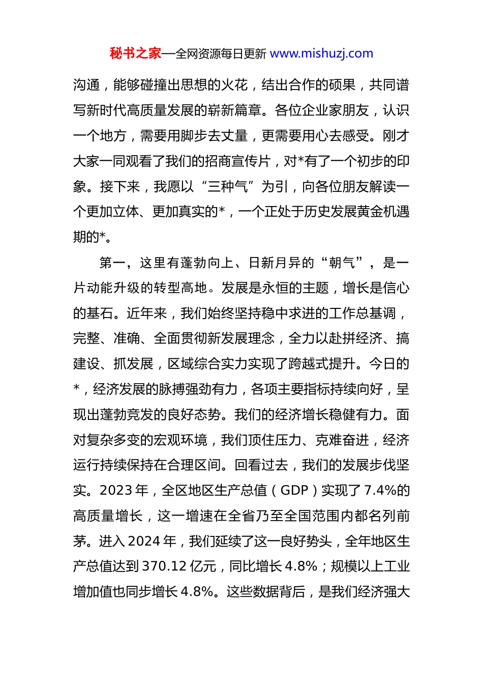 秘书之家—全网资源每日更新 www.mishuzj.com在 2025 年全区青年企业家协会“双招双引”座谈会上的讲话 尊敬的各位青年企业家朋友,同志们:大家下午好!金秋九月,丹桂飘香。在这个充满希望与收获的美好季节,我们满怀喜悦地迎来了来自*的青年才俊和商界精英。首先,我谨代表*区委、区人大、区政府、区政协以及全区百万热情好客的人民,对各位青年企业家的到来表示最热烈的欢迎!对长期以来关心和支持*发展的各位朋友,表示最衷心的感谢!今天,我们在此共同举办*区与*青年企业家协会的“双招双引”座谈会,这不仅是一次深化友谊的座谈,更是一场共谋发展的盛会。*与*,虽然地理上相隔,但我们的人缘相亲、商缘相连,尤其是在深度融入*三角一体化发展的国家战略背景下,我们的交流合作日趋紧密,互动往来愈加频繁。各位青年企业家是*经济社会发展中最具活力、最具潜力的中坚力量,你们身上所展现出的敢为人先的创新精神、坚韧不拔的奋斗品质,正是我们这个时代最为宝贵的财富。我们深知,区域的未来在于产业,产业的希望在于企业,而企业的活力源泉,就在于像在座各位一样富有远见和实干精神的企业家。因此,我们格外珍视这次难得的交流机会,期盼通过坦诚的秘书之家—全网资源每日更新 www.mishuzj.com沟通,能够碰撞出思想的火花,结出合作的硕果,共同谱写新时代高质量发展的崭新篇章。各位企业家朋友,认识一个地方,需要用脚步去丈量,更需要用心去感受。刚才大家一同观看了我们的招商宣传片,对*有了一个初步的印象。接下来,我愿以“三种气”为引,向各位朋友解读一个更加立体、更加真实的*,一个正处于历史发展黄金机遇期的*。第一,这里有蓬勃向上、日新月异的“朝气”,是一片动能升级的转型高地。发展是永恒的主题,增长是信心的基石。近年来,我们始终坚持稳中求进的工作总基调,完整、准确、全面贯彻新发展理念,全力以赴拼经济、搞建设、抓发展,区域综合实力实现了跨越式提升。今日的*,经济发展的脉搏强劲有力,各项主要指标持续向好,呈现出蓬勃竞发的良好态势。我们的经济增长稳健有力。面对复杂多变的宏观环境,我们顶住压力、克难奋进,经济运行持续保持在合理区间。回看过去,我们的发展步伐坚实。2023 年,全区地区生产总值(GDP)实现了 7.4%的高质量增长,这一增速在全省乃至全国范围内都名列前茅。进入 2024 年,我们延续了这一良好势头,全年地区生产总值达到 370.12 亿元,同比增长 4.8%;规模以上工业增加值也同步增长 4.8%。这些数据背后,是我们经济强大秘书之家—全网资源每日更新 www.mishuzj.com的韧性和巨大的潜力。我们的产业结构优化升级。我们坚持把发展的着力点放在实体经济上,大力推进新型工业化。2023 年,全区三次产业结构调整为 6.8:53.8:39.4,第二产业占比超过一半,彰显了我们作为工业强区的坚实基础。去年,我们的规模以上工业营业收入达到 561.6 亿元,同比增长 7.4%,利润总额更是实现了 37.7%的强劲增长。这充分说明,我们的工业经济不仅有“量”的合理增长,更有“质”的有效提升,发展的“含金量”和“含新量”显著增强。我们的投资活力持续迸发。投资是拉动经济增长最直接、最有效的动力。我们始终把项目建设作为经济工作的“生命线”,全区上下形成了大抓项目、抓大项目的浓厚氛围。2023 年,我区固定资产投资增速达到了惊人的 59.7%,展现了各类市场主体对*发展前景的强烈信心。2024 年,全区固定资产投资总额达到 136.4 亿元,继续保持了 11.5%的两位数增长。源源不断地投资,正在为*未来的高质量发展积蓄强大后劲。可以说,当下的*,正处于开放红利的集中释放期、新旧动能的加速转型期,选择*,就是选择了与趋势同行,与成长同步。第二,这里有特色鲜明、集群发展的“底气”,是一片投资兴业的黄金宝地。一个地区的发展,必须有明确的产业方向和坚实的产业支撑。我们立足自身资源禀赋和产秘书之家—全网资源每日更新 www.mishuzj.com业基础,坚持“工业挂帅、项目为王”不动摇,聚焦主导产业,培育新兴产业,全力构建具有*特色和优势的现代化产业体系。我们聚焦三大主导产业,打造“产业航...