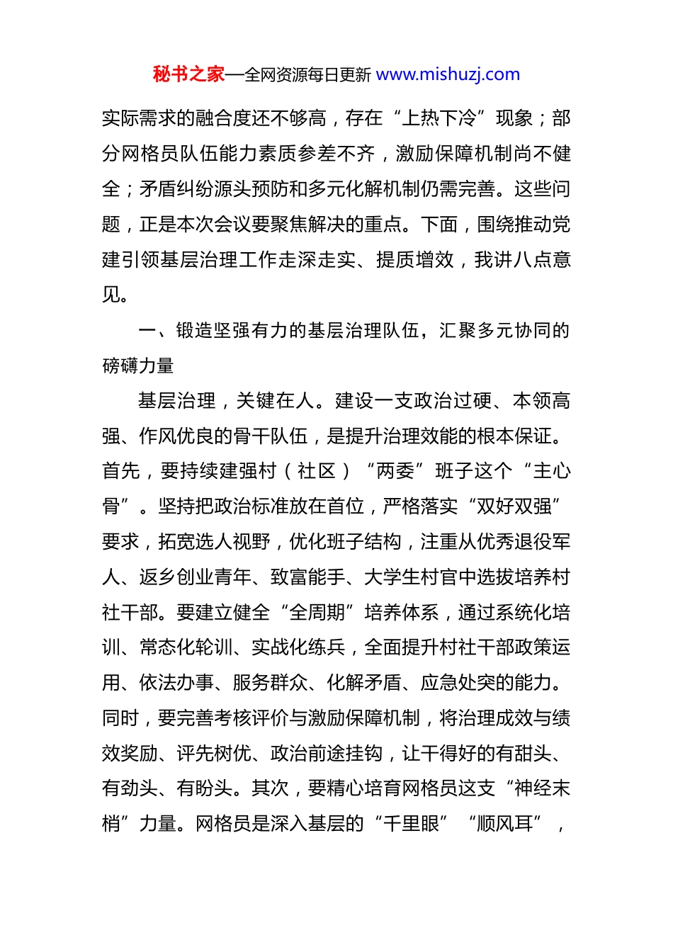 秘书之家—全网资源每日更新 www.mishuzj.com在 2025 年全市党建引领基层高效能治理现场会上的讲话 同志们:今天,我们在此召开全市党建引领基层高效能治理现场会,主要任务是深入学习贯彻习近平总书记关于基层治理的重要论述,全面落实省委与上级市委关于党建引领基层治理的系列部署要求,总结交流经验,分析研判形势,对下一阶段工作进行再动员、再部署。会前,大家实地观摩了*街道*村、市综治中心以及*街道*社区等几个不同类型的治理示范点,看到了鲜活的实践和创新的成果,相信都很有感触,也深受启发。今年以来,全市上下认真贯彻落实中央及省、市决策部署,围绕加强“五基四化”建设,深化运用“党建+网格+大数据”治理模式,在组织体系、队伍建设、平台赋能、机制创新等方面取得了显著的阶段性成效,为全市经济社会高质量发展提供了有力的基础支撑。但同时,必须清醒地认识到,基层治理是一项系统性、长期性工程,不可能一蹴而就,更不能有丝毫松懈。面对新形势、新任务、新挑战,工作中存在的短板和弱项依然不容忽视。部分地区党组织领导核心作用发挥还不够充分,治理资源统筹力度有待加强;数字治理平台与秘书之家—全网资源每日更新 www.mishuzj.com实际需求的融合度还不够高,存在“上热下冷”现象;部分网格员队伍能力素质参差不齐,激励保障机制尚不健全;矛盾纠纷源头预防和多元化解机制仍需完善。这些问题,正是本次会议要聚焦解决的重点。下面,围绕推动党建引领基层治理工作走深走实、提质增效,我讲八点意见。一、锻造坚强有力的基层治理队伍,汇聚多元协同的磅礴力量基层治理,关键在人。建设一支政治过硬、本领高强、作风优良的骨干队伍,是提升治理效能的根本保证。首先,要持续建强村(社区)“两委”班子这个“主心骨”。坚持把政治标准放在首位,严格落实“双好双强”要求,拓宽选人视野,优化班子结构,注重从优秀退役军人、返乡创业青年、致富能手、大学生村官中选拔培养村社干部。要建立健全“全周期”培养体系,通过系统化培训、常态化轮训、实战化练兵,全面提升村社干部政策运用、依法办事、服务群众、化解矛盾、应急处突的能力。同时,要完善考核评价与激励保障机制,将治理成效与绩效奖励、评先树优、政治前途挂钩,让干得好的有甜头、有劲头、有盼头。其次,要精心培育网格员这支“神经末梢”力量。网格员是深入基层的“千里眼”“顺风耳”,秘书之家—全网资源每日更新 www.mishuzj.com是感知社会脉搏的前哨。必须加强对网格员队伍的专业化、规范化管理。要明确准入标准,通过公开招聘、择优推荐等方式,吸纳责任心强、群众基础好、熟悉社区情况的人员加入。要强化赋能培训,围绕信息采集、民情走访、矛盾调解、政策宣传、安全排查等核心职责,定期开展业务培训和技能竞赛,使其成为“一员多能”的基层治理多面手。要落实关心关爱,健全薪酬待遇动态调整机制,畅通职业发展通道,解决其实际困难,增强其职业归属感和荣誉感。再次,要有效引导机关干部下沉这股“攻坚力量”。推动机关企事业单位干部资源下沉到网格、到社区,不是简单的“物理叠加”,而是要产生“化学反应”。要建立常态化、制度化的下沉机制,明确下沉干部的职责任务,推动其深度参与社区建设、服务群众需求、破解治理难题。要变“被动下沉”为“主动融入”,引导下沉干部发挥自身在政策、资源、专业等方面的优势,帮助基层链接资源、出谋划策,成为基层党组织的得力助手,而不是“旁观者”。最后,要广泛发动党员群众志愿服务这支“生力军”。基层治理离不开人民群众的广泛参与。要依托新时代文明实践中心(所、站),健全党员“双报到”和志愿服务积分激励等制度,搭建形式多样的志愿服务平台。要根据群众需求和志愿者特长,精心设计秘书之家—全网资源每日更新 www.mishuzj.com服务项目,组建政策宣讲、法律援助、环境整治、扶老助残等各类专业化、特色化志愿服务队伍,让党员的先锋模范作用在服务群众中闪光,让群众在参与治理中实现自我价值,形成共建共治共享的生动局面。二、构建高效联动的基层治理平台,激活数字赋能的强大引擎数字化浪潮为基层治理现代化提供了...