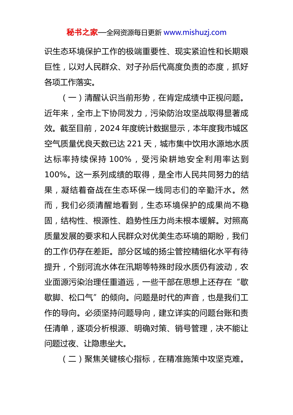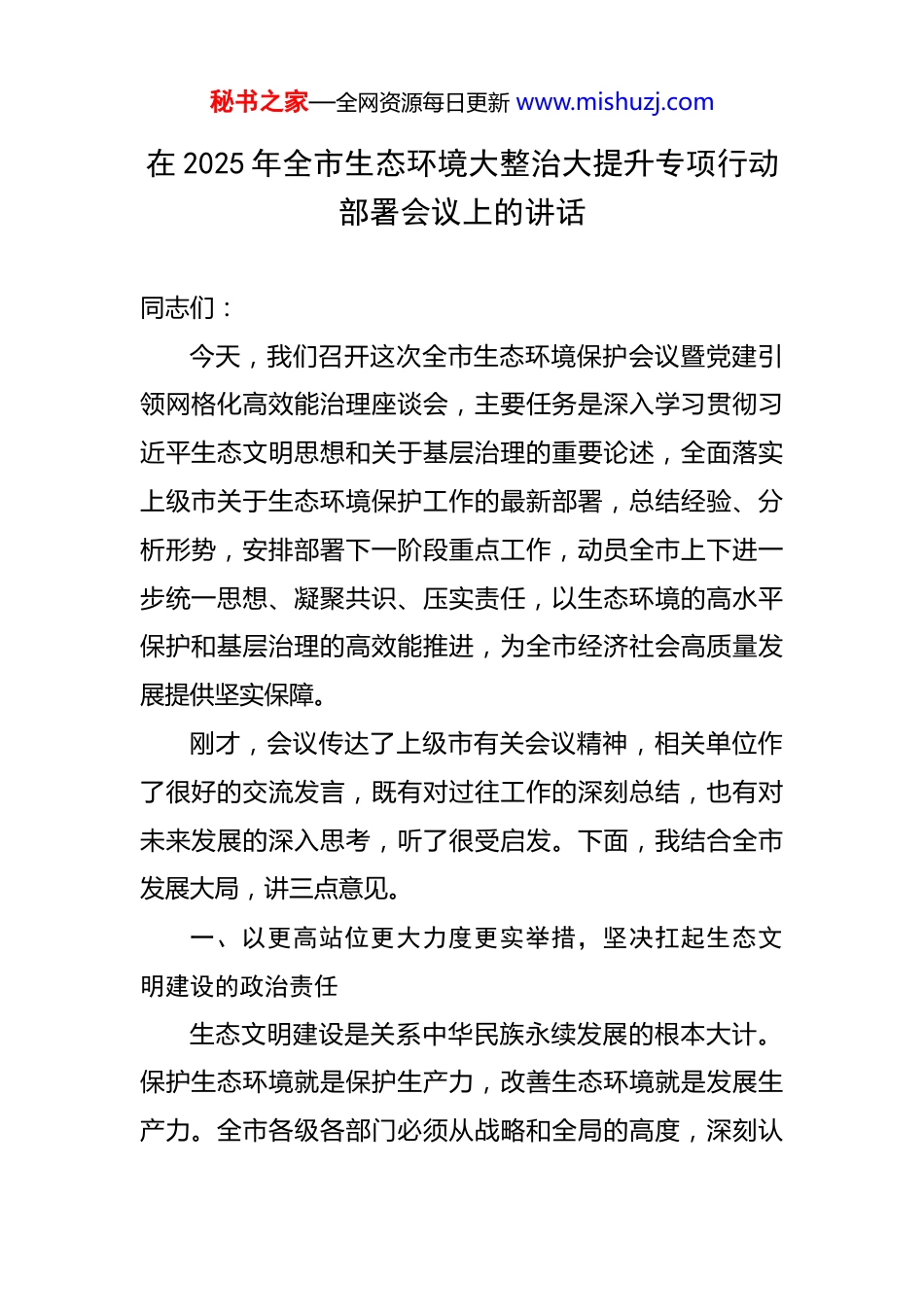 秘书之家—全网资源每日更新 www.mishuzj.com在 2025 年全市生态环境大整治大提升专项行动部署会议上的讲话 同志们:今天,我们召开这次全市生态环境保护会议暨党建引领网格化高效能治理座谈会,主要任务是深入学习贯彻习近平生态文明思想和关于基层治理的重要论述,全面落实上级市关于生态环境保护工作的最新部署,总结经验、分析形势,安排部署下一阶段重点工作,动员全市上下进一步统一思想、凝聚共识、压实责任,以生态环境的高水平保护和基层治理的高效能推进,为全市经济社会高质量发展提供坚实保障。刚才,会议传达了上级市有关会议精神,相关单位作了很好的交流发言,既有对过往工作的深刻总结,也有对未来发展的深入思考,听了很受启发。下面,我结合全市发展大局,讲三点意见。一、以更高站位更大力度更实举措,坚决扛起生态文明建设的政治责任生态文明建设是关系中华民族永续发展的根本大计。保护生态环境就是保护生产力,改善生态环境就是发展生产力。全市各级各部门必须从战略和全局的高度,深刻认秘书之家—全网资源每日更新 www.mishuzj.com识生态环境保护工作的极端重要性、现实紧迫性和长期艰巨性,以对人民群众、对子孙后代高度负责的态度,抓好各项工作落实。(一)清醒认识当前形势,在肯定成绩中正视问题。近年来,全市上下协同发力,污染防治攻坚战取得显著成效。截至目前,2024 年度统计数据显示,本年度我市城区空气质量优良天数已达 221 天,城市集中饮用水源地水质达标率持续保持 100%,受污染耕地安全利用率达到100%。这一系列成绩的取得,是全市人民共同努力的结果,凝结着奋战在生态环保一线同志们的辛勤汗水。然而,我们必须清醒地看到,生态环境保护的成果尚不稳固,结构性、根源性、趋势性压力尚未根本缓解。对照高质量发展的要求和人民群众对优美生态环境的期盼,我们的工作仍存在差距。部分区域的扬尘管控精细化水平有待提升,个别河流水体在汛期等特殊时段水质仍有波动,农业面源污染治理任重道远,一些干部在思想上还存在“歇歇脚、松口气”的倾向。问题是时代的声音,也是我们工作的导向。必须坚持问题导向,建立详实的问题台账和责任清单,逐项分析根源、明确对策、销号管理,决不能让问题过夜、让隐患坐大。(二)聚焦关键核心指标,在精准施策中攻坚克难。秘书之家—全网资源每日更新 www.mishuzj.com打好污染防治攻坚战,是一场大仗、硬仗、苦仗,必须抓住主要矛盾和矛盾的主要方面,集中优势兵力,实施定点爆破。要锚定上级市下达的目标任务,持续深入打好蓝天、碧水、净土三大保卫战。在打赢蓝天保卫战方面,要突出一个“控”字。核心是控制各类污染源的排放总量。工业源方面,要持续推进重点行业超低排放改造和挥发性有机物深度治理,对不能稳定达标排放的企业,要坚决依法依规予以整治。移动源方面,要加快公共领域车辆新能源替代步伐,强化非道路移动机械的编码登记和使用监管。面源方面,要全面升级扬尘管控标准,施工工地必须严格落实“六个百分之百”,道路保洁要向“以克论净”的更高标准迈进。根据上级市的总体规划,到 2025 年底,全市 PM2.5 年均浓度要稳定在 35 微克/立方米以下,空气质量优良天数比例力争达到 70%以上,这是硬任务,必须不折不扣完成。在打赢碧水保卫战方面,要突出一个“治”字。根本在于系统治理、全域治理。要巩固提升城市建成区黑臭水体治理成效,严防返黑返臭。要加快补齐乡镇污水处理设施短板,确保农村生活污水治理率稳步提升,力争到明年底达到 75%以上。要强化对*河、*河等重点流域的常态化巡查和水质监测,落实“一河一策”,保障国省控断面水质稳定达标。同时,必须以最高标准、最秘书之家—全网资源每日更新 www.mishuzj.com严举措守护好南水北调生命线,确保“一渠清水永续北送”,饮用水水源地水质达标率必须始终保持在 100%。在打赢净土保卫战方面,要突出一个“防”字。关键在于源头预防、风险管控。要持续巩固提升土壤安全利用水平,受污染耕地安全利用率必须稳定在 100%。要加强对重点行业企业用地土壤污染状况的调查与监管,严防新增土壤污染。要大力推进农业面...