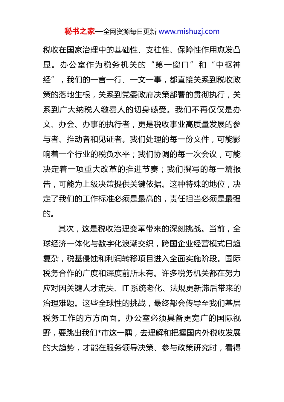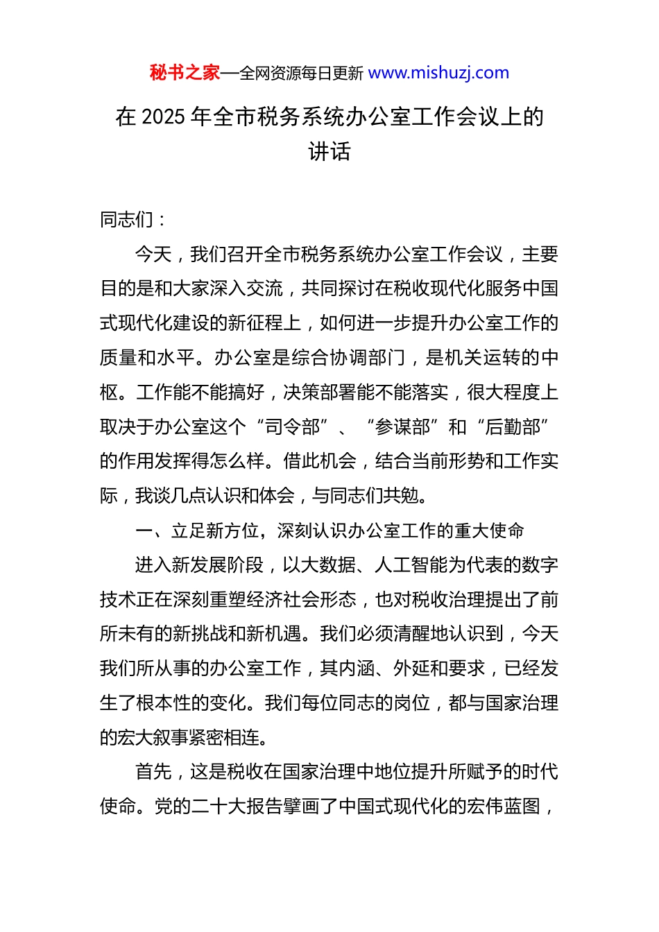 秘书之家—全网资源每日更新 www.mishuzj.com在 2025 年全市税务系统办公室工作会议上的讲话 同志们:今天,我们召开全市税务系统办公室工作会议,主要目的是和大家深入交流,共同探讨在税收现代化服务中国式现代化建设的新征程上,如何进一步提升办公室工作的质量和水平。办公室是综合协调部门,是机关运转的中枢。工作能不能搞好,决策部署能不能落实,很大程度上取决于办公室这个“司令部”、“参谋部”和“后勤部”的作用发挥得怎么样。借此机会,结合当前形势和工作实际,我谈几点认识和体会,与同志们共勉。一、立足新方位,深刻认识办公室工作的重大使命进入新发展阶段,以大数据、人工智能为代表的数字技术正在深刻重塑经济社会形态,也对税收治理提出了前所未有的新挑战和新机遇。我们必须清醒地认识到,今天我们所从事的办公室工作,其内涵、外延和要求,已经发生了根本性的变化。我们每位同志的岗位,都与国家治理的宏大叙事紧密相连。首先,这是税收在国家治理中地位提升所赋予的时代使命。党的二十大报告擘画了中国式现代化的宏伟蓝图,秘书之家—全网资源每日更新 www.mishuzj.com税收在国家治理中的基础性、支柱性、保障性作用愈发凸显。办公室作为税务机关的“第一窗口”和“中枢神经”,我们的一言一行、一文一事,都直接关系到税收政策的落地生根,关系到党委政府决策部署的贯彻执行,关系到广大纳税人缴费人的切身感受。我们不再仅仅是办文、办会、办事的执行者,更是税收事业高质量发展的参与者、推动者和见证者。我们处理的每一份文件,可能影响着一个行业的税负水平;我们协调的每一次会议,可能决定着一项重大改革的推进节奏;我们撰写的每一篇报告,可能为上级决策提供关键依据。这种特殊的地位,决定了我们的工作标准必须是最高的,责任担当必须是最强的。其次,这是税收治理变革带来的深刻挑战。当前,全球经济一体化与数字化浪潮交织,跨国企业经营模式日趋复杂,税基侵蚀和利润转移项目进入全面实施阶段。国际税务合作的广度和深度前所未有。许多税务机关都在努力应对因关键人才流失、IT 系统老化、法规更新滞后带来的治理难题。这些全球性的挑战,最终都会传导至我们基层税务工作的方方面面。办公室必须具备更宽广的国际视野,要跳出我们*市这一隅,去理解和把握国内外税收发展的大趋势,才能在服务领导决策、参与政策研究时,看得秘书之家—全网资源每日更新 www.mishuzj.com更远、想得更深、谋得更实。再者,这是数字化转型浪同带来的重塑机遇。当前,全国税务系统正全面推进“实施数字化转型条件下的税费征管‘强基工程’”。以数治税、智慧税务正在从蓝图变为现实。从“非接触式”办税的全面推行,到数电票的普及应用,再到利用大数据进行风险扫描和智能预警,税收工作的方式正在被颠覆性重构。这对办公室工作提出了全新的要求。过去我们习惯于纸质流转、层层审批的模式,未来将更多地依赖数据驱动、流程再造。办公室系统必须主动拥抱这场变革,争当数字化转型的排头兵和先行者,才能在新的工作体系中找准位置、发挥作用,而不是被动适应甚至被时代淘汰。因此,我们必须把办公室工作放到党和国家事业发展全局、放到税收现代化建设全局中去思考和定位。每一位同志都要深刻认识到肩上的担子之重、责任之大,切实增强做好新时代办公室工作的光荣感、使命感和紧迫感,以“时时放心不下”的责任心,投身于这项平凡而伟大的事业。二、明确新坐标,精准把握办公室工作的职责定位办公室工作的核心要义,可以概括为“服务”二字。具体而言,就是服务决策、服务执行、服务落实。这“三秘书之家—全网资源每日更新 www.mishuzj.com服务”是我们工作的根本遵循和价值标尺。在新的形势下,如何把“三服务”做得更精准、更高效、更有价值,我认为关键要当好“三种角色”。第一,当好服务决策的“高参”。办公室离领导最近,最了解领导的思路和关注点,也最容易接触到全局性的信息。这就决定了我们不能满足于做一个简单的“传声筒”和“收发室”,而必须努力成为领导决策的“思想库”和“智囊团”。要做到“身在兵位,胸为帅谋”。一是要有超前研究的意...